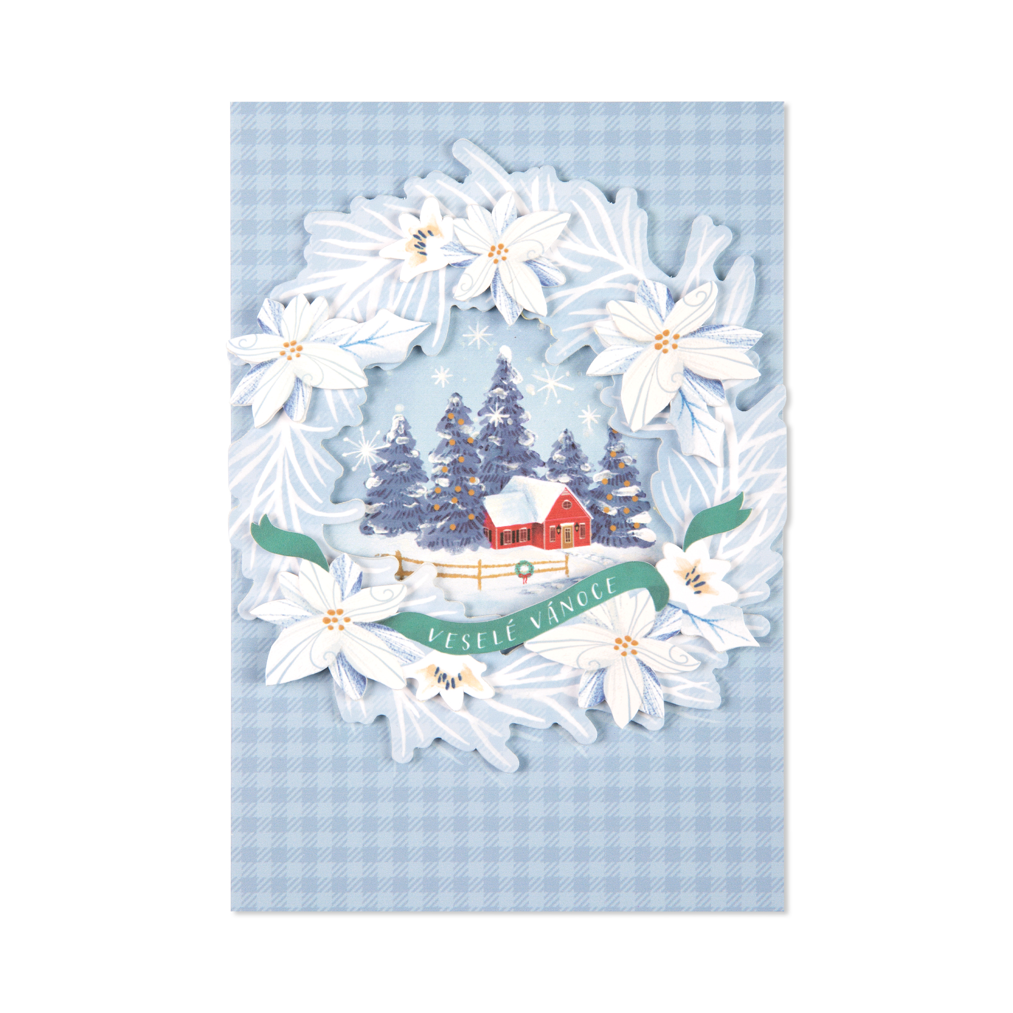 Luxusní vánoční přání s motivem zasněžené chaloupky uprostřed stylizovaného vrstveného 3D věnce nese nápis Veselé Vánoce. Celý výjev je na světle modrém károvaném podkladu. Uvnitř přání pak najdete milé věnování a dostatek prostoru pro dopsání vlastního textu či podpisu. Text uvnitř přání: Ty opravdové dárky nenajdete pod vánočním stromečkem… ty najdete všude okolo… V dětském smíchu, v tvářích svých nejbližších, ve vločkách snášejících se z nebe a ve svém srdci. Krásné a pohodové vánoční svátky přeje… Součástí balení je i červená obálka. Rozměry: 12 × 17,3 cm