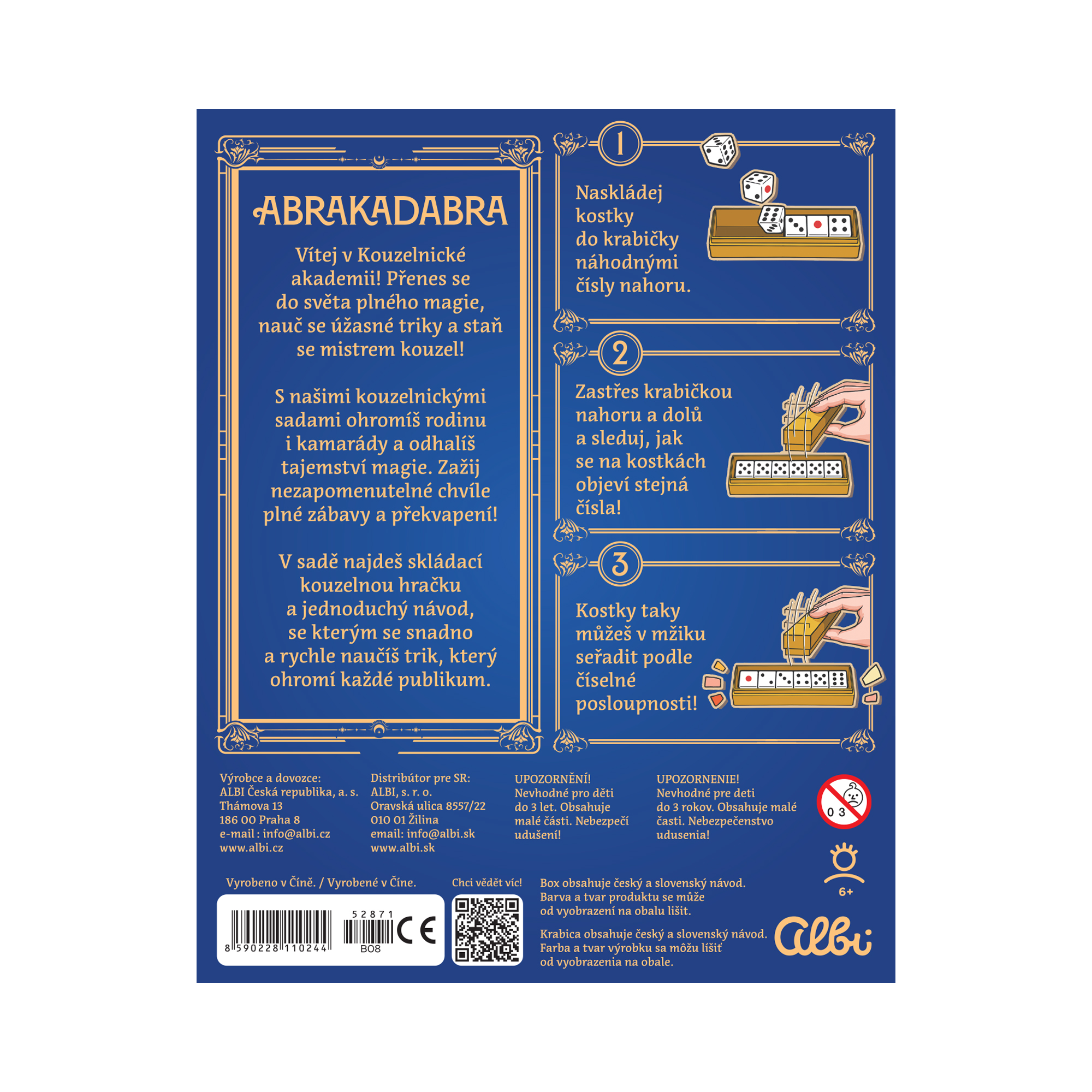 Vítejte v Kouzelnické akademii! Míhající se kostky je kouzelnická rekvizita, díky které dokáže kouzelník či kouzelnice uspořádat kostky v krabičce, čímž prokáže svou schopnost ovládat předměty. S kouzelnickými sadami od Albi ohromí váš malý kouzelník či kouzelnice rodinu i kamarády a odhalí tajemství magie. Zažijte společné nezapomenutelné chvíle plné zábavy a překvapení. Sada Míhající se kostky obsahuje obal na krabičku, dno a víko krabičky, 6 kostek a jednoduchý návod, se kterým se váš malý mistr kouzel snadno a rychle naučí trik, kterým ohromí každé publikum. Součástí sady je originální český videonávod, kterým vás provede prezident Českého magického svazu Jiří Hadaš. Obtížnost: lehká (1/3) Materiál: plast Rozměry krabičky: 8 × 2,5 × 2,5 cm