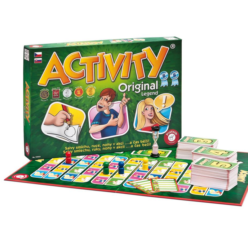 Nová verze oblíbené společenské hry Activity. Obsahuje nové slovní pojmy, nová pravidla a novou zábavu. Hra Activity je kombinací kreativních herních elementů. Hádané pojmy jsou vysvětlovány pomocí kreslení, opisu nebo pantomimy a spoluhráči je musejí uhodnout. Cíl hry: Družstva se snaží uhodnutím zadaných pojmů dosáhnout cílového pole. Herní plán: Herní plán tvoří cesta se 49 hracími poli, jedním startovním a jedním cílovým polem a dále tři očíslovaná políčka pro kartičky s pojmy. Každé hrací pole je označeno symbolem a barvou. Barva udává, který pojem na kartě má být znázorněn. Symbol určuje způsob znázornění (kreslení, popis, pantomima). karty s pojmy: Čísla na zadních stranách karet ukazují stupeň obtížnosti pojmů. Obvykle obsahují trojkové karty lehčí úkoly, čtyřkové středně těžké a pětkové spíš obtížné úkoly. Skutečný stupeň obtížnosti úkolu je však vždy subjektivní. Šest pojmů na kartách je vyobrazeno s barvami a symboly. Ty odpovídají barvám a symbolům na herním plánu. Barva udává, který pojem se znázorní, symbol pak jakým způsobem. Jestliže stojí figurka mého teamu na žlutém poli se symbolem pro kreslení, musím na kartě zvolit pojem vedle žlutého čtverce a tento pojem nakreslit. Pokud je pojem vytisknutý červeným písmem, hraje se "otevřená hra" a hádají všichni hráči. Hra obsahuje: 440 karet se 6 pojmy, herní plán, přesýpací hodiny, 4 figurky a pravidla.