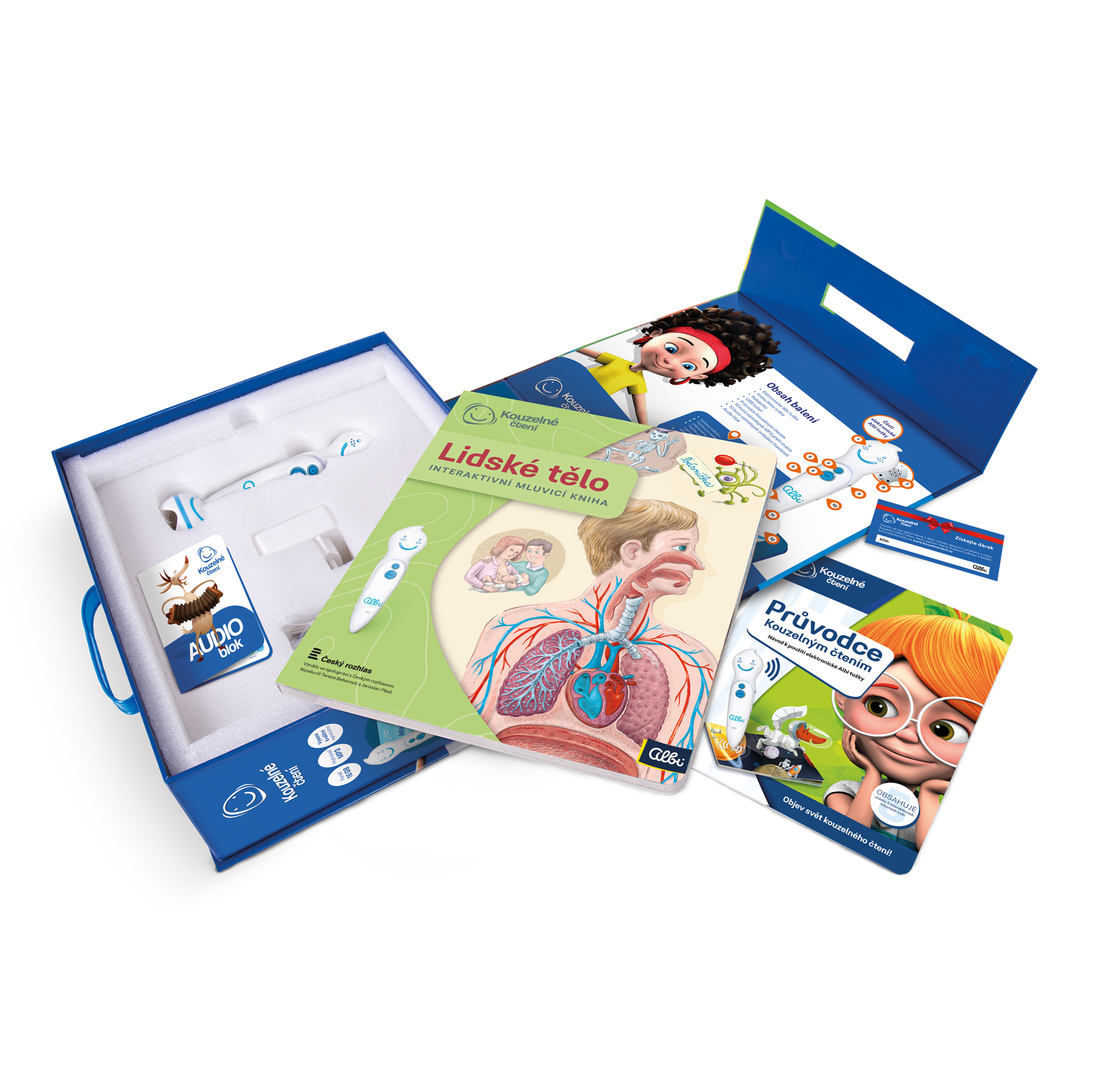 Interaktivní mluvící dětská kniha Lidské tělo s Elektronickou Albi tužkou z edice Kouzelné čtení seznámí děti od 5 let s naším tělem. Knihou Lidské tělo provází malý ufon Prokouk, který přiletěl z planety Po, aby prozkoumal taje lidského těla. Všemu se diví a není divu: na planetě Po funguje všechno úplně jinak! Postava Prokouka a poutavé ilustrace podněcují děti k postupnému objevování jednotlivých částí a soustav lidského těla. Kouzelné čtení je unikátní výukový systém, který vám přináší spoustu informací a zábavy. Stačí, když se lehce dotknete tužkou obrázku nebo textu, ozve se příslušná informace, zvuk nebo hudba. Tato interaktivní Elektronická tužka vám umožní zažít vždy něco nového. S Elektronickou Albi tužkou můžete plně využívat všechny výrobky označené logem Kouzelné čtení. Sada Albi tužka s knihou Lidské tělo obsahuje: Elektronickou Albi tužku, knihu Lidské tělo, nabíječku, USB kabel, Průvodce Kouzelným čtením, 10 kusů samolepek MP3 přehrávače, 10 kusů samolepek ovládání hlasitosti a Audio blok. Technická specifikace: 16GB paměť, USB kabel, vysokorychlostní připojení, Li-ion baterie, vestavěná dobíjecí 365 mA / 3,7 V, nabíječka, 500 mA / 5V, kompatibilní s OS Windows. ZVUKOVÉ UKÁZKY Poslechněte si několik ukázek z knihy Lidské tělo – Kouzelné čtení.