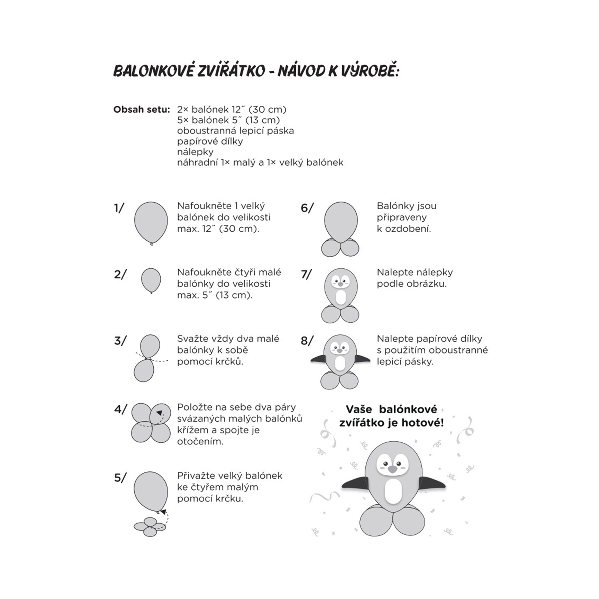 Balónkové zvířátko DIY neboli "Udělej si sám" v motivu Žába. Vytvořte ze sady balónků a papírových dílků roztomilé zvířátko a připravte dekoraci pro dětskou narozeninovou oslavu či tematickou párty. Tato sada dobře poslouží i jako párty tvořivá zábava pro všchny zručné děti i dospělé. Balení obsahuje: 2x balónek 12" – 30 cm, 5x balónek 5" – 13 cm, oboustranná lepicí páska, papírové dílky, nálepky, náhradní 1x malý a 1x velký balónek Materiál: latex Balónky je možné nafukovat vzduchem.