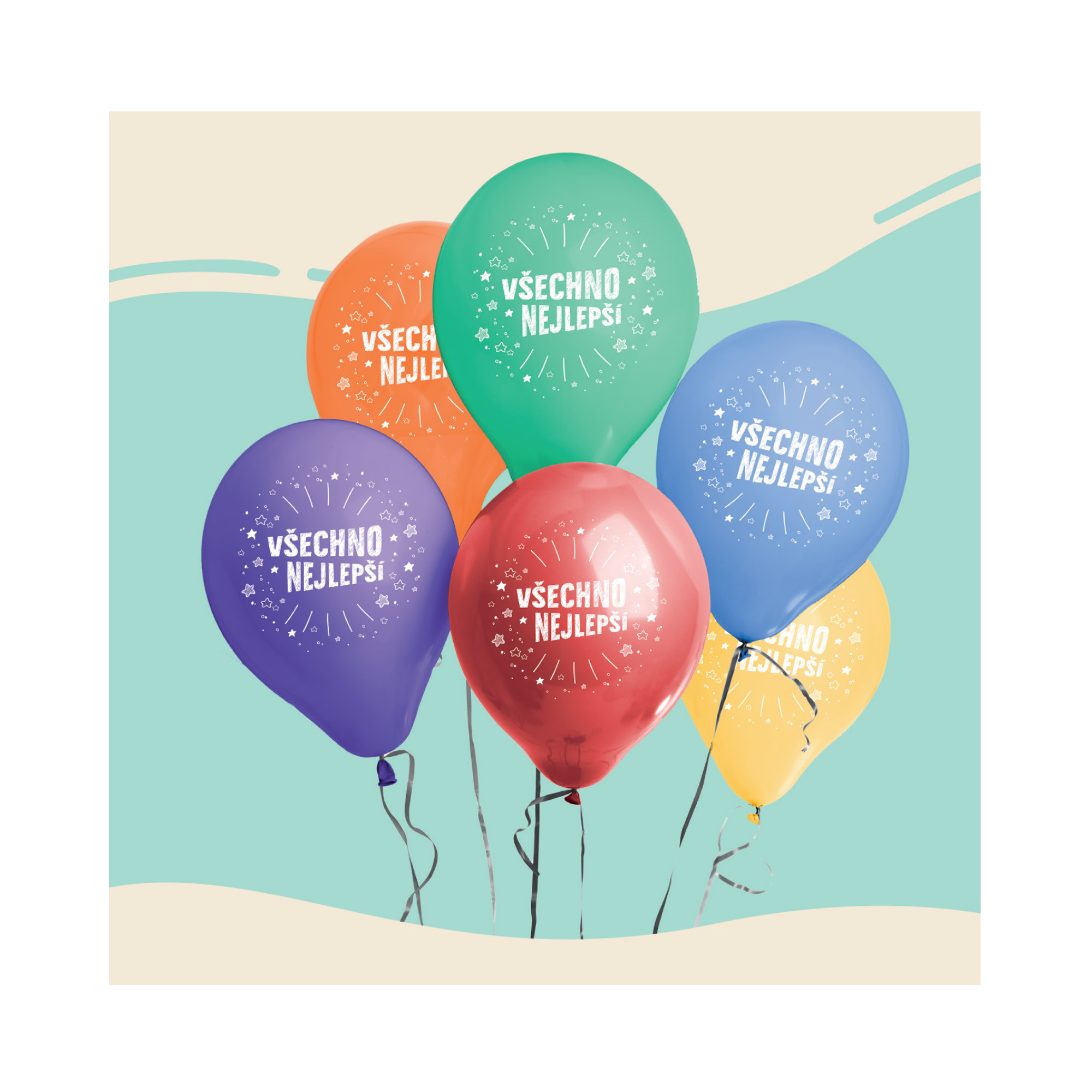 Sada latexových balónků v hravém mixu barev s potiskem nápisu "Všechno nejlepší". Balónky v sadě mají žlutou, oranžovou, červenou, fialovou, modrou a zelenou barvu. Každý z nich zdobí bílý potisk s přáním a ohňostrojem hvězdiček. Tato sada šesti balónků je skvělou dekorací na narozeninovou oslavu nebo párty. Velikost/rozměr: 12" – 30 cm Materiál: latex Balení obsahuje: 6 ks balónků Balónky je možné nafukovat vzduchem i heliem.