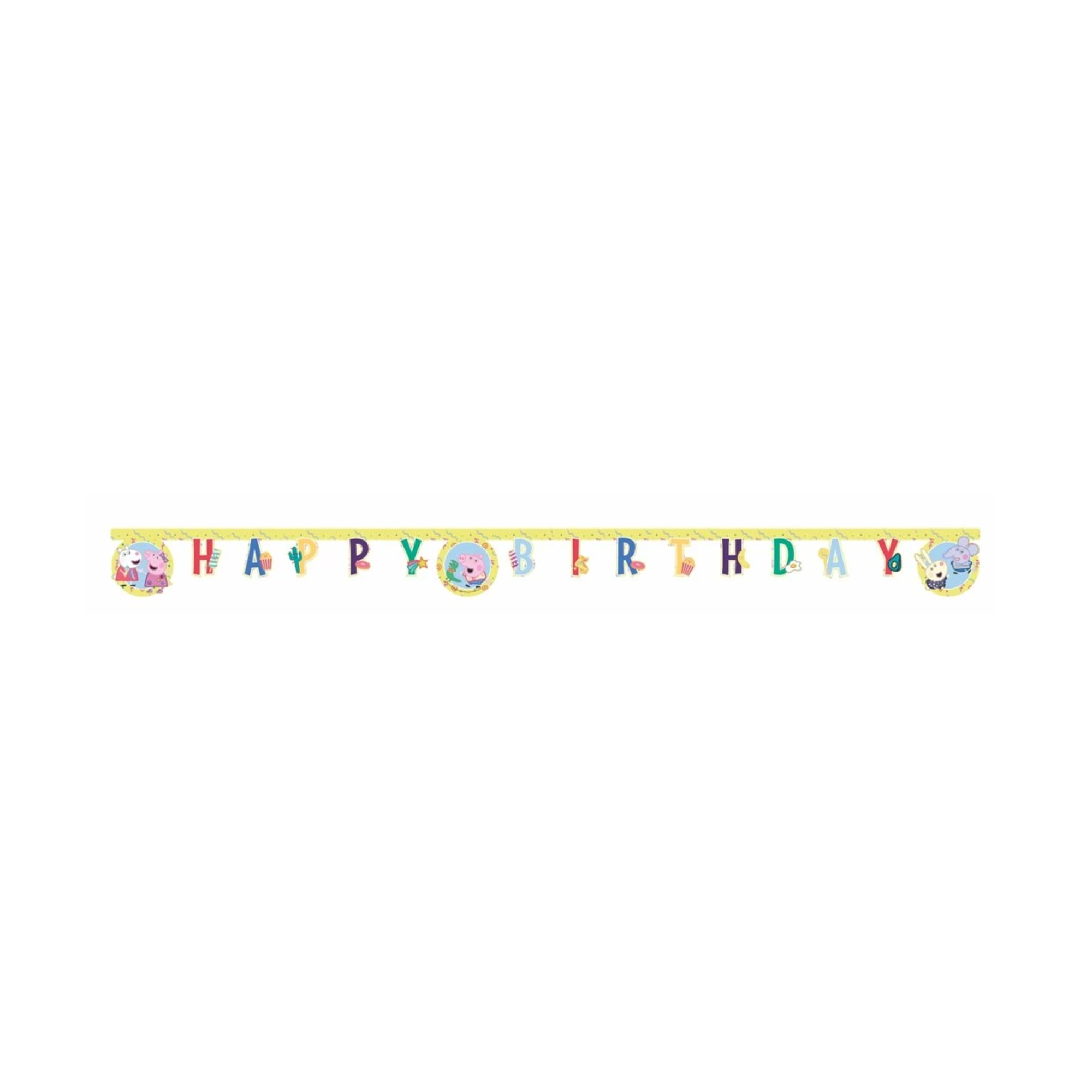 Párty banner s nápisem "Happy Birthday" a motivem prasátko Peppa skvěle ladí v kombinaci s dalšími produkty v sekci stolování a výzdoby. Nápis je spojen cvočky, na každém konci banneru je provázek na uchycení. Délka banneru: 200 cm Balení obsahuje: 1 ks narozeninového banneru