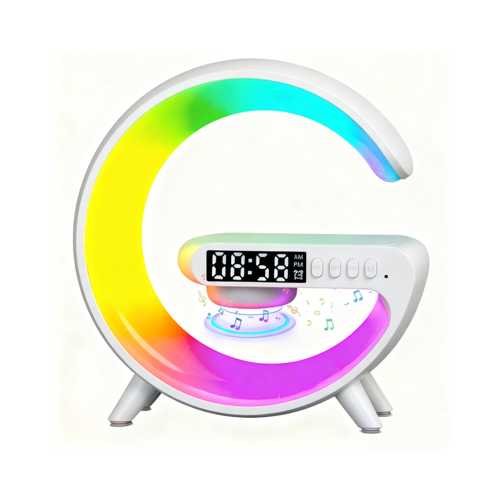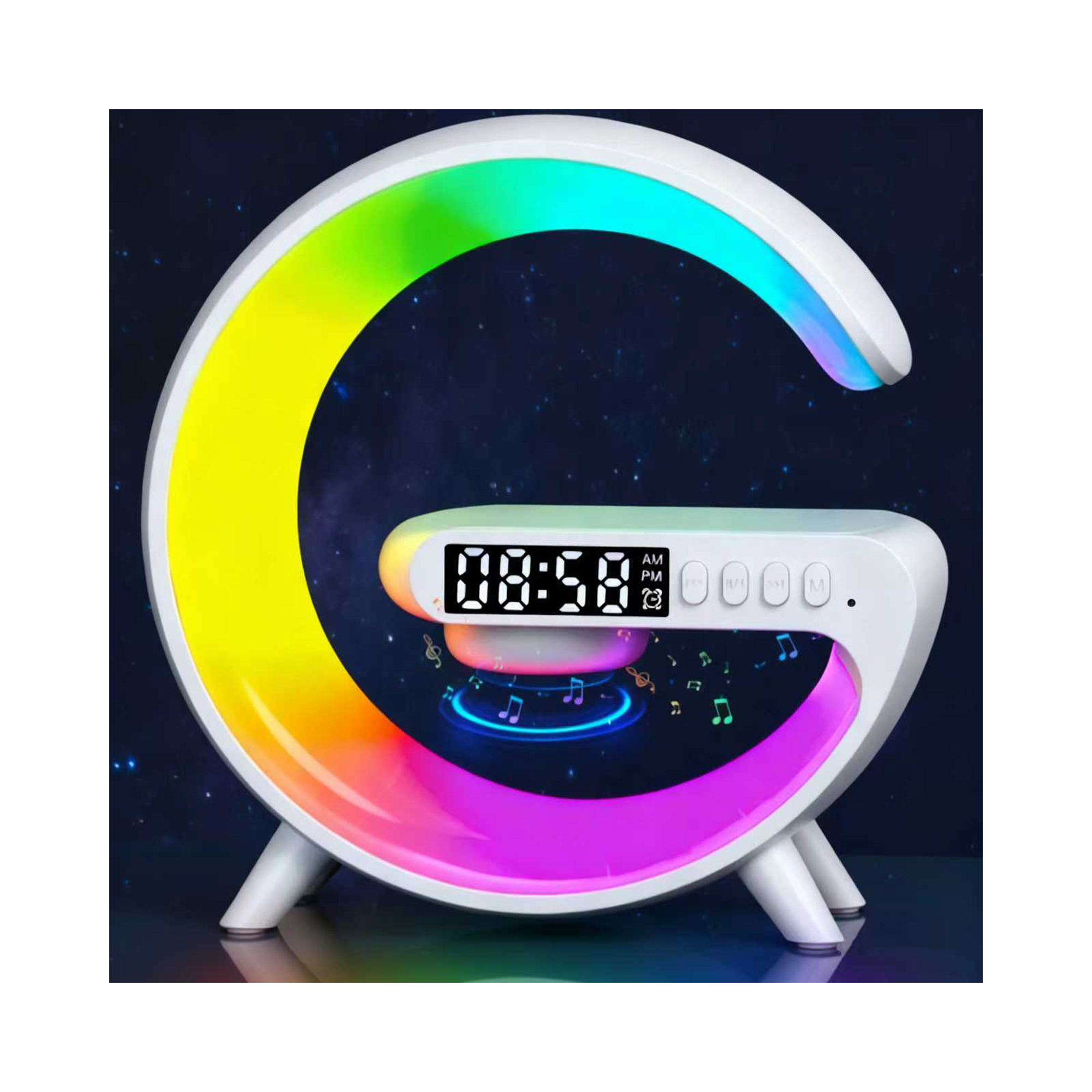 multifunkční lampa, tvarem připomínající písmeno G, v sobě spojuje chytré osvětlení, výkonný Bluetooth reproduktor, digitální budík a bezdrátovou nabíječku pro váš telefon. Jedná se o ideální doplněk pro vytvoření dokonalé atmosféry a zjednodušení ranních i večerních rituálů. Lampa nabízí 7 volitelných barev a 8 dynamických světelných efektů, které jednoduše přepínáte stisknutím tlačítka. Pro maximální relaxaci nebo zábavu je lampa vybavena také Bluetooth reproduktorem. Hudbu můžete přehrávat bezdrátově, nebo využít doplňkové režimy pro TF kartu či AUX kabel. Díky vestavěnému mikrofonu funguje zařízení i jako handsfree, umožňující přijímat a ukončovat hovory. Budík je pak navržen pro jemné probuzení – 3 minuty před nastaveným časem se postupně rozsvítí teplé světlo, simulující východ slunce. Pro klidný noční režim se jas automaticky sníží ve 20:00. Nastavení času je navíc u iOS telefonů automatické přes bluetooth, u Android zařízení je nutné čas nastavit ručně. A co je nejpraktičtější? Lampa slouží zároveň jako bezdrátová nabíječka. Stačí položit smartphone s operačním systémem Android nebo iOS na určenou plochu a začít nabíjet. Parametry: Vstup: 5V/2A, 9V/1.8A Výstup bezdrátového nabíjení: 15W Výkon LED: 3W Výkon reproduktoru: 3W Rozměry lampy: 15,6 × 15 × 5,6 cm
