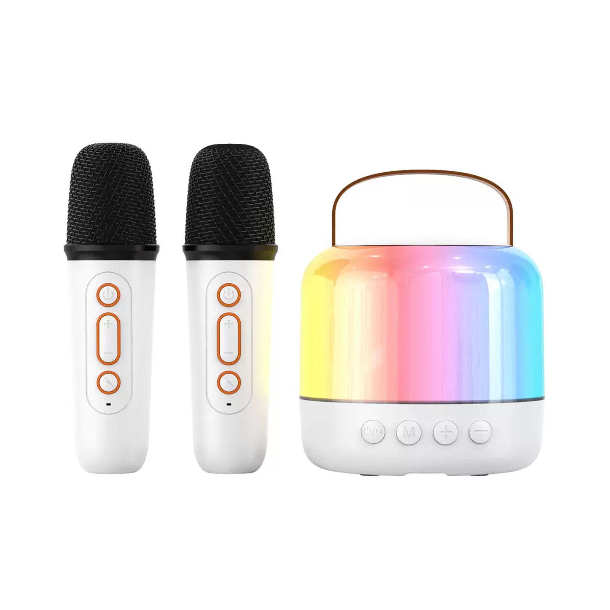 Rozjeďte pořádnou domácí párty s bezdrátovým karaoke setem se 2 mikrofony! Tento hravý a snadno ovladatelný set potěší všechny malé zpěváky a zpěvačky. Bílý karaoke set se skládá z reproduktoru s vestavěnou baterií a 2 bezdrátových mikrofonů. Připojte telefon, tablet nebo flash disk (přes Bluetooth, AUX nebo USB) a přehrávač automaticky spustí oblíbené písničky. Každý mikrofon má vlastní ovládací tlačítka pro hlasitost, ozvěnu i změnu režimu (lze přepínat mezi hlasem muže, ženy, dítěte a příšerky). Tlačítka umožňují samostatně regulovat intenzitu ozvěny (prostorového efektu), intenzitu výstupu z mikrofonu i hlasitost hudebního podkresu. Díky praktickému displeji a podsvícení je ovládání snadné i pro děti. Tento produkt má 5 typů světelných režimů: rotující barevné světlo, malé noční světlo, střídavé blikání barev, dynamický přechod barev a prolínání barev. Vestavěná baterie pak zajistí hodiny nepřerušované zábavy – nabíjení je možné přes běžný USB C kabel, který je součástí balení. Tento karaoke set podporuje dětskou kreativitu, rozvíjí řeč, rytmus a sebevědomí. Je ideální na narozeninové oslavy, rodinné večery nebo pod vánoční stromeček. Parametry: Rozměry reproduktoru: 10,5 × 10,5 × 10 cm Materiál krytu: ABS plast Verze Bluetooth: Bluetooth 5.3 podpora TF karet: až do 32 GB Dosah příjmu Bluetooth: do 10 metrů Výkon reproduktoru: 5 W Frekvenční rozsah: 50 Hz – 18 kHz Vstupní rozhraní: Type-C, AUX, USB, TF karta Nabíjecí napětí: 5 V / 1 A