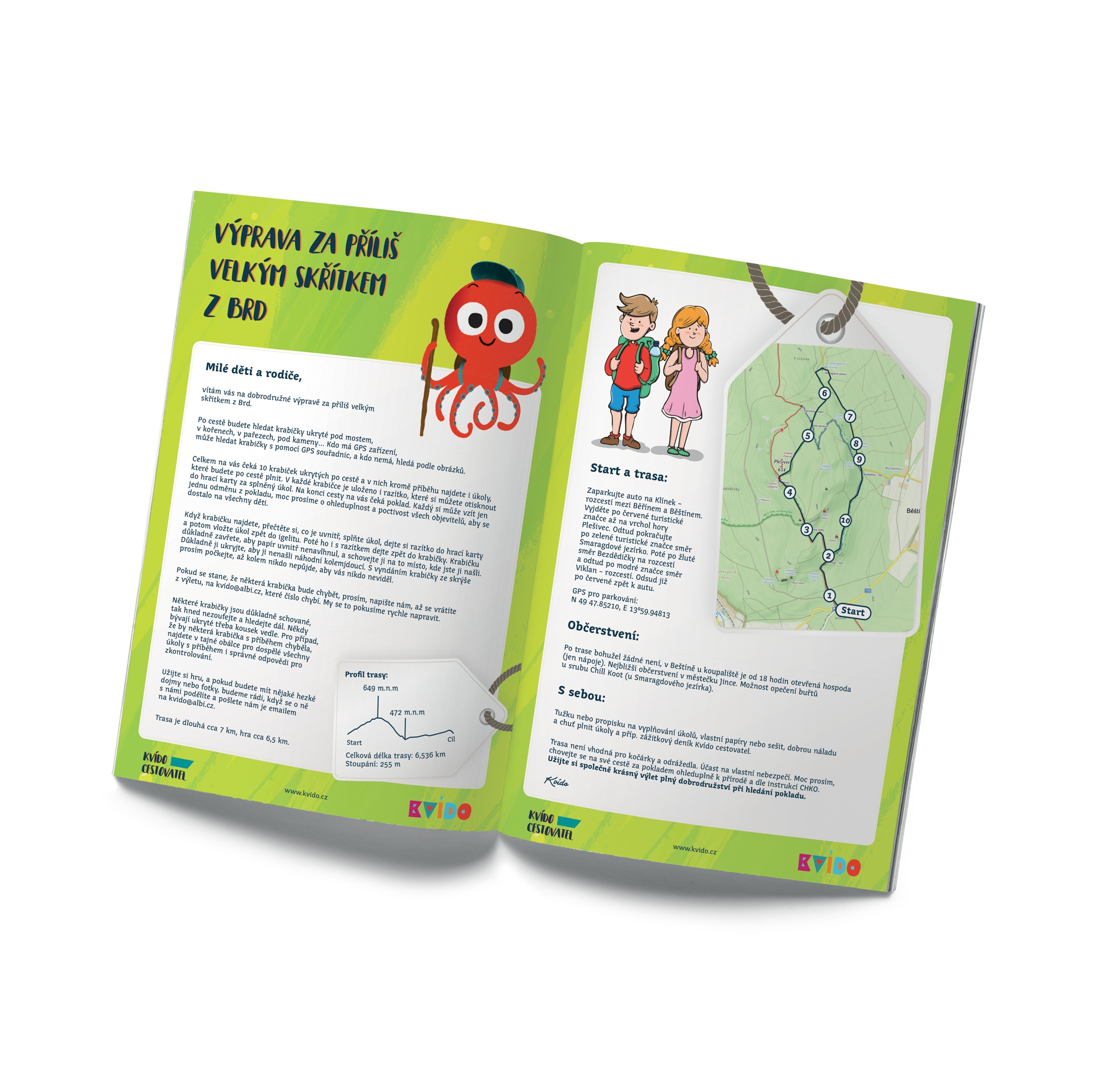 Kvídovy Zážitkové cesty po České republice zpestří váš rodinný výlet a putování přírodou. Na děti od 4 let cestou čeká celkem 10 úkolů, které jsou ukryté na různých místech v přírodě. Úkoly budou hledat pomocí přiložené mapy a fotografií míst. V cíli na každého cestovatele čeká jeden malý poklad. Zážitkové cesty od Kvída v dětech prohlubují zájem o přírodu, pohyb a touhu objevovat krásy České republiky. Celková délka trasy za pokladem je cca 7 km, hra je na trase dlouhé 6,5 km. Trasa není vhodná pro kočárky a odrážedla. Proč je Cesta za pokladem určena pouze pro 1 rodinu? Počet dárků, které se nám vejdou do truhličky s pokladem, je limitovaný. Proto si prosím vezměte z pokladu pouze odměnu dle počtu dětí ve vaší rodině (tj. 1-4 max). Samozřejmě se můžete na výlet vydat i s přáteli, ale z pokladu si na jeden poukaz vezměte maximálně 4 odměny. Moc děkujeme za vaši ohleduplnost k ostatním objevitelům. Lokalita: Brdy Zkontrolujte na Kvido.cz aktuálnost vaší cesty za pokladem! Cestovatelé, pozor – cesty za pokladem pravidelně kontrolujeme, v rámci údržby nebo při změně přírodních podmínek může docházet k aktualizaci tras nebo umístění stanovišť. Každá tištěná verze Cesty za pokladem obsahuje unikátní kód – ten můžete použít na stránkách Kvido.cz a stáhnout si PDF s aktualizovanými informacemi. Zda je cesta aktualizována (i datum aktualizace) najdete vždy v detailu vaší Cesty za pokladem na Kvido.cz. Cesta za pokladem obsahuje: popis cesty za pokladem s 10 zastávkami s úkoly pro děti, fotografie míst s GPS souřadnicemi, obálku pro dospělé s pohádkovým příběhem a úkoly pro děti včetně správných odpovědí, arch pro otištění razítek a celkovou mapu trasy. Myslete na naši přírodu – Cestu za pokladem si můžete pořídit i v PDF verzi. Více informací najdete na www.kvido.cz. Cesty za pokladem pro vás zpřístupňujeme a udržujeme od 1. 5. do 2. 11.!