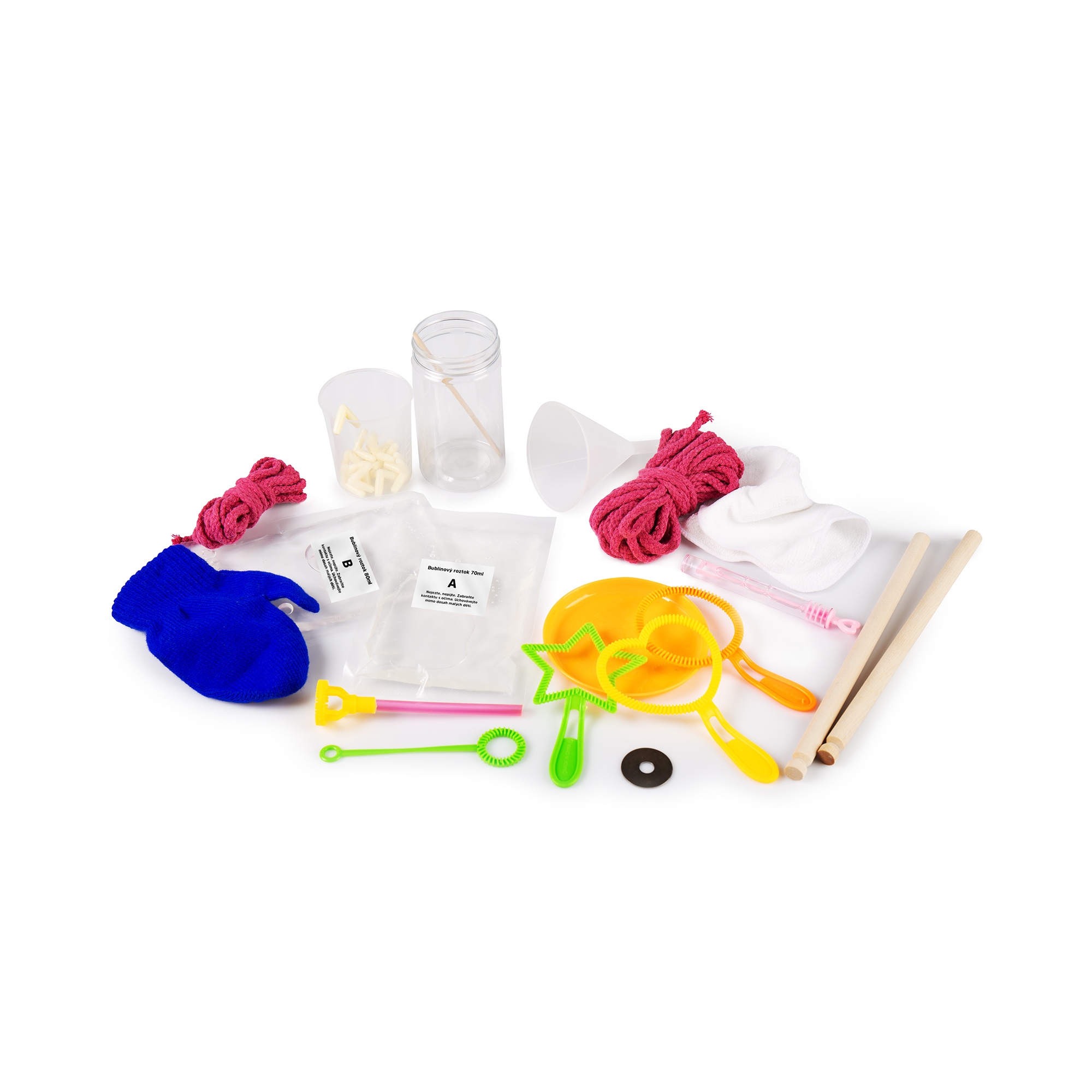 Víte proč jsou bubliny vždycky kulaté? Proč se v bublinách pohybují barvy? I na to najdete v této kouzelné sadě odpověď. Vytvořte extrémně velké bubliny, zkoušejte bublinky chytat do ruky, vytvořte bublinovou krychli, nebo si na prst nachytejte bublinkový řetěz. Že to není možné? S touto sadou ano! Sada Bublinové blbiny je skvělou venkovní zábavou jak pro jednotlivce, tak skupinku dětí. Děti bubliny milují a sada je zabaví i na celé hodiny. Sada je opakovatelná, pokud Vám dojde bublinový koncentrát, zkuste si podle návodu připravit vlastní a otestuje, který je lepší. Sada je určena především pro venkovní užití. Sada Bublinové blbiny obsahuje: bublinový koncentrát (vystačí na 1,3 litru bublifuku), 5 bublinových fukarů různých tvarů, bublinový talířek, 18 krátkých brček, 1 dlouhé brčko, 8 hranatých spojovacích dílů, 4 trojúhelníkové spojovací díly, 1 rukavice, 2 gumičky, 1 lahvičku tekutiny na bubliny, kterých se lze dotýkat, 2 dřevěné tyčky, 2 bavlněné provázky, kovovou podložku.