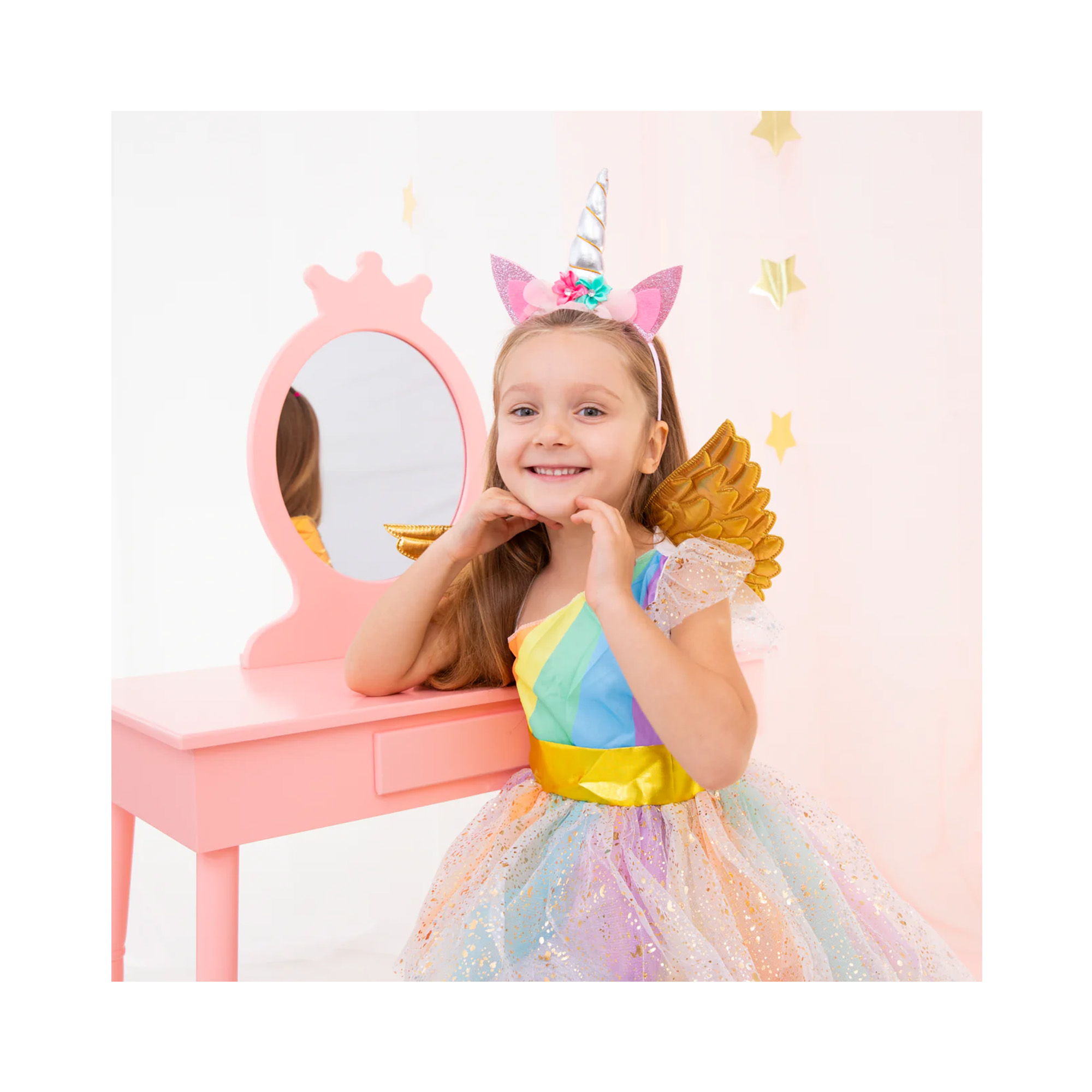 originální čelenka v motivu jednorožec, potěší všechny holčičky, které si rády hrají na jednorožce a mají rády kouzelný duhový svět. Tato čelenka je laděna do pastelových barev, ozdobena glitry, diamantovými kamínky a doplněna stříbrným rohem. Hodí se na tematickou oslavu nebo jen na zábavné jednorožčí hraní. Pro další párty doplňky a dekorace v tomto motivu můžete navštívit naši kategorii Jednorožec. Velikost: 19 × 26 cm Balení obsahuje: 1× čelenku