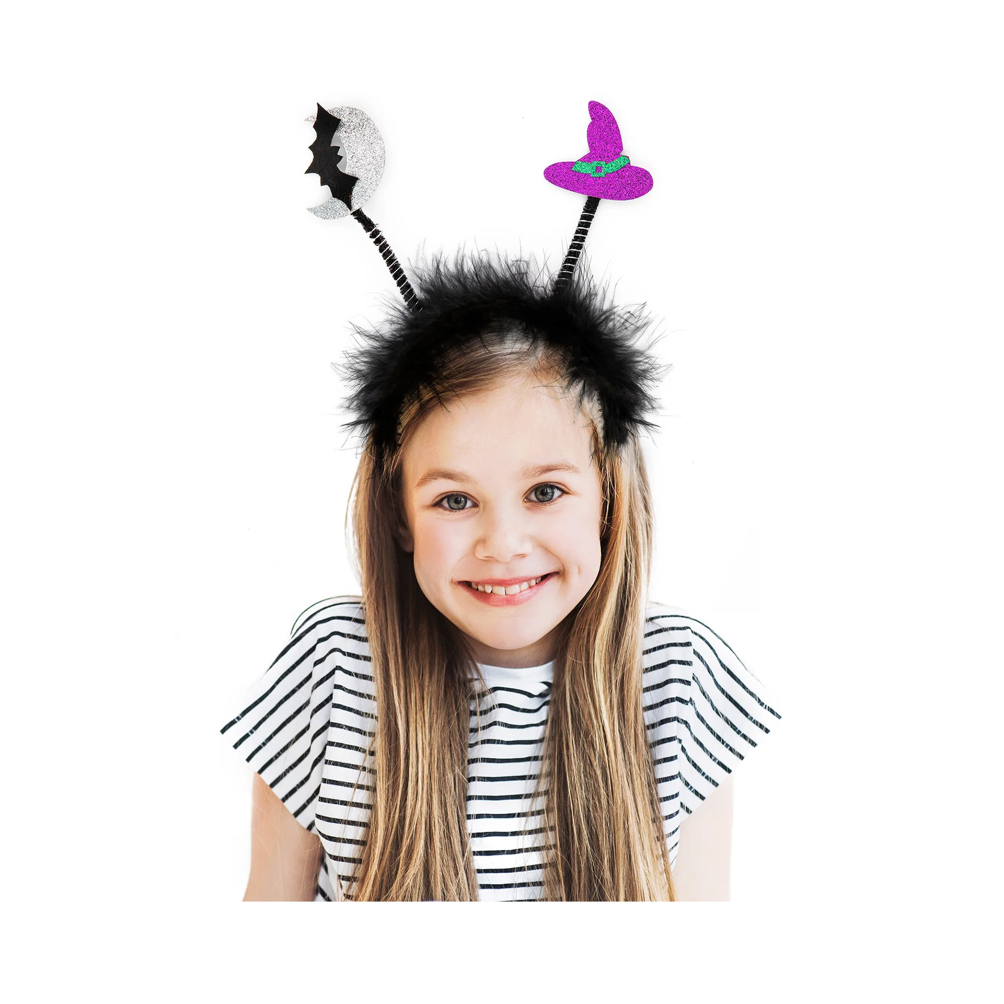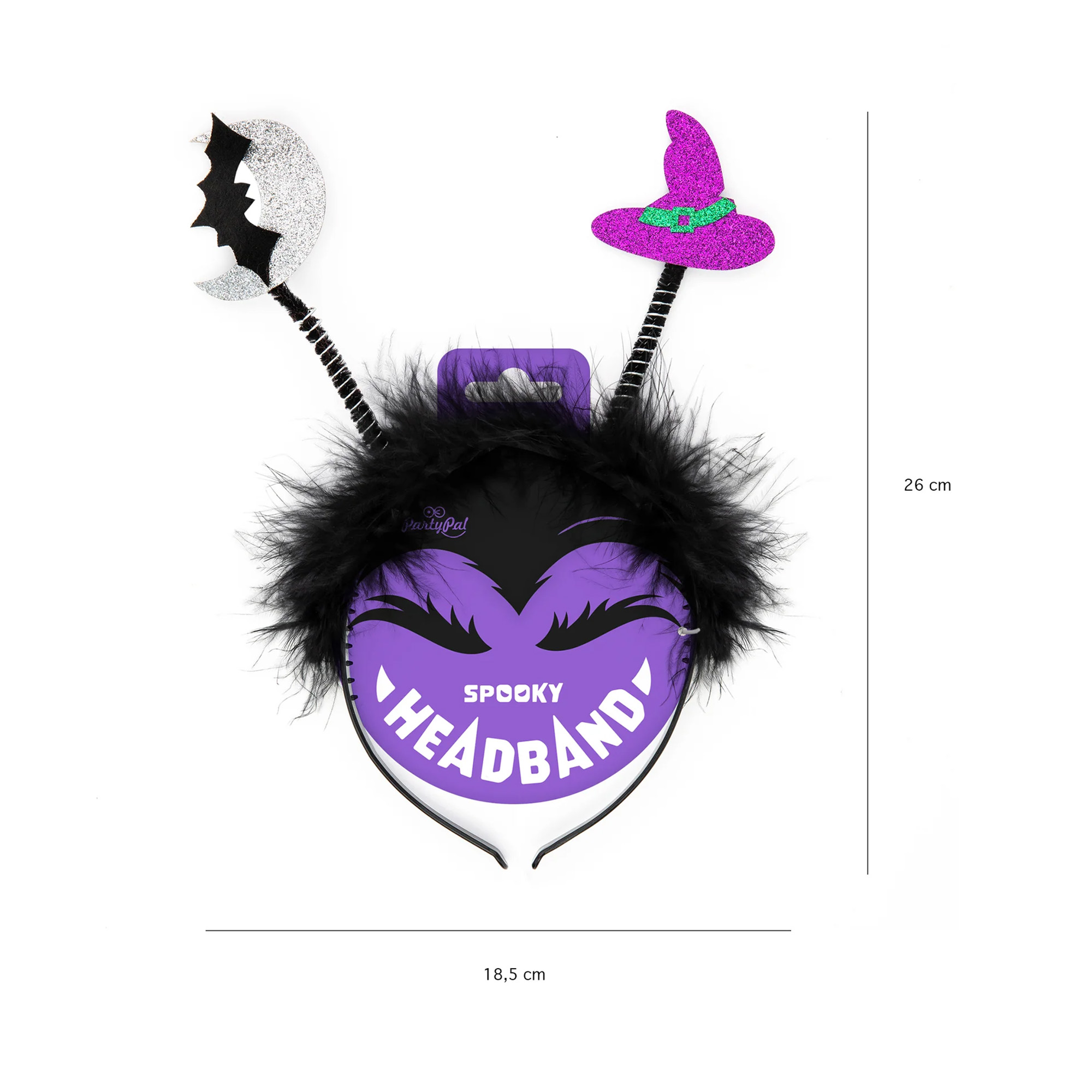 Dětská plastová čelenka, která je ozdobená jemnými černými peříčky a dvěma čarodějnickými motivy na pružinkách – fialový špičatý klobouk a černý netopýr na pozadí stříbrného měsíce. Tuto roztomilou čelenku využijete jako doplněk kostýmu na halloweenskou besídku i při oslavě pálení čarodějnic. Další párty doplňky a dekorace se strašidelným motivem naleznete v naší tematické kategorii Halloween nebo Pálení čarodějnic. Rozměry: 18,5 × 26 cm Velikost: univerzální (určeno pro děti) Balení obsahuje: 1 ks párty čelenky