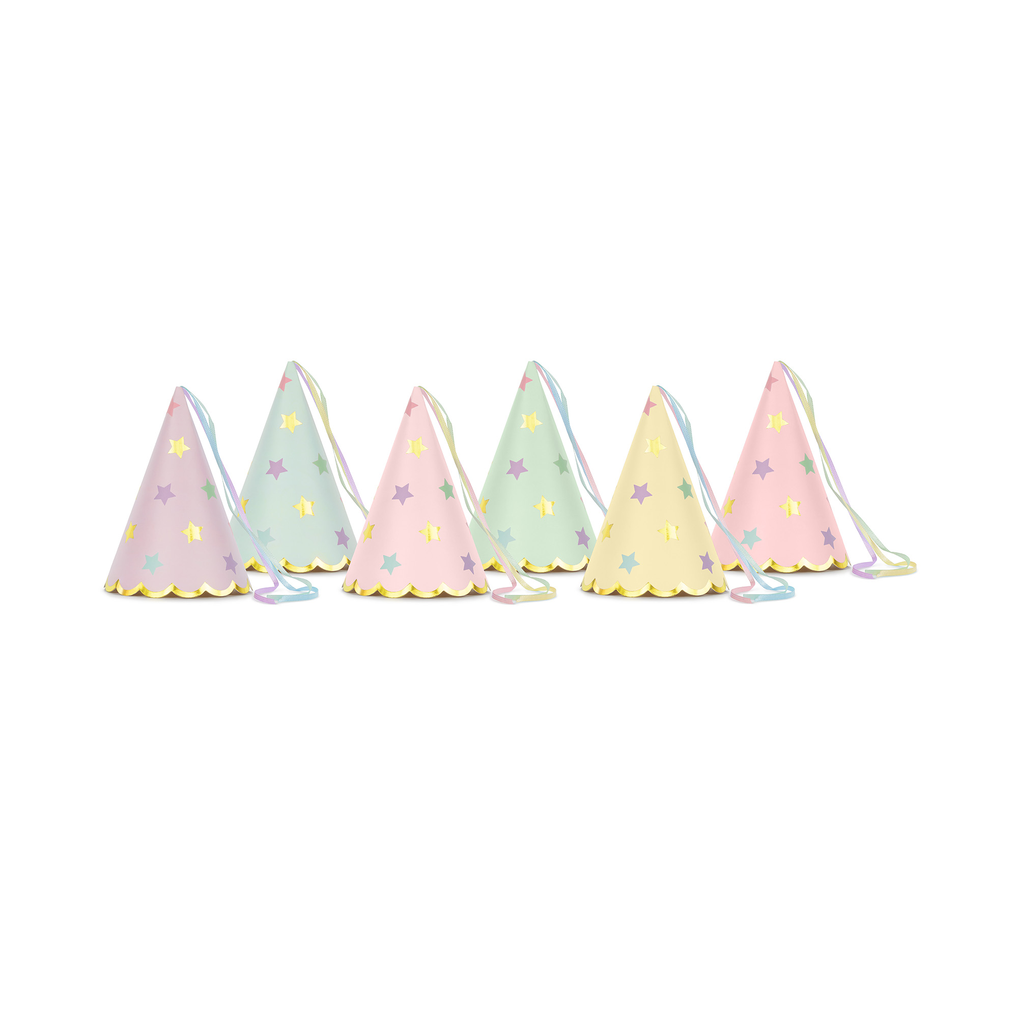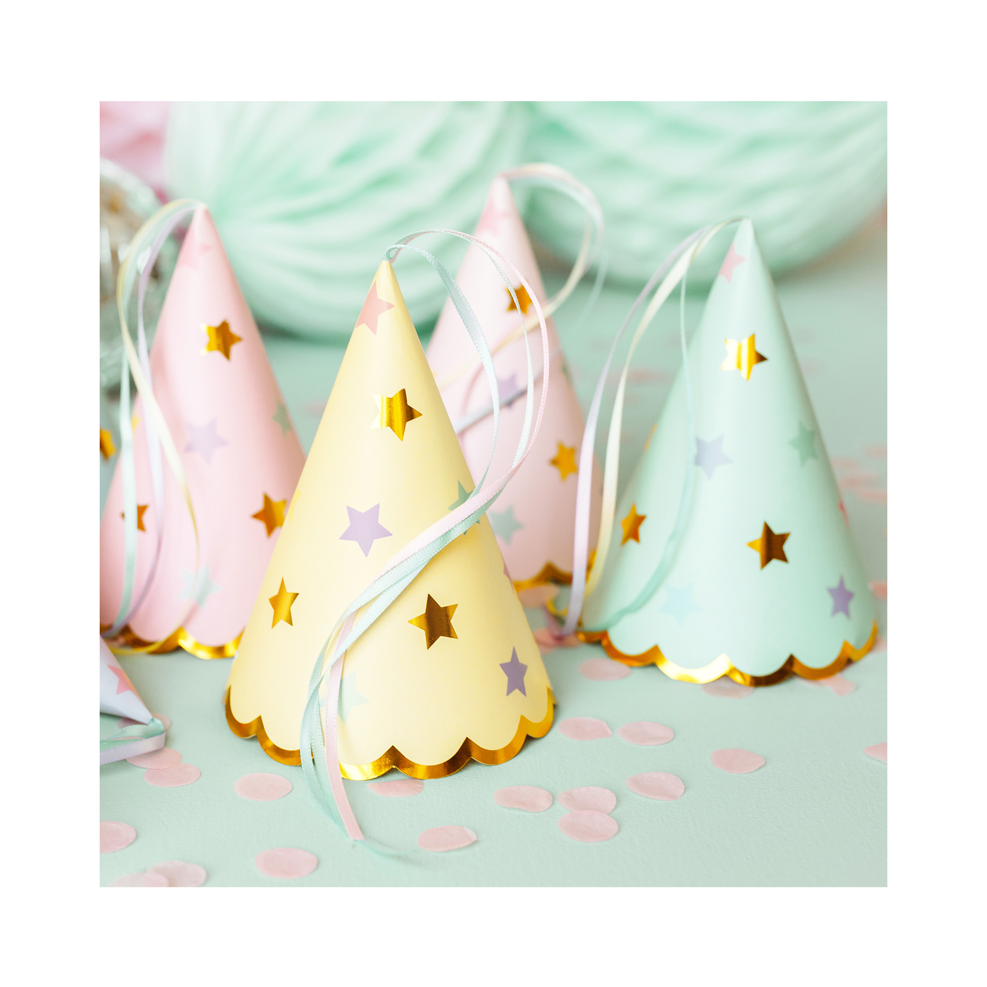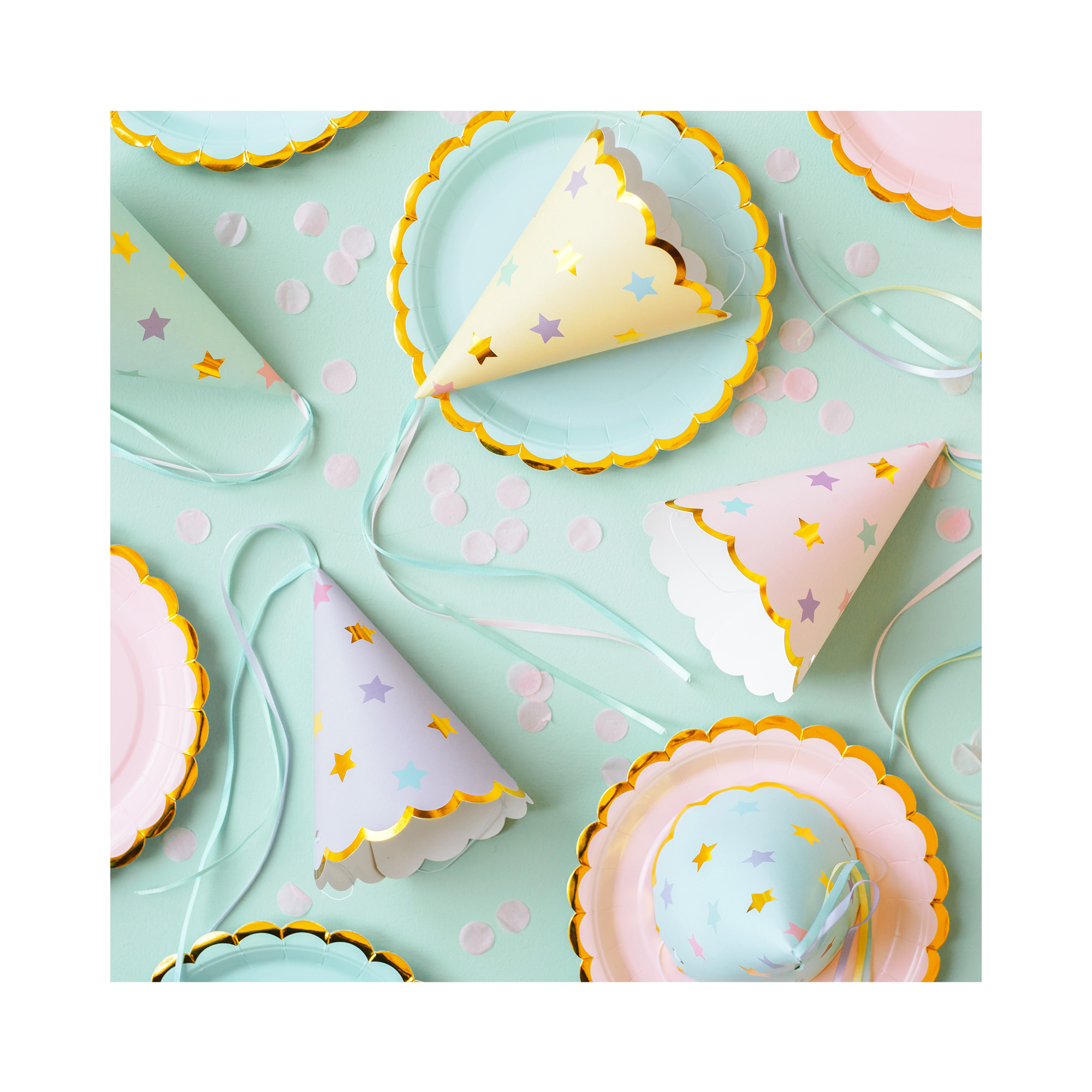 Sada šesti krásných papírových čepiček v mixu pastelových barev se zlatými detaily a saténovými stuhami zdobícími vršek čepiček. Tyto čepičky jsou vhodné jako veselá dekorace nározeninové oslavy nebo tematické párty. Pro další pastelové párty doplňky a dekorace můžete prozkoumat naši kategorii Multicolor. Rozměry: výška 14,5 cm a průměr 10 cm Balení obsahuje: 6 ks papírových čepiček s gumičkami