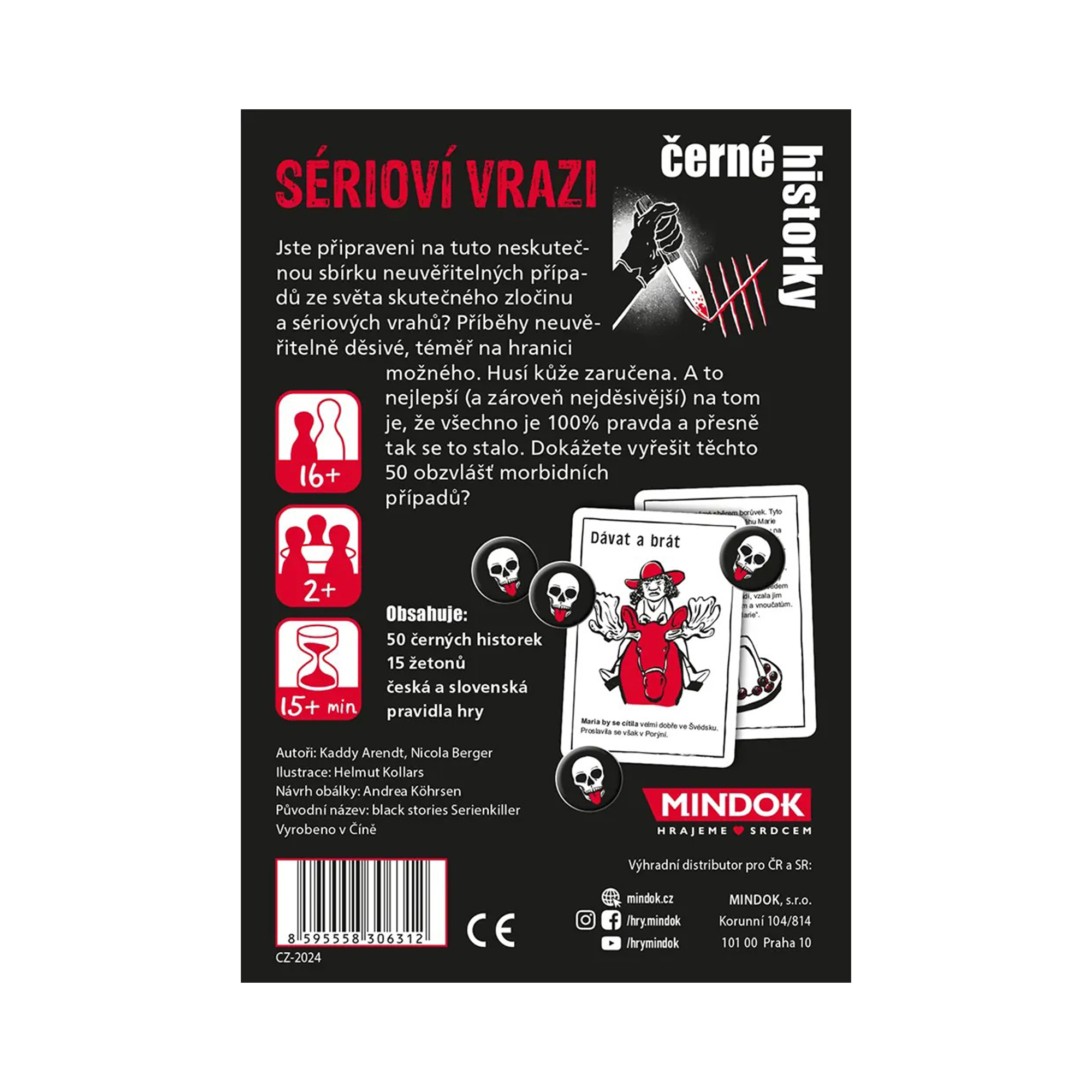 Jste připraveni na tuto sbírku neuvěřitelných případů ze světa skutečného zločinu a sériových vrahů? Příběhy neuvěřitelně děsivé, téměř na hranici možného. Husí kůže zaručena. A to nejlepší (a zároveň nejděsivější) na tom je, že všechno je 100% pravda a přesně tak se to stalo. Dokážete vyřešit těchto 50 obzvlášť morbidních případů? Hra Černé historky: Sérioví vrazi obsahuje: 50 černých historek, 15 žetonů, česká a slovenská pravidla hry.