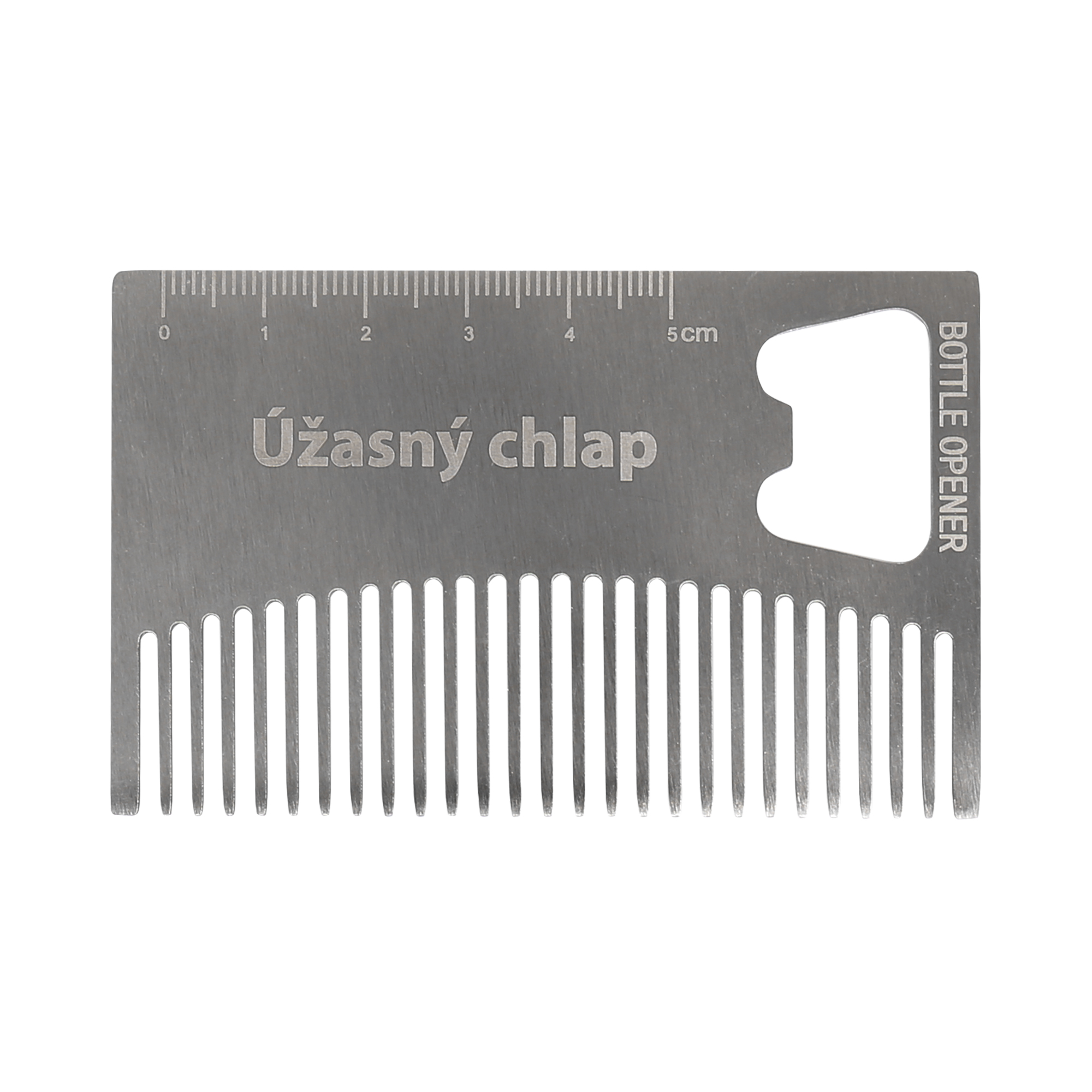 cestovní multifunkční nástroj z kolekce Mužská záležitost je perfektním pomocníkem pro všechny dobrodruhy a díky nápisu Úžasný chlap také skvělým dárkem pro muže. Je kompaktní a lehký, takže se snadno vejde do každého zavazadla, či kapsy. Skládá se ze 3 užitečných nástrojů: hřebenu, otvíráku na pivo a metru. Hřeben: Malý, skladný hřeben je na cestování ideální. Využije ho každý a kdyby bylo během cest větrno, můžete ho mít stále při sobě a pořád vypadat skvěle! Otvírák na pivo: Našemu českému pivu se žádné jiné nevyrovná, to je jasná věc. Ale pokud jste pivní nadšenec a vyrazíte do zahraničí, může se skladný otvírák často hodit. Kdo ví, třeba v tamních obchodech narazíte na tuzemské pivo a budete si moct hned pochutnat. Metr: Malý metr do 5 cm můžete využít na přeměření menších předmětů. Rozměry: 5,5 cm × 8,5 cm Materiál: nerezová ocel
