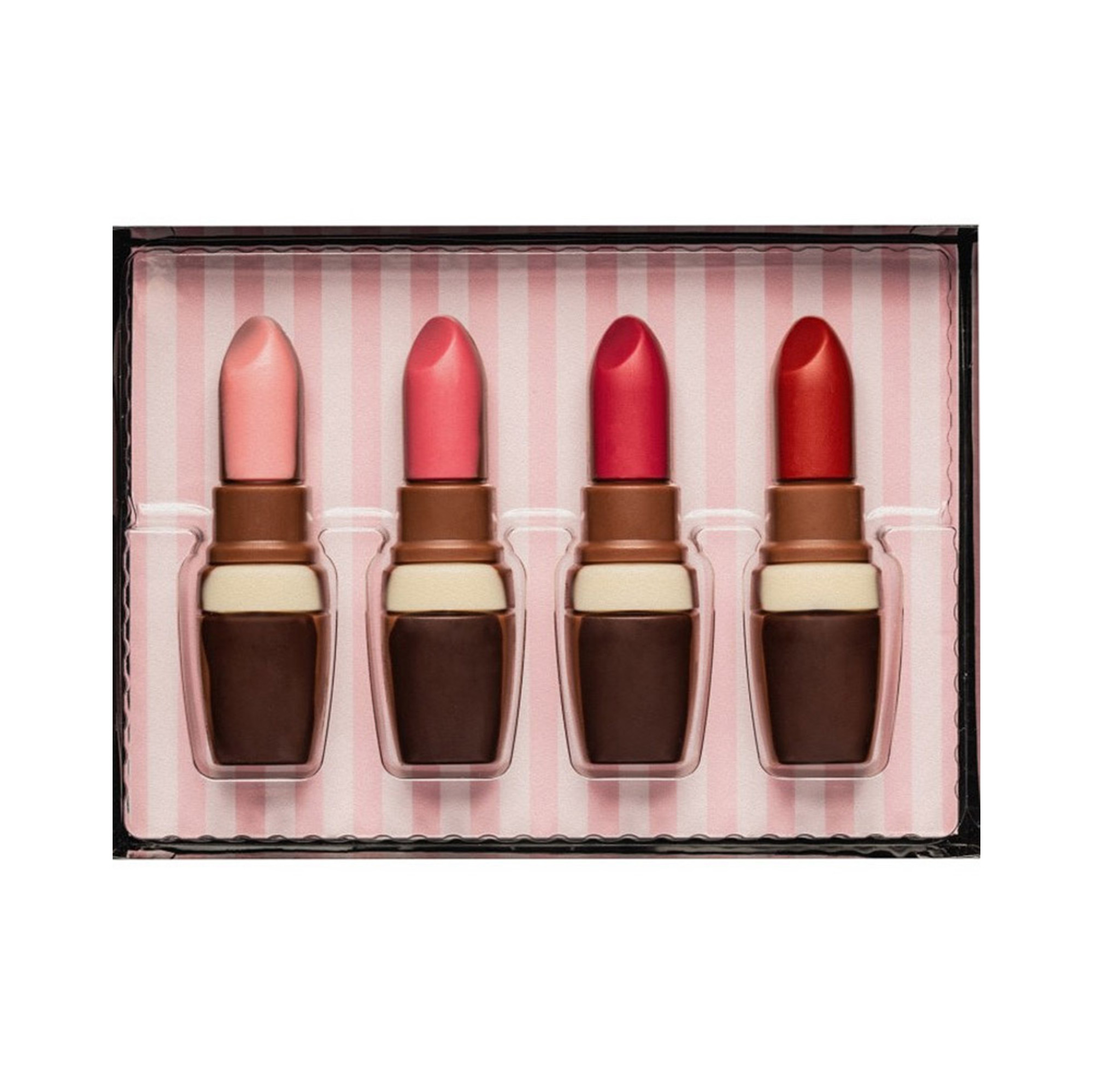 Vyměňte Milku za originální sadu čokoládových figurek a překvapte obdarovanou vtipným dárkem. Dárková sada realistických rtěnek z čokolády potěší všechny milovnice sladkého.  Jemná mléčná, hořká a bílá čokoláda ve tvaru elegantní rtěnky v módních odstínech. Hmotnost: 55 g Mléčná čokoláda tvarovaná s barevným dekorem Složení: cukr, sušené plnotučné mléko, kakaové máslo, kakaová hmota, sušená smetana, emulgátor – sójový lecitin, vanilkový extrakt. Potravinářské barvivo karmín a paprikový extrakt. Obsah kakaové sušiny v čokoládě nejméně 36 %. Alergeny: sušené mléko, sójový lecitin. Může obsahovat stopy ořechů a mandlí. Průměrná výživová hodnota ve 100 g výrobku:  energetická hodnota 577kcal/ 2405kJ tuky 38 g (z toho nasycené mastné kyseliny 23 g) sacharidy 53 g (z toho cukry 53 g) bílkoviny 5,6 g sůl 0,16 g