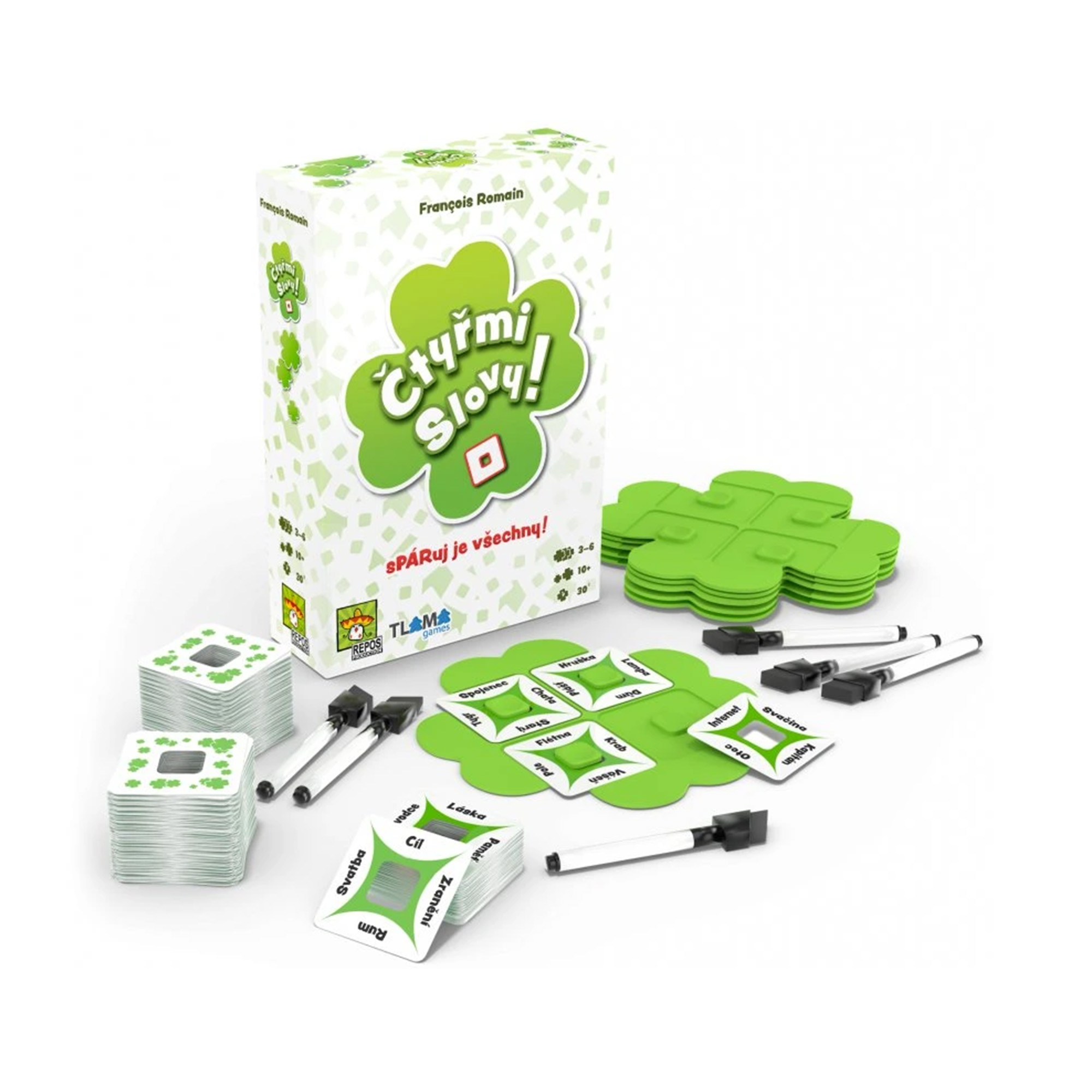 Čtyřmi slovy! je oceňovaná kooperativní asociační hra se slovy. Hrajte jako tým a překonejte své nejvyšší skóre! Doberte si karty klíčových slov a tajně napište jejich společné rysy na svou hráčskou desku – to budou vaše nápovědy pro ostatní hráče. Poté zkuste společnými silami rozlousknout nápovědy svých parťáků. Jakmile nastane konec hry, sečtěte body, které jste dostali za uhodnutá slova, a výsledek zapište do záznamového archu! Při každé hře se snažte překonat vaše nejvyšší skóre! Hra je určena pro 3 až 6 hráčů od 10 let. Herní materiál a pravidla jsou v češtině. Hra Čtyřmi slovy! obsahuje: 220 karet slov, 6 hráčských desek, 6 mazatelných popisovačů, 1 záznamový arch a pravidla v češtině.