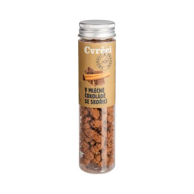 Mlsání budoucnosti? Cvrčci v mléčné čokoládě se skořicí! Lahodná a výživná pochoutka plná proteinu, která je ideální pro ty, kteří hledají něco nového a netradičního. Neotřelý dárek, který může překvapit, ale i pobavit a nakonec zachutnat. Hmotnost: 20g Cvrčci v mléčné čokoládě se skořicí Složení:Mléčná čokoláda (65.8%) (cukr, kakaové máslo, sušené plnotučné mléko, kakaová hmota, emulgátor: sójový lecitin, přírodní vanilkové aroma), cvrčci (Acheta domesticus) (34%), skořice (0.2%) Obsahuje stopy korýšů, sóji, mléka a měkkýšů. Může obsahovat obiloviny obsahující lepek a skořápkové plody. Výživové údaje na 100 g: energetická hodnota 2174kJ / 523 kcal tuky 30.7 g – z toho nasycené mastné kyseliny 25.9 g sacharidy 35.4 g – z toho cukry 34.7 g vláknina 2,4 g bílkoviny 25 g sůl 0,3 g Hmotnost: 20 g