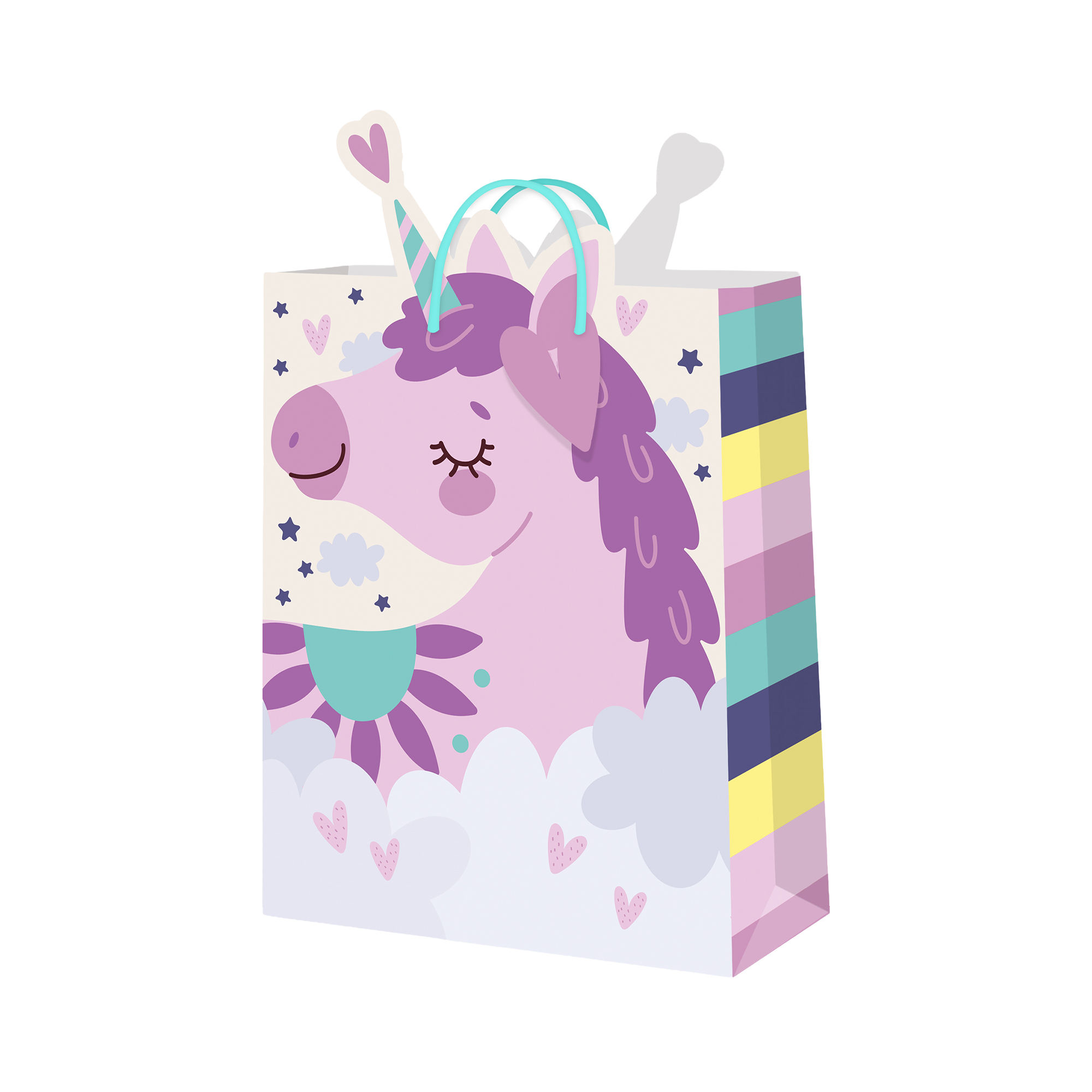 Máte koupený dárek a potřebujete ho rychle zabalit, aby i jako dárek vypadal? S papírovou taškou od Albi už to nemůže být snadnější. Stačí předmět do tašky vložit a můžete rovnou gratulovat. Dětská dárková taška nabízí netradiční výřez v horní části a atraktivní motiv jednorožce. Veselé barvy zaujmou všechny malé oslavenkyně! Součástí tašky je i jmenovka ve tvaru srdíčka, na kterou můžete napsat jméno či krátký vzkaz. Je dostupná ve dvou velikostech a skvěle se hodí pro různé příležitosti, jako jsou narozeniny, svátek i Vánoce. Rozměry malé tašky: 17,8 × 9,8 × 22,9 cm (šířka × hloubka × výška) Rozměry velké tašky: 26 × 12,7 × 32,4 cm (šířka × hloubka × výška)