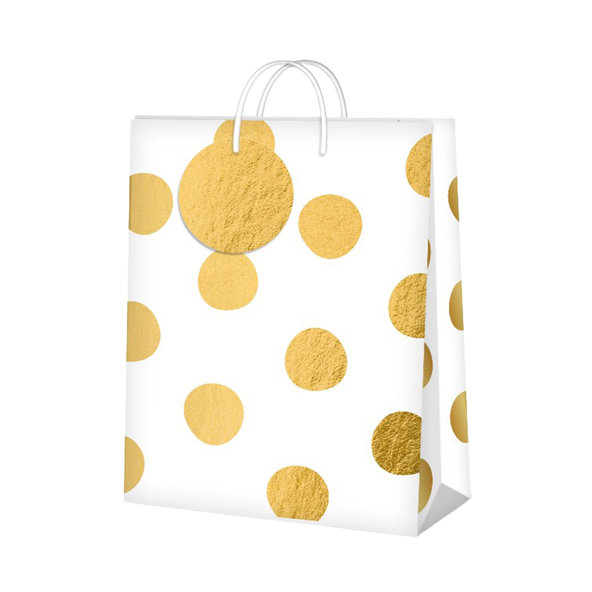 Máte koupený dárek a potřebujete ho rychle zabalit, aby i jako dárek vypadal? S papírovou taškou od Albi už to nemůže být snadnější. Stačí předmět do tašky vložit a můžete rovnou gratulovat. luxusní dárková taška se zlatými puntíky na bílém pozadí je vhodná na zabalení dárku pro ženy všech věkových kategorií. Je dostupná ve dvou velikostech a skvěle se hodí pro různé příležitosti, jako jsou narozeniny, svátek nebo Vánoce. Rozměry malé tašky: 17,8 × 9,8 × 22,9 cm (šířka × hloubka × výška) Rozměry velké tašky: 26 × 12,7 × 32,4 cm (šířka × hloubka × výška)