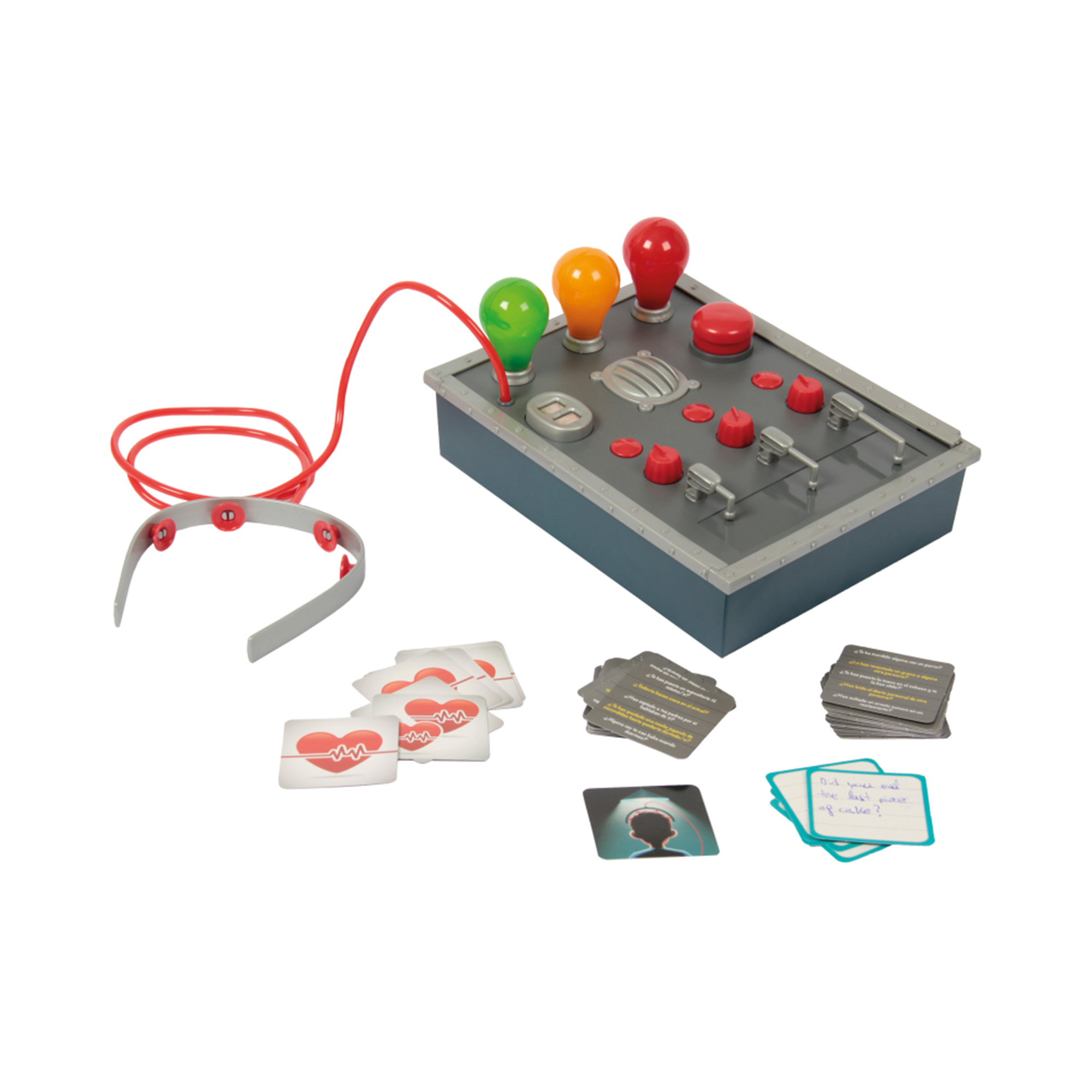 Získejte od svých protivníků ty nejzáhadnější a nejpřekvapivější informace díky tomuto detektoru pravdy! Vyberte kartu a položte hráči podle svého výběru otázku. barevné žárovky vám řeknou, zda hráč říká pravdu nebo ne. Buďte opatrní, pokud stroj detekuje lež, hráč přijde o život. Poslední hráč s největším počtem životních karet vyhrává hru! Hra Detektor lži obsahuje: 1 detektor pravdy, 1 náhlavní soupravu a 500 herních karet. Hra vyžaduje 3 × baterie AA, které nejsou součástí balení.