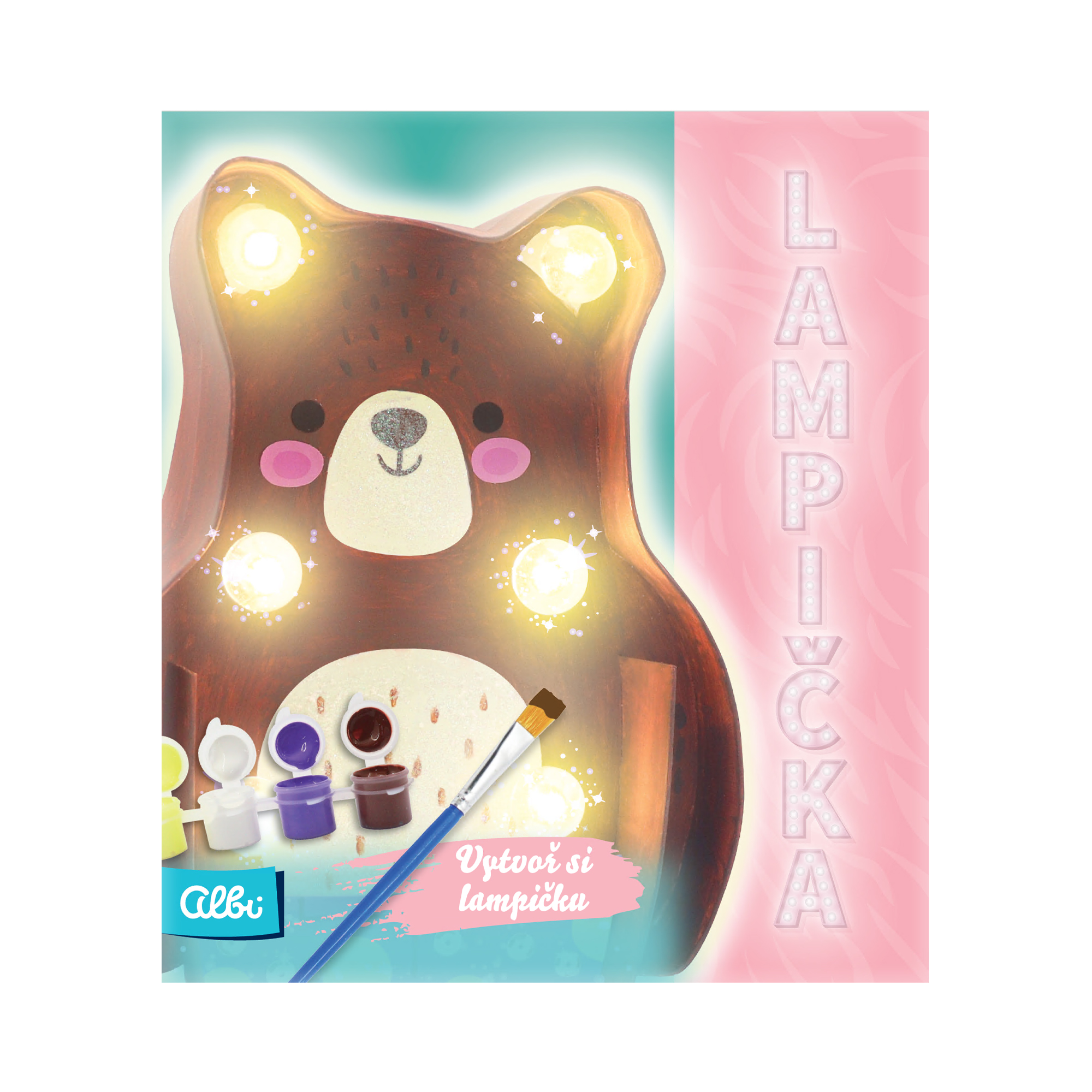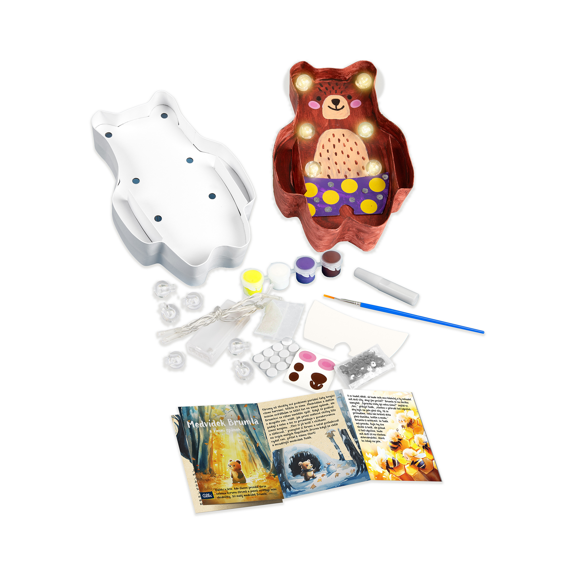 Objevte kouzelný svět tvoření a pohádek! Tato kreativní sada umožní vašim dětem vytvořit si vlastního svítícího medvídka, který se stane jejich kamarádem nejen při usínání. Sada obsahuje vše, co je potřeba pro vytvoření vlastní lampičky ve tvaru medvídka. Aplikujte třpytkové lepidlo, flitry a vytvořte si vlastí zvířátko, které nakonec rozsvítíte. V sadě najdete i krásné leporelo s pohádkovým vyprávěním o medvídkovi a jeho strastech. LED řetěz je na baterie, a tak lze lampičku umístit kamkoliv bez nutnosti zásuvky. Baterie nejsou součástí balení. DIY sada je nejen praktickým dárkem, ale také podporuje zručnost, tvořivost a kreativitu. Zvířátkový kamarád bude svítit celou noc a odhánět zlé sny. DIY Lampička – Medvídek obsahuje: karton ve tvaru medvídka, 4 kalíšky akrylových barev, 1 štětec, třpytkové lepidlo, svítící řetěz s LED diodami, 6 plastových baněk na žárovky, 9 oboustranně lepících polštářků, třpytivá kolečka, kartonový základ pro kalhoty, 2 samolepkové oči, 2 samolepkové líce, 1 samolepku čenichu.