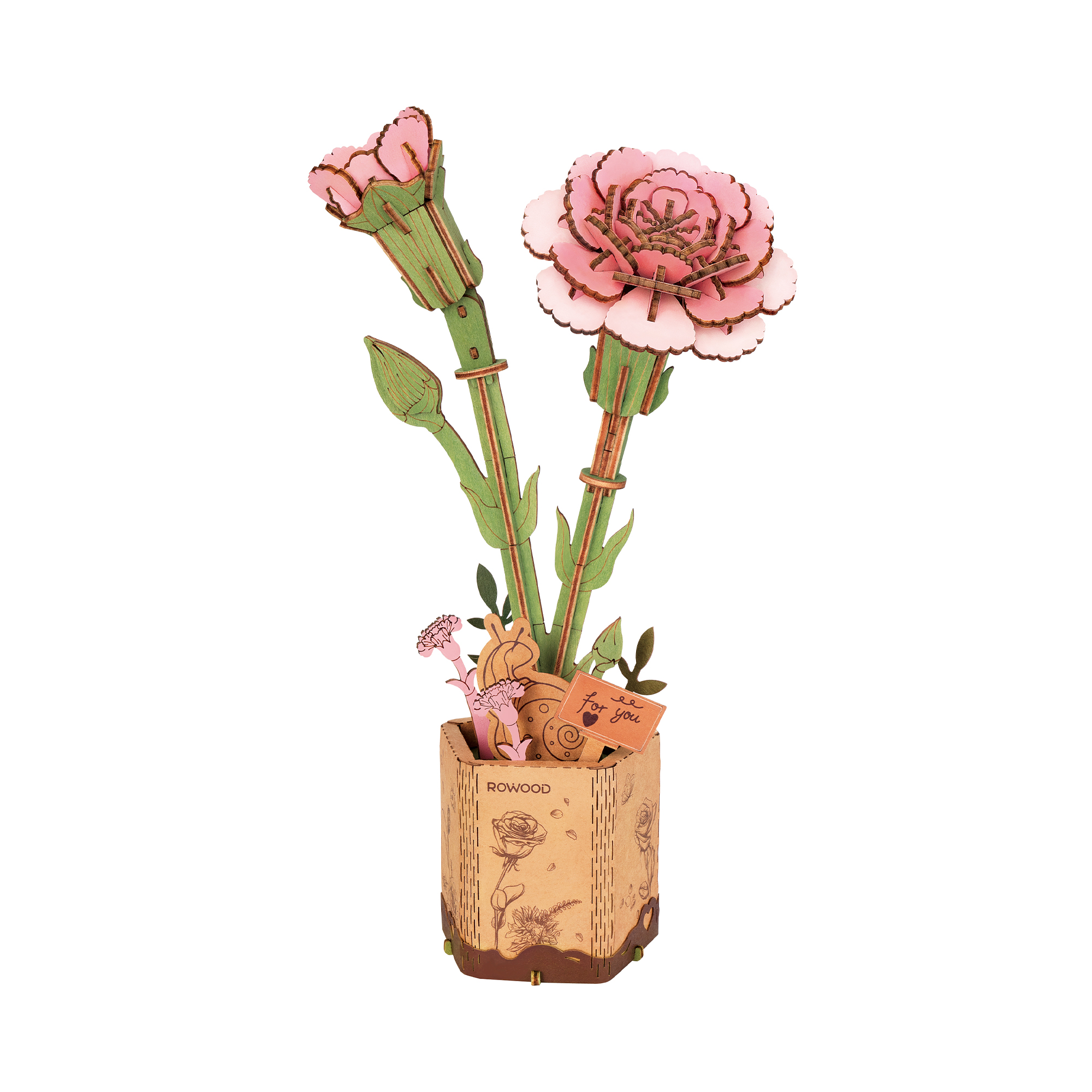 Darujte květinu, která neuvadne Růžový karafiát je symbolem něhy, mateřské lásky a obdivu a právě tento vám vykvete pod rukama během chvilky. K sestavení 3D stavebnice Krafiát vám stačí 30 minut a odměnou za trpělivost při skládání je dřevěný model květiny ve stabilním papírovém květináči, který bude vám či obdarovanému dělat parádu hodně dlouhou dobu. S dřevěnou DIY (Do It Yourself = udělej si sám) stavebnicí Květina – Karafiát značky Robotime si díky očíslovaným dílkům a obrázkovému návodu květinu jednoduše postavíte úplně sami. Vše, co k tomu potřebujete, naleznete v balení. Po sestavení se růžový karafiát stává okouzlující dekorací, která nejlépe vynikne na poličce, parapetu či v knihovně. Tip na jedinečný dárek pro všechny fanoušky stavebnic, puzzle a milovníky skládání. Ponořte se do úchvatného světa z dřevěných dílků, které jsou precizně vyřezávané laserem a díky čepovému spoji do sebe krásně zapadají a drží pohromadě bez nutnosti použití lepidla. Technické informace Počet dílů: 124 Náročnost: 2/5 Odhadovaný čas sestavení: 30 minut Rozměry květiny: 12 × 8 × 22 cm