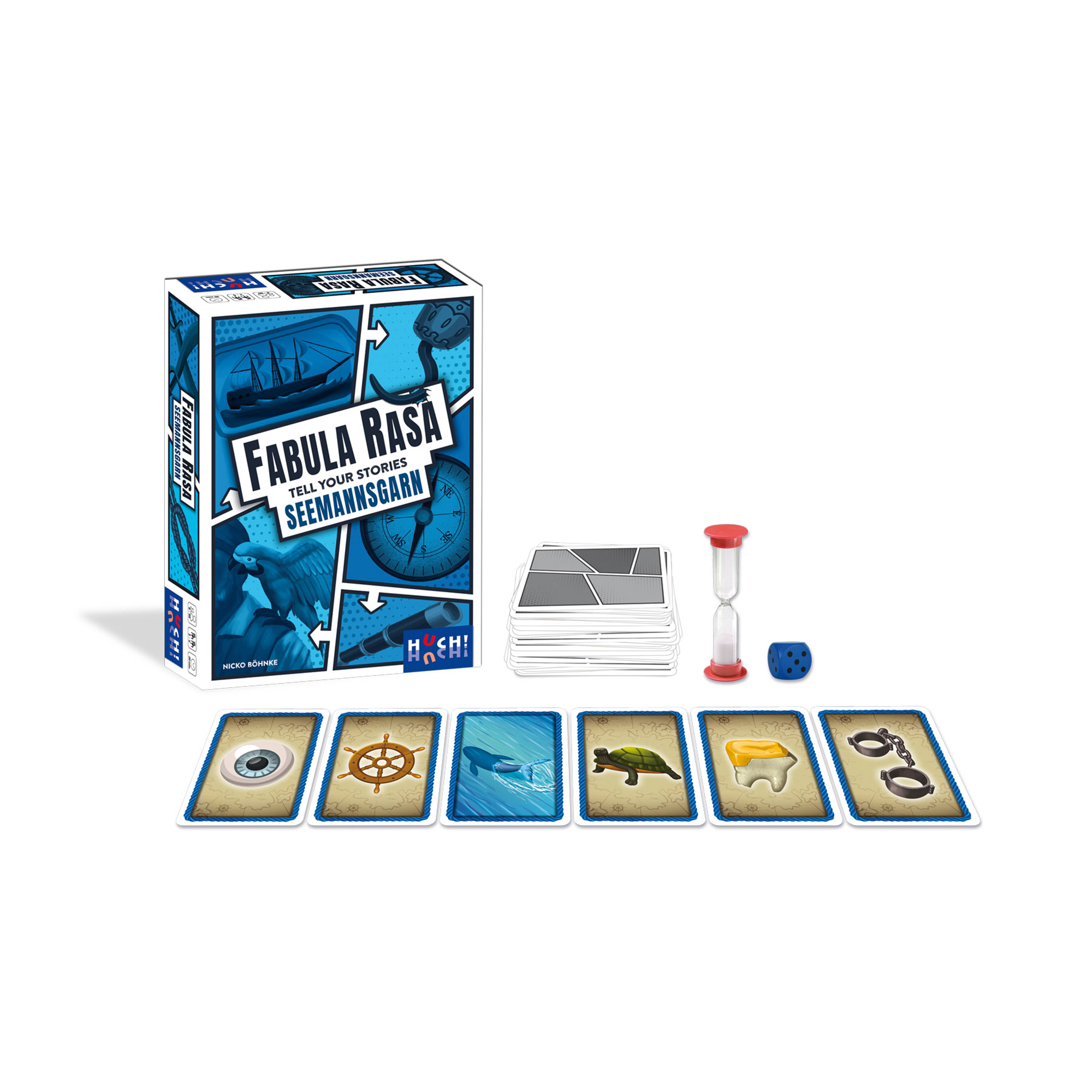 In Fabula Rasa, players take turns telling a constantly changing story as is typical of oral traditions. The motifs on the cards provide visual bullet points for people, objects, and locations that are central to the action — things that must be remembered in the correct order, with cards disappearing and new ones being added each round. Those who, as a narrator, manage to present their version of the story without errors will be rewarded accordingly. In Fabula Rasa: Seemannsgarn, players slip into the role of sea dogs who tell each other all sorts of fantastic stories in the harbor bar about sunken ships, treasure maps, pirates, mysterious islands, dangers, and adventures at sea. Fabula Rasa – Seemannsgarn contents: 55 cards, 1 dice, 1 hourglass, 1 game instruction.