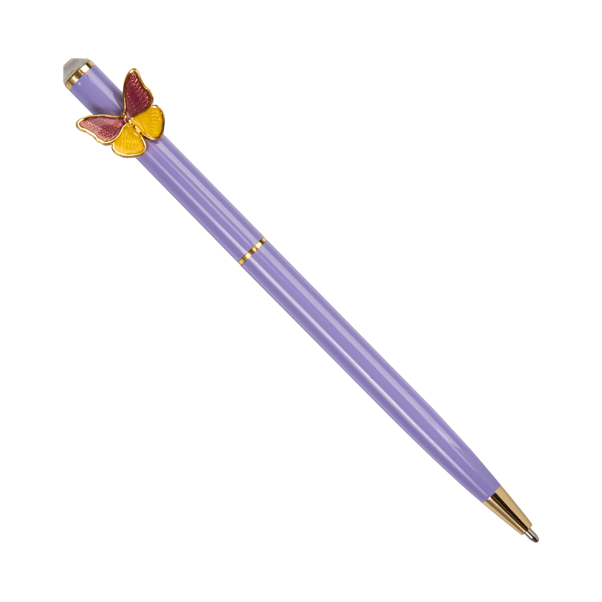 Elegantní fialová propiska je zdobená jemným motýlkem a třpytivým kamínkem na vršku, který jí dodává nádech luxusu. Propiska se pak otevírá praktickým otočením spodní části a dobře padne do ruky – ideální do práce i do školy. Barva inkoustu: modrá