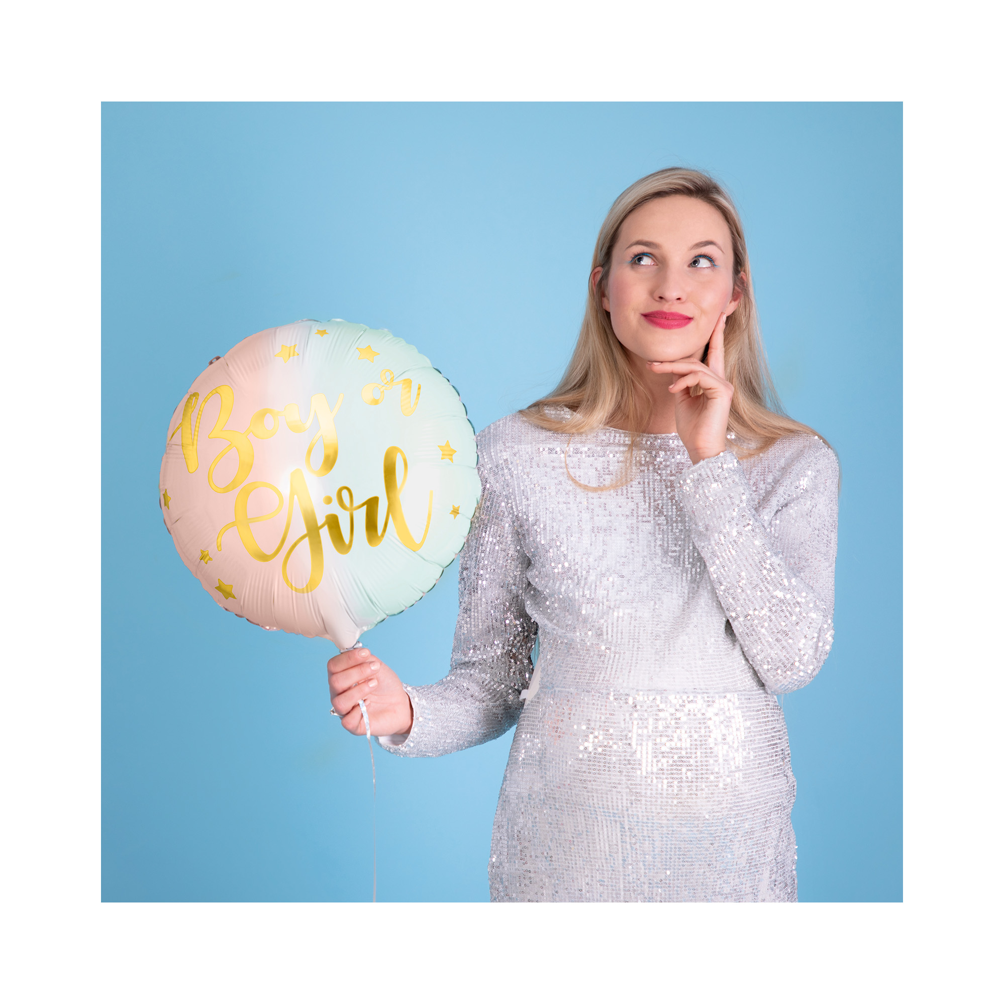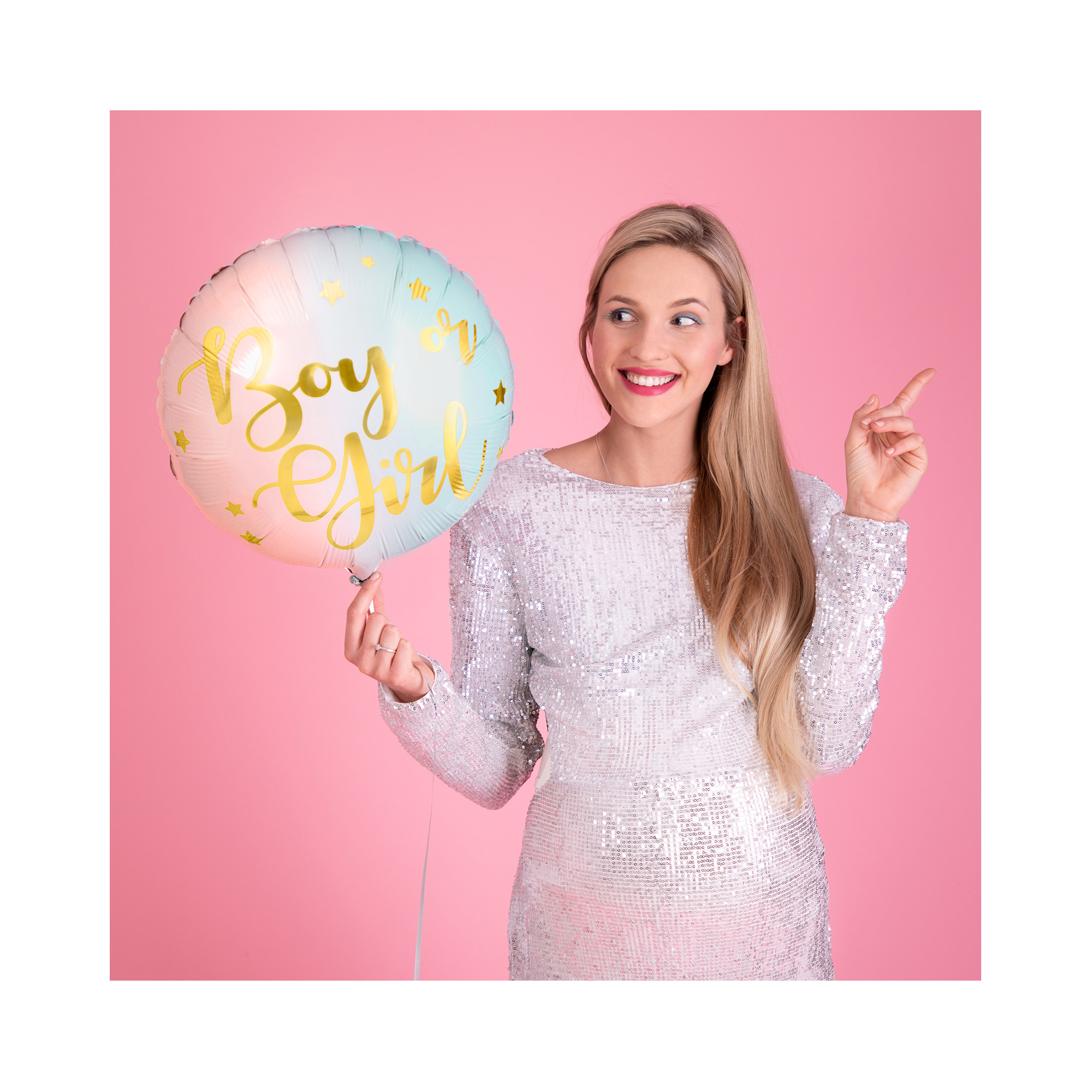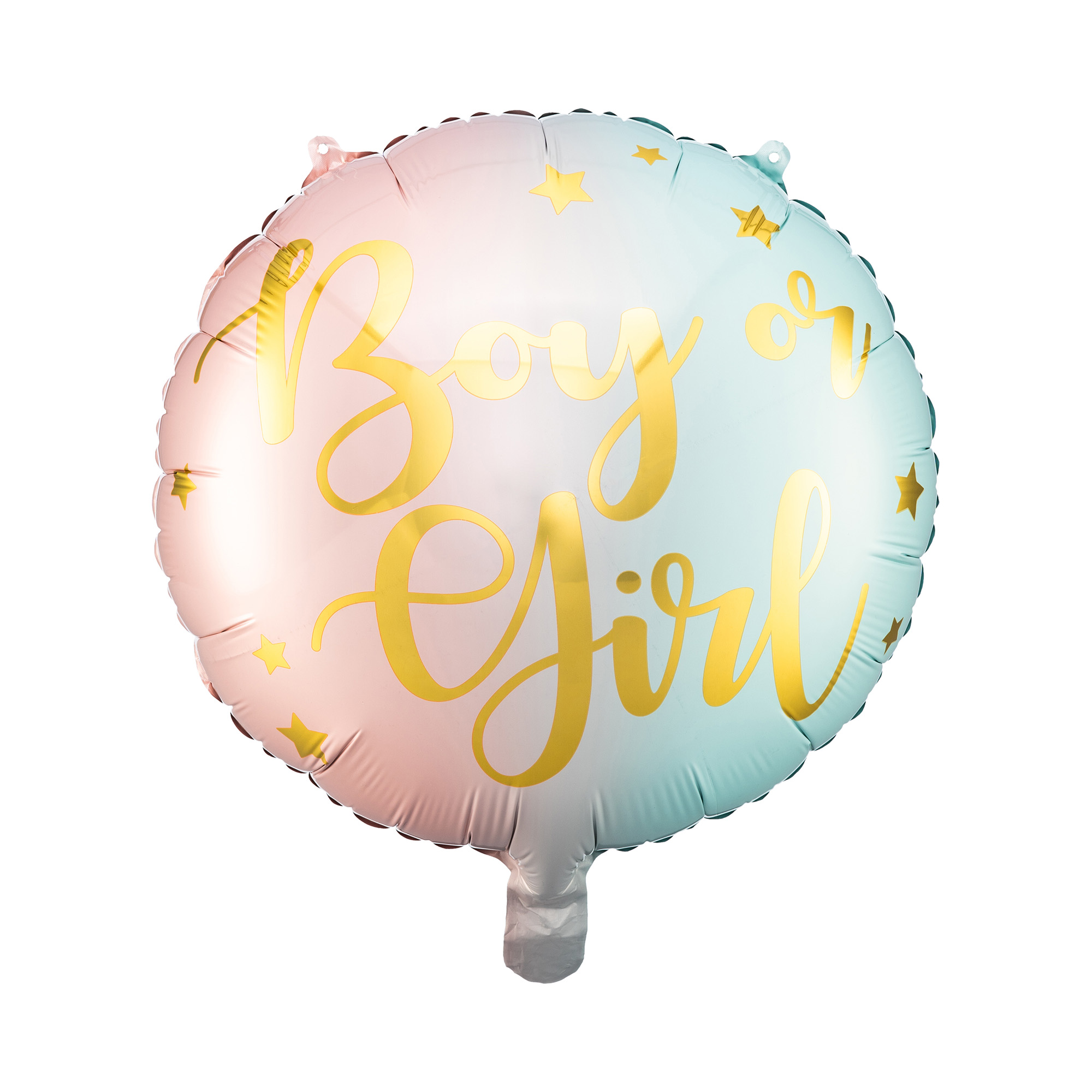 Kulatý fóliový balónek vhodný pro baby shower, kde se představí pohlaví očekávaného miminka. Tento balónek je laděný do růžové a modré barvy a má na sobě zlatý potisk nápisu "Boy or Girl". Pro další dekorace a doplňky ve stejném tématu můžete prozkoumat kategorii Baby shower a narození dítěte. Velikost/rozměr: 18" – 45 cm (po nafouknutí cca 35 cm) Materiál: pevná fólie Balení obsahuje: 1 ks balónku Balónky je možné nafukovat vzduchem i heliem.