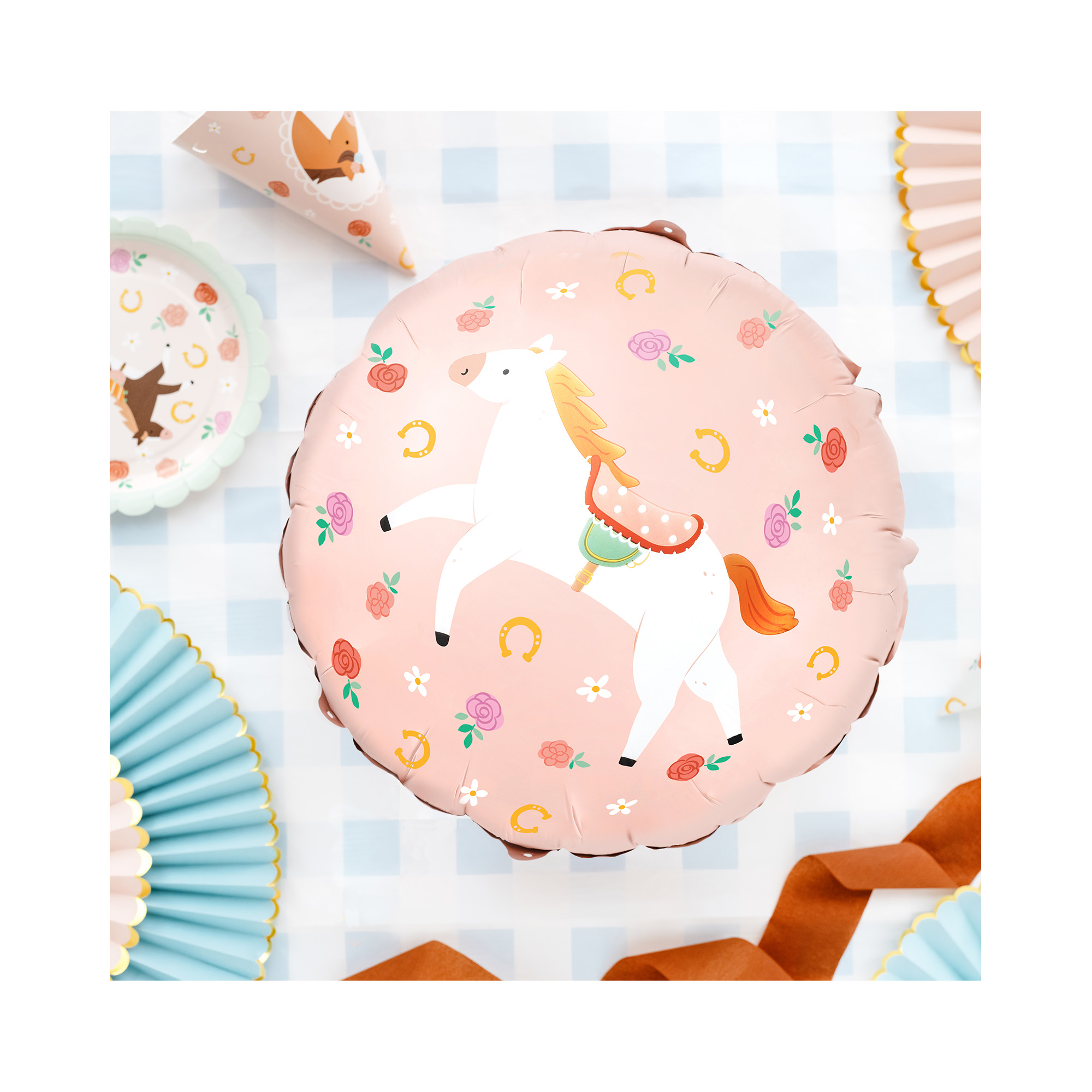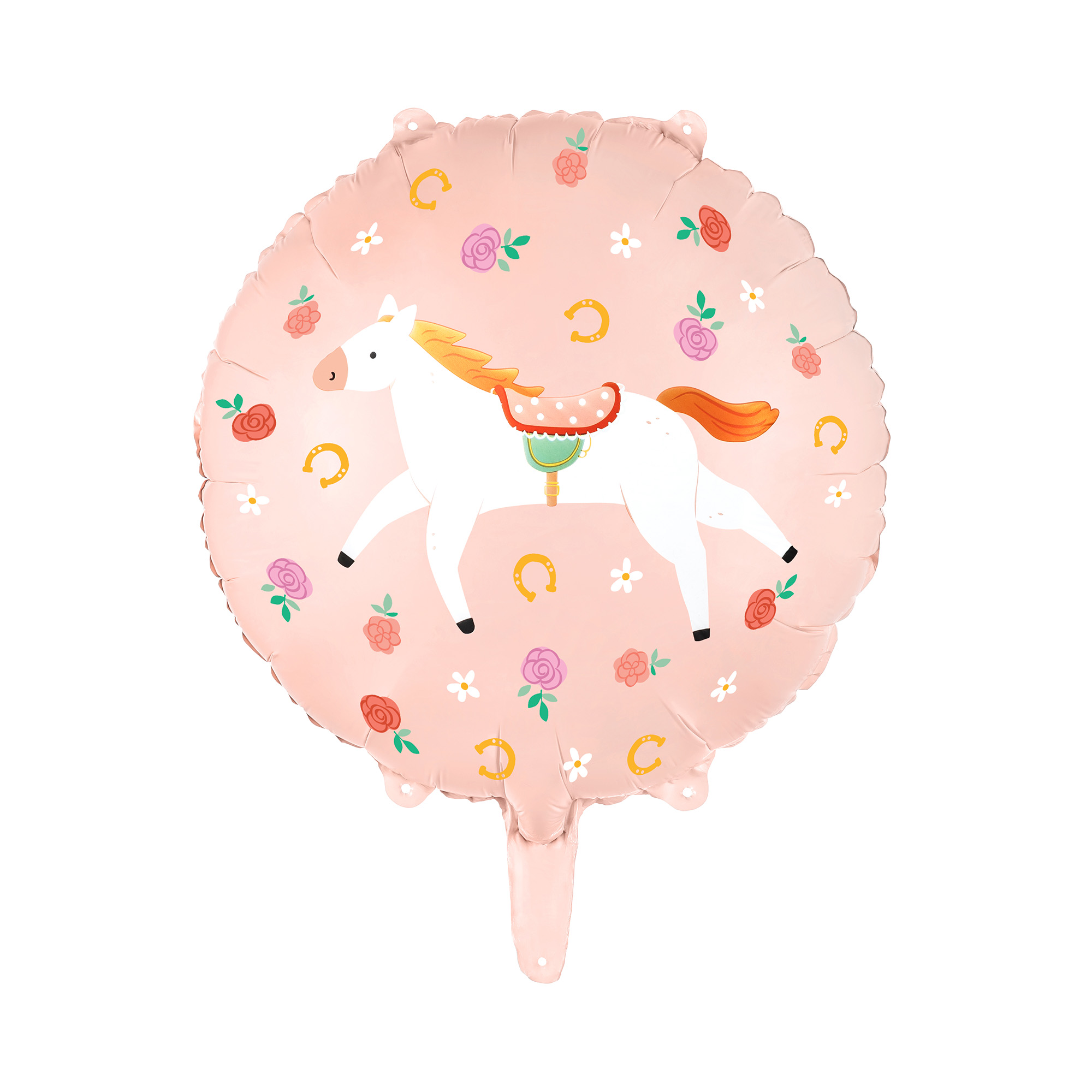 Kulatý fóliový balónek s roztomilým potiskem koníka, květin a podkov jistě potěší všechny holčičky a vykouzlí nezapomenutelnou výzdobu na tematické oslavě nebo párty. Tento balónek je laděný do růžové barvy a můžete ho kombinovat s dalšími párty dekoracemi a doplňky s koňským motivem. Velikost/rozměr: 18" – 45 cm (po nafouknutí cca 35 cm) Materiál: pevná fólie Balení obsahuje: 1 ks balónku a brčko pro snadné nafouknutí Balónky je možné nafukovat vzduchem i heliem.