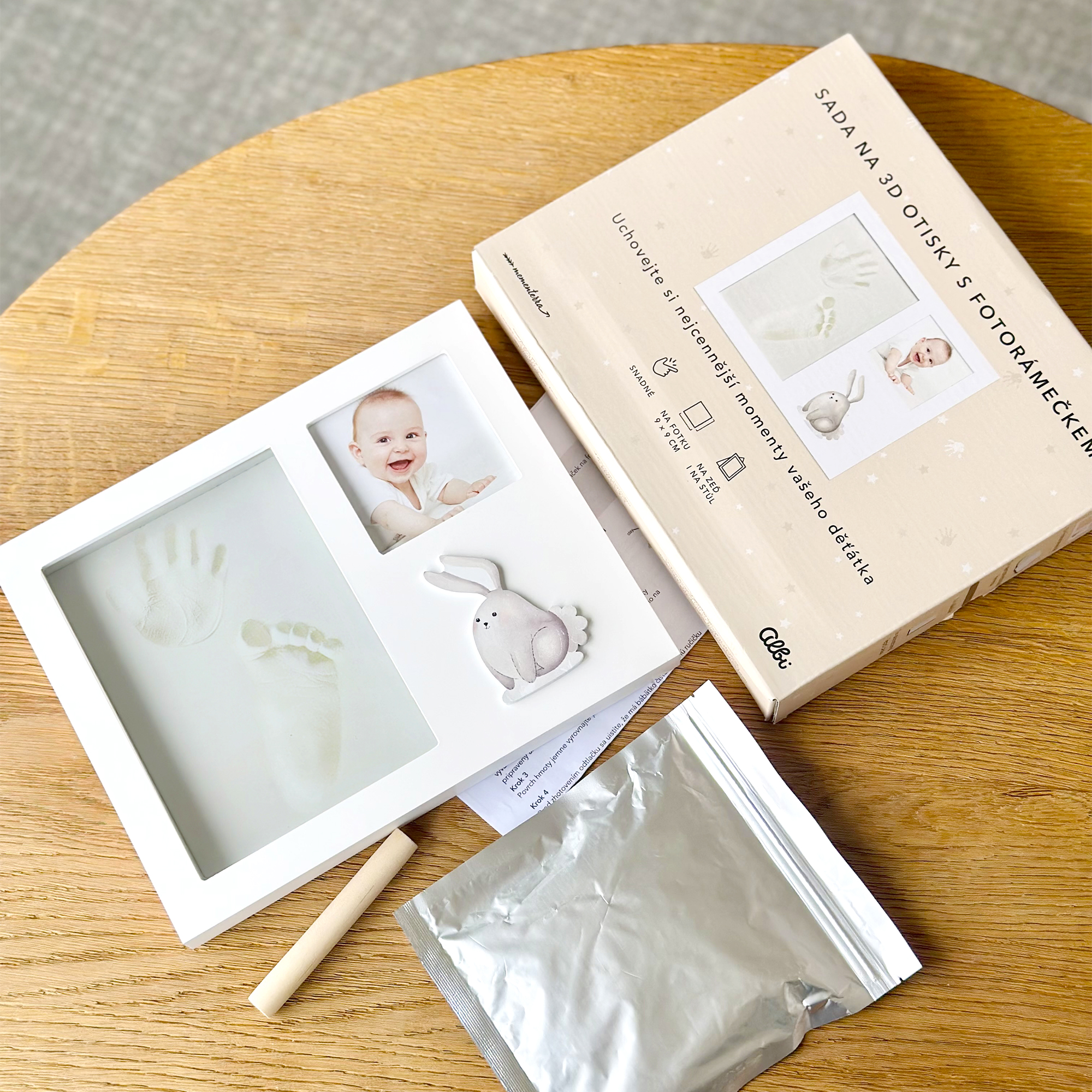 První dotyk, první krůčky, první úsměv – zachyťte ty nejcennější okamžiky života vašeho děťátka v jedinečném fotorámečku. Spojením fotografie a 3D otisku ručičky či nožičky vytvoříte krásnou vzpomínku, která vám bude dělat radost každý den. Fotorámeček pro miminko se sadou na 3D otisky je navržen v jemném a elegantním stylu, doplněný o roztomilou ilustraci zajíčka, která dodá vašemu domovu hravý a něžný nádech. Součástí balení je sada na vytvoření otisků ze samotvrdnoucí hmoty v bílé barvě, která je bezpečná pro dětskou pokožku, a návod, který vás provede celým procesem. Rámeček můžete snadno postavit na poličku, stůl nebo zavěsit na zeď. Perfektní dárek pro nastávající rodiče, ke křtinám nebo jako milá připomínka na oslavu narození miminka. Spojení fotografie a otisků vytváří jedinečný a osobní dárek, který potěší každou rodinu. Balení obsahuje: bílý fotorámeček, sadu na otisky: samotvrdnoucí hmotu v bílé barvě (bezpečná pro dětskou pokožku), váleček, oboustrannou lepicí pásku a návod. Velikost rámečku: 21,6 × 26,5 × 2,2 cm Vhodný na fotografii o rozměru: 9 × 9 cm