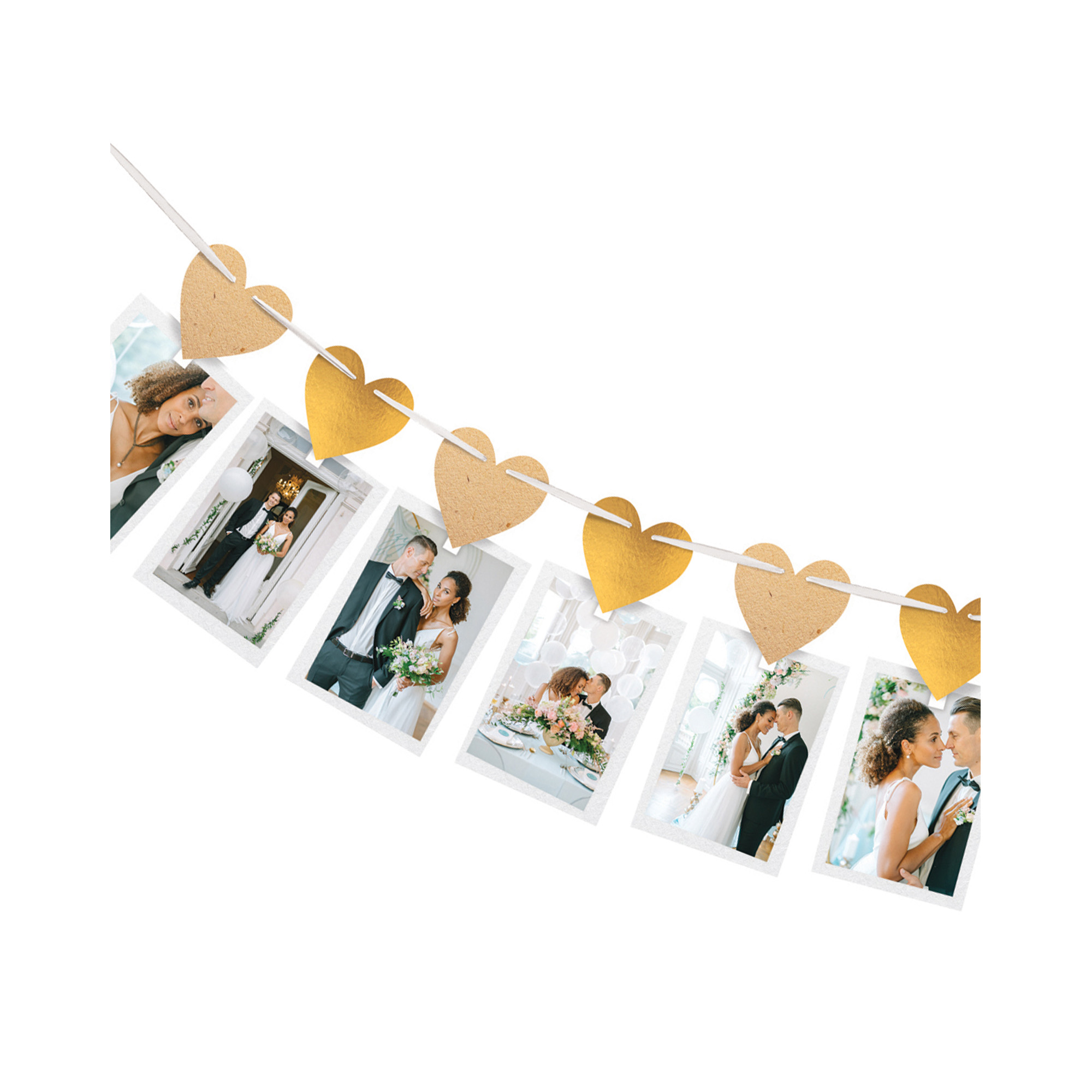 Svatební girlanda skvěle ladí v kombinaci s dalšími produkty v sekci Tématické oslavy – Svatba a rozlučka. Girlanda obsahuje srdíčka s kolíčky, na které lze připnout fotografie či jiné vzpomínkové karty. Balení obsahuje: 1 ks girlandy