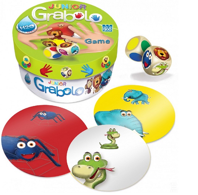 Grabolo Junior je dětská varianta úspěšné postřehové karetně-kostkové hry. Hráči v ní uplatní nejen rychlé ruce, ale i dobrou paměť. karty jsou vyrobeny z plastu, a tak odolají i hře u vody. Hra Grabolo Junior je uložena v elegantní a praktické plechové krabičce. Uvnitř na hráče čekají kulaté různě barevné karty, které na sobě mají obrázky zvířat. Hráči vždy hodí 2 kostkami. Jejich kombinace určí hledanou barvu a obrázek. Úkolem hráčů je co nejrychleji tuto kombinaci nalézt a zakrýt ji rukou. Komu se to podaří, kartu získává. V případě, že se na stole daná kombinace nevyskytuje, snaží se hráči tipnout si, kdo takovou kartu vlastní. Hráč, který se trefí, kartu získává. Hráč, který se naopak splete, musí jednu svou kartu vrátit do hry zpět.Ve hře tak není důležitý jen postřeh, ale i dobrá paměť. Karty ve hře Grabolo Junior jsou plastové. Mají tak opravdu vysokou životnost a přežijí i případnou nehodu s rozlitým nápojem. Hra obsahuje: 36 kulatých plastových karet, barevnou a obrázkovou kostku.