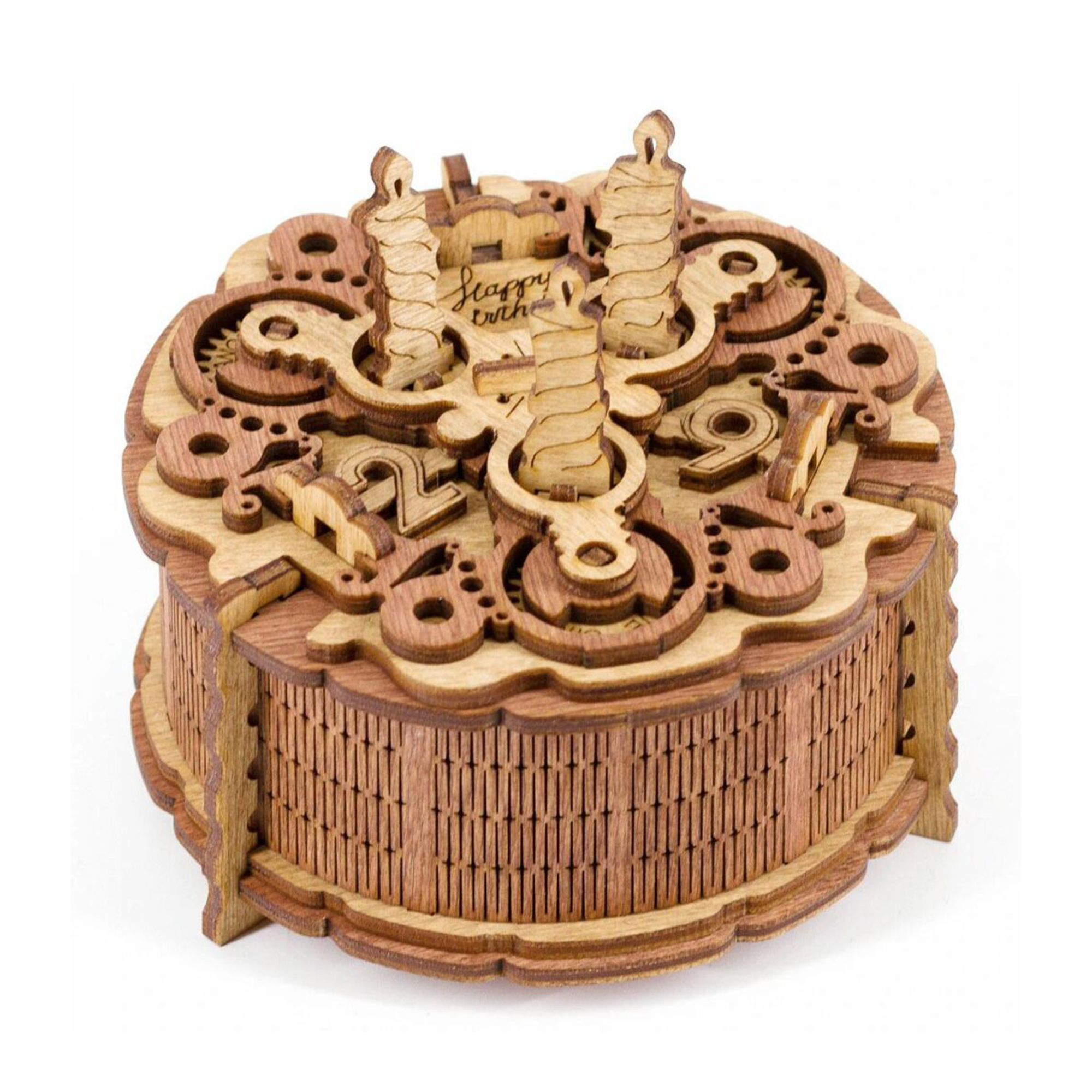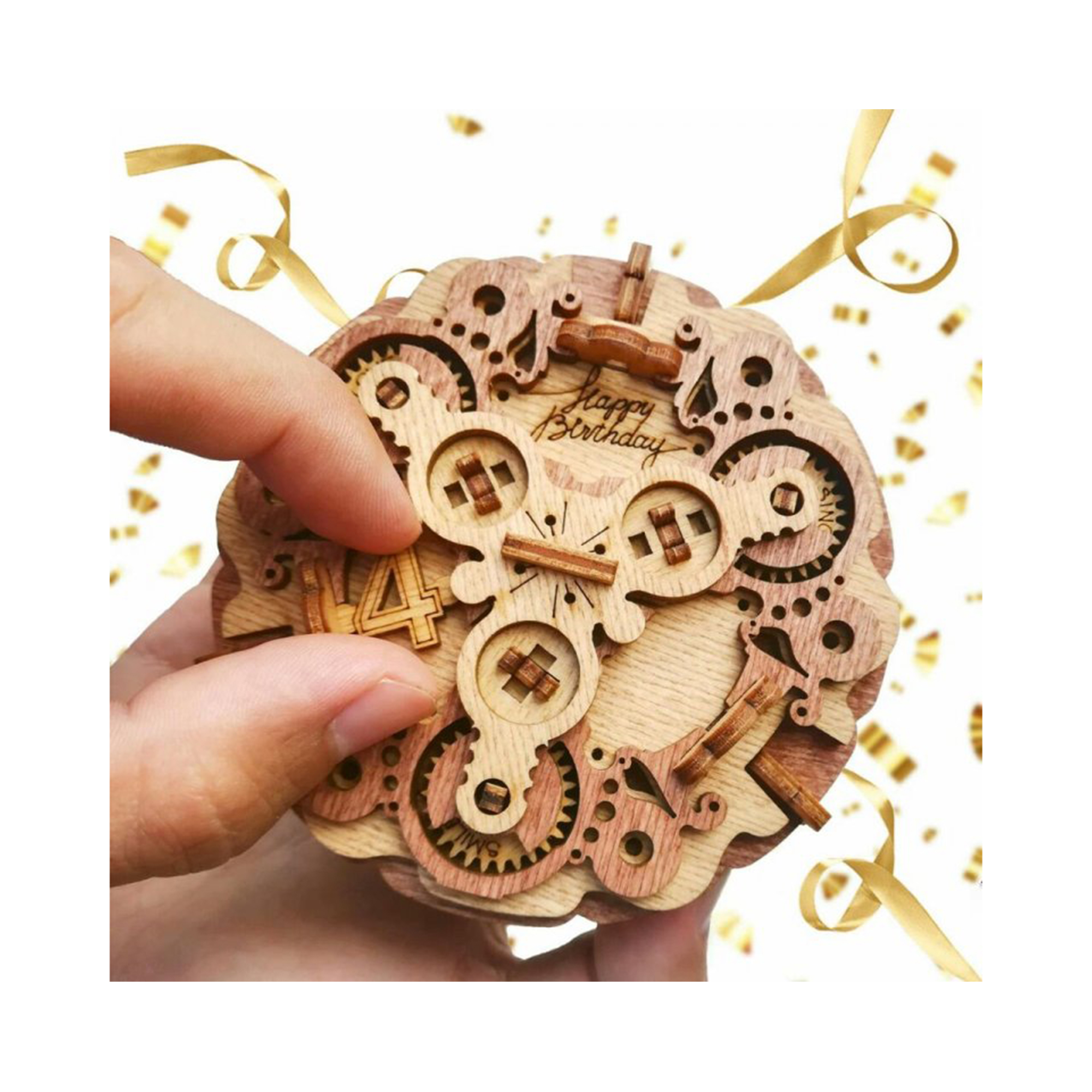 Narozeninový dort je mechanická dřevěná krabička s tajným trezorem uvnitř, která slouží jako jedinečná dárková krabička. K otevření krabice je třeba vyřešit 3 hádanky, což trvá přibližně 15 minut. Věk obdarovaného lze upravit na narozeninovém dortu pomocí přiložených číslic. Díky tomu je hlavolam ještě individuálnější. Tato krabička je inovativní nápad na narozeninový dárek pro zvědavé nadšence hádanek! Peněžní dárky, poukázky nebo menší předměty lze uvnitř dokonale schovat. hlavolam je vyroben z udržitelného břízového dřeva – všechny komponenty jsou řezány nejkvalitnější laserovou technologií, opatřeny výraznými detaily a sestavovány ručně. Dárková přihrádka má průměr 9,5 cm a výšku 3,5 cm.
