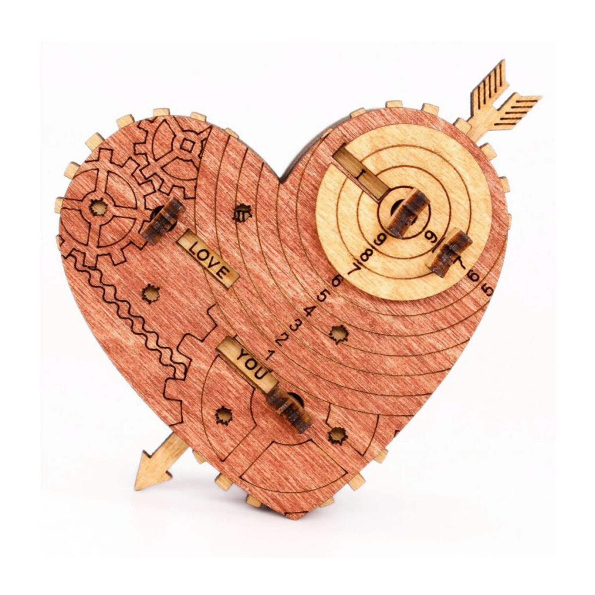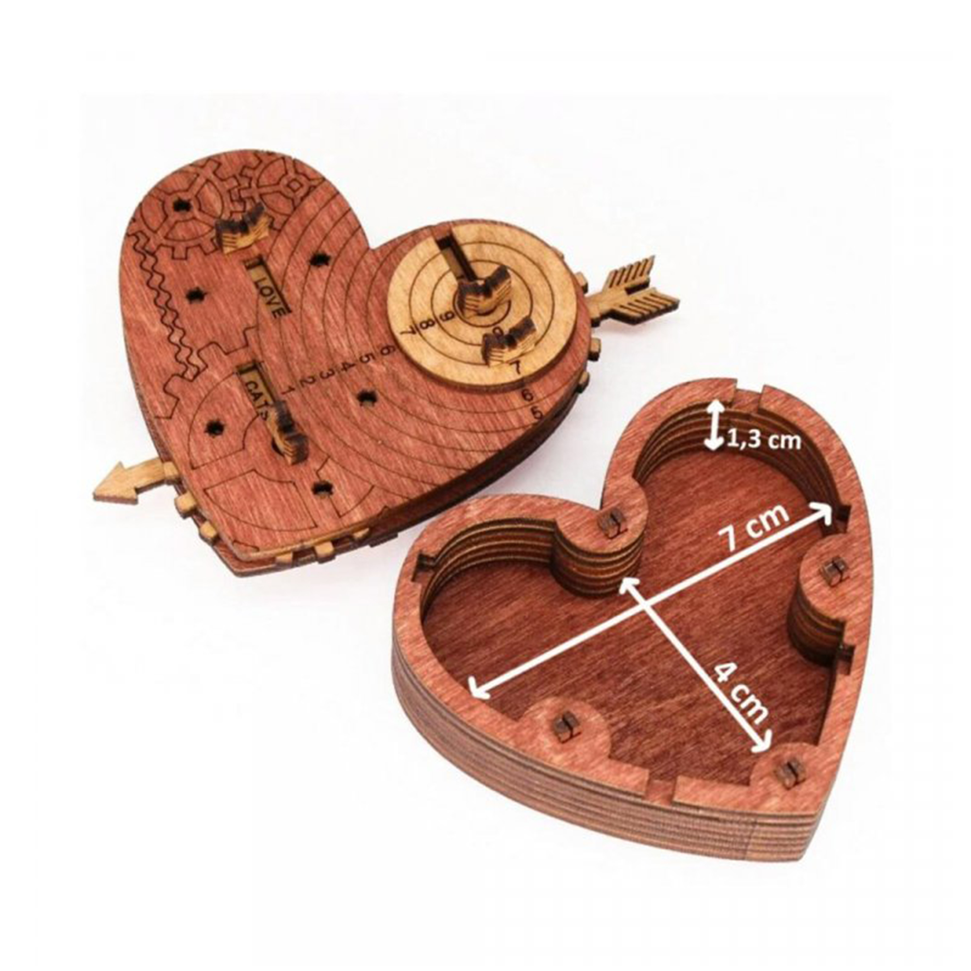 Tento hlavolam byl vyvinut jako zábavná krabička na Valentýna nebo jinou podobnou příležitost. Klíčem k otevření trezoru je věta složená ze 3 slov, která lze změnit – na každém ze 3 koleček je 8 slov a dohromady je více než 50 možných kombinací. Výchozí kód je „I LOVE YOU“. Kód se skládá ze 3 slov a z uvedených možností si můžete vybrat kombinaci, která vám nejvíce vyhovuje: kolečko 1: I, SAVE, I’M, YOU’RE, FIND, BE, TAKE, OPEN kolečko 2: LOVE, HATE, BEST, SWEET, MY, YOUR, WANT, LUCKY kolečko 3: YOU, PUZZLE, HEART, SEX, JULIET, BEER, VEGGIE, ROMEO Tímto jedinečným dárkem se zaručeně dostanete do srdce vaší drahé polovičky. Rozměr srdce: 7 × 4 × 1,3 cm