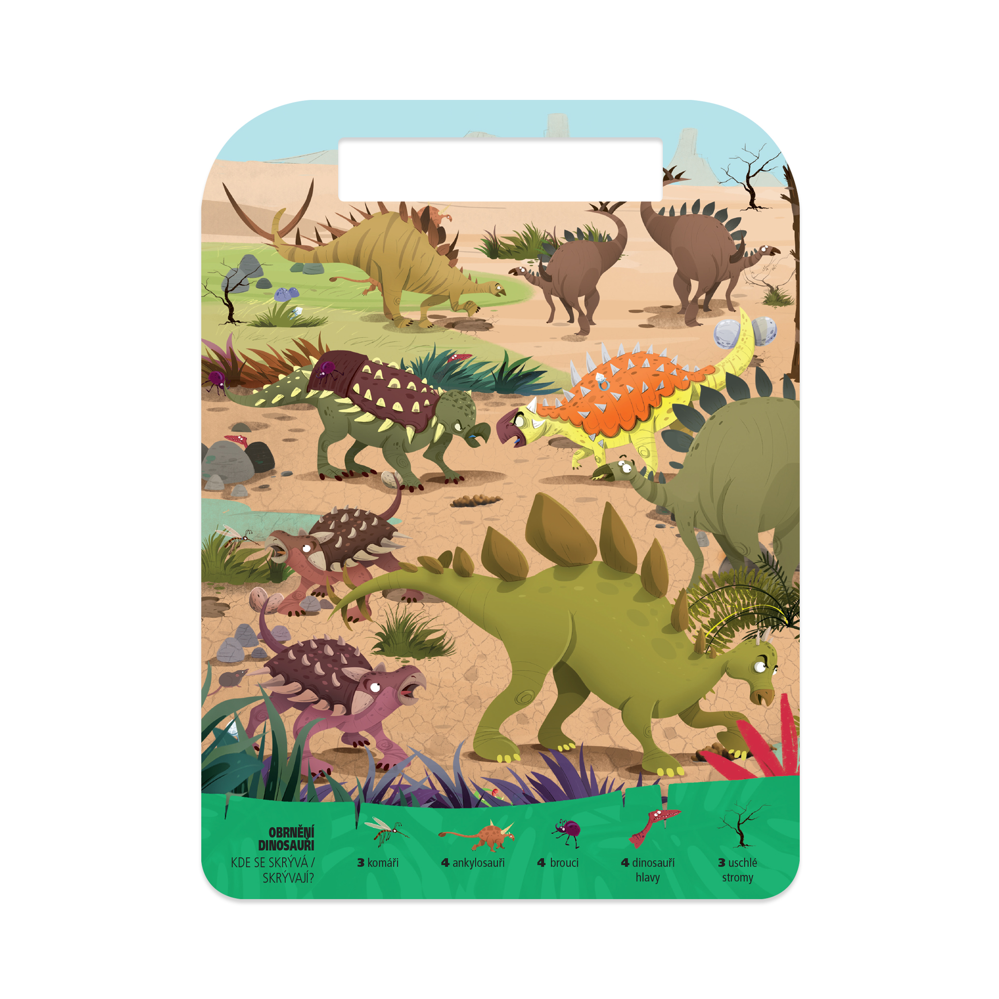 Najděte na každé stránce obrázky, které jsou dole zobrazené. Některé jsou tam dokonce vícekrát a všude se skrývá i nějaký ten vetřelec. Najdete je všechny?  Pokud máte už vyplněno, můžete vše smazat a zkusit řešit znovu. Do sešitu se totiž píše fixem, který lze pomocí papírového ubrousku opět vymazat.  Hledej a najdi rozvíjí jemnou motoriku, zrakové vnímání, koncentraci a představivost. Zabaví všechny děti od 4 let. Hledej a najdi: Dinosauři – Kvído obsahuje: 22 stránek na hledání obrázků, mazatelný fix.