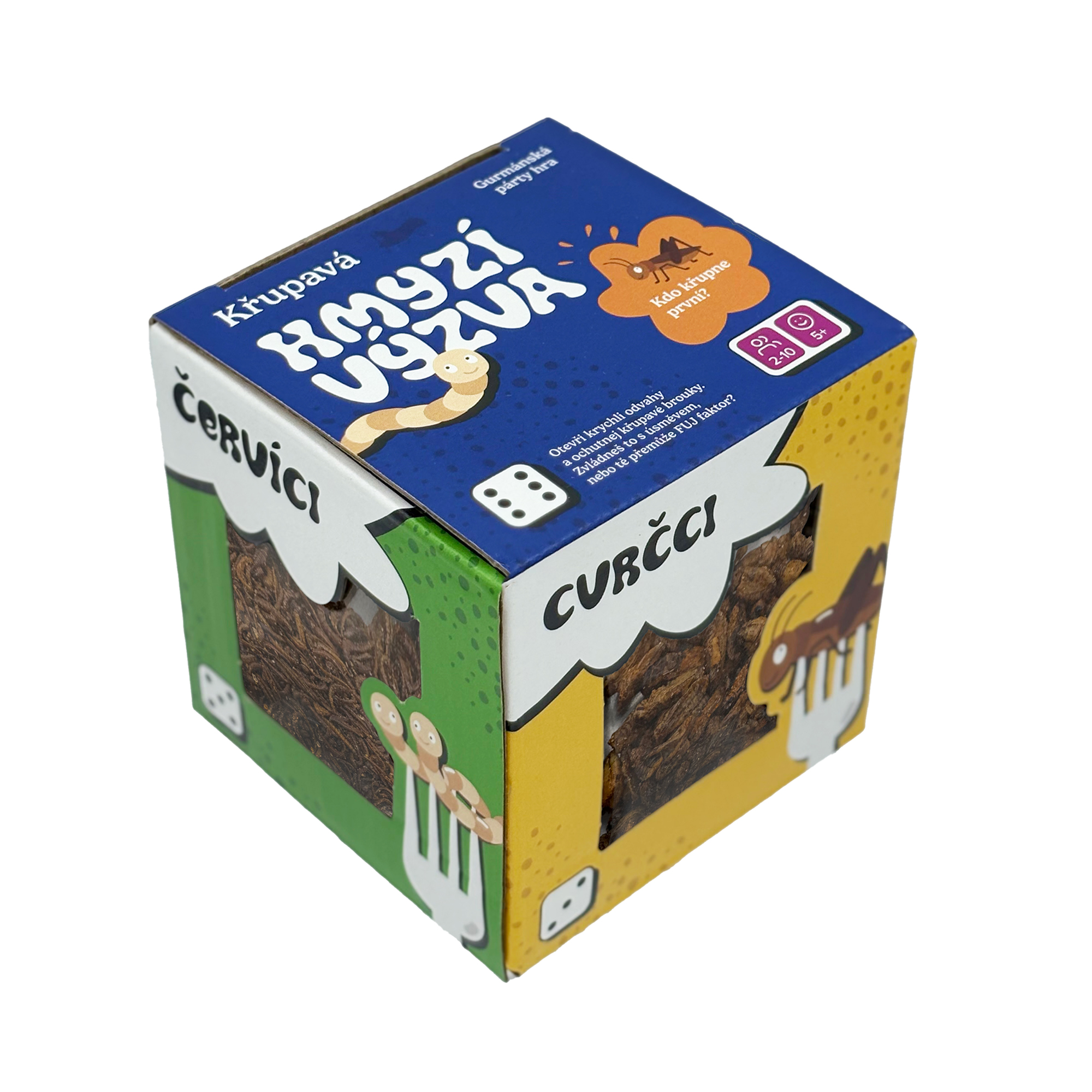 Kostka, která rozproudí večer! Pro rodiny, kamarády i zvědavé gurmány. Jednoduchá pravidla, pár soust k odvaze a spousta smíchu. Ideální vánoční dárek, který opravdu překvapí! Kostka nabízí 3 snadné hry a 4 příchutě: červy s česnekem a bylinkami, cvrčky v příchuti chilli a limeta, sarančata v parmazánu a červíky v příchuti slanina. Hoďte kostkou, otevřete sáček a ochutnejte! Hmyzí výzva Složení: Křupavé pražené kobylky (3g): saranče stěhovavé (Locusta migratoria) (100%). Pražení červíci bufallo (5g): potemnik stájový (Alphitobius diaperinus) (100%). Pražení červíci (5g): potemník moučný (Tenebrio molitor) (100%). Křupaví cvrčci (5g): cvrček domácí (Acheta domesticus) (100%). Alergeny: obsahuje korýše a měkkýše (2,14), může obsahovat stopy obilovin obsahující lepek a soju (1,6) Výživové údaje na 100 g – Křupavé pražené kobylky: energetická hodnota 2374kJ/559 kcal tuky 38,1 g – z toho nasycené mastné kyseliny 13,1 g sacharidy 1,1 g – z toho cukry 0 g vláknina 8,4 g bílkoviny 48,2 g sůl 0 g Výživové údaje na 100 g – Pražení červíci bufallo: energetická hodnota 1477kJ/353 kcal tuky 24,2 g – z toho nasycené mastné kyseliny 8 g sacharidy 6,7 g – z toho cukry 0 g vláknina 5,2 g bílkoviny 52,2 g sůl 0 g Výživové údaje na 100 g – Pražení červíci: energetická hodnota 1825kJ/435 kcal tuky 18,5 g – z toho nasycené mastné kyseliny 7 g sacharidy 2,38 g – z toho cukry 0 g vláknina 12,9 g bílkoviny 58,1 g sůl 1,71 g Výživové údaje na 100 g – Křupaví cvrčci: energetická hodnota 1477kJ/353 kcal tuky 19 g – z toho nasycené mastné kyseliny 7,8 g sacharidy 5,5 g – z toho cukry 0 g vláknina 8,8 g bílkoviny 65 g sůl 0,44 g Po otevření ihned spotřebujte.
