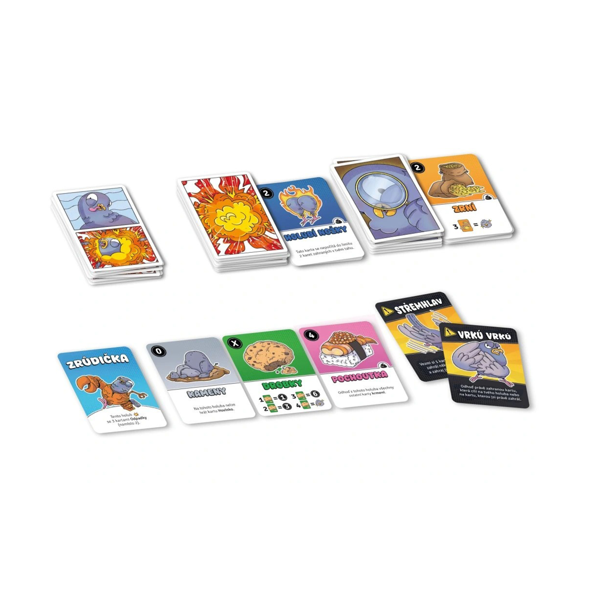 Šílená karetní hra, která vám z kamarádství nadělá holubník! Nakrmte své holuby k maximální spokojenosti a snažte se překrmit ty soupeřovy tak, aby vybuchli! Čeká vás 20 ujetých holubů s ulítlými schopnostmi, volervoucí holubí gastronomie a akční karty, díky kterým můžete pěkně zavařit soupeřům. Hra Holubomby obsahuje: 88 karet hledání, 30 karet výbuchu, 20 karet holubů, 2 přehledové karty, pravidla hry.