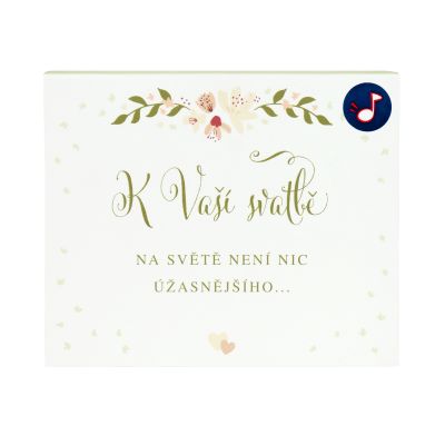 Hrací krabičky jsou perfektním tipem, když chcete darovat peníze, dárkovou kartu nebo i drobný dárek. Uvnitř krabičky je navíc malá obálka, kam lze hotovost nebo dárkovou kartu vložit. Po otevření krabičky začne hrát pěkná melodie. Doba hraní krabičky je cca 20 – 30 sekund. Vnější rozměry: 11 × 9 × 3,5 cm Vnitřní rozměry: 10,7 × 8 × 2,4 cm Rozměry obálky: 8,7 × 7,2 cm