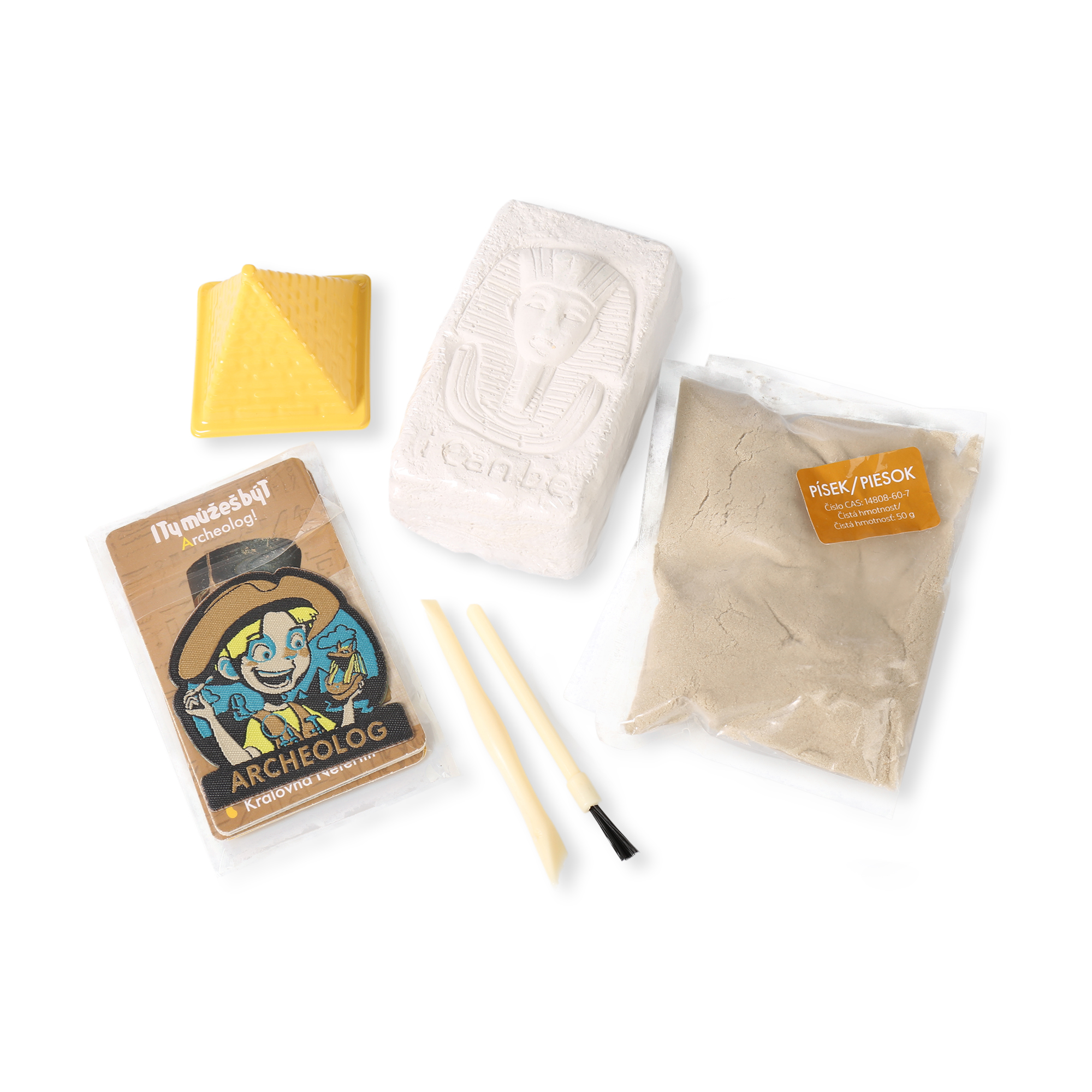 Nastartujte svou zvědavost a vydejte se na starověké dobrodružství. Vykopejte a prozkoumejte tajemné poklady nebo si vybudujte mini starověký Egypt díky formičce pyramidy a přiloženému písku. Díky 4 studijním kartám se děti dozví zajímavé informace. Přinášíme vám celou kolekci hravých sad, které dětem zábavnou formou přibližují svět různých povolání! Každá sada je naučí něco jiného – děti se mohou stát umělcem, paleontologem, geologem nebo třeba lovcem pokladů. Součástí každé sady je originální samolepící nášivka s logem, které si děti mohou sbírat jako odznaky svých dovedností. Ideální dárek pro malé badatele a tvořivé duše! Sada archeolog obsahuje: 1 dláto, 1 štětec, 1 blok na kopání, 1 sádrový prášek, 4 formy, 1 míchátko, 1 malířský štětec, 2 barvy, 4 studijní karty, 1 nášivku Paleontologa, návod.