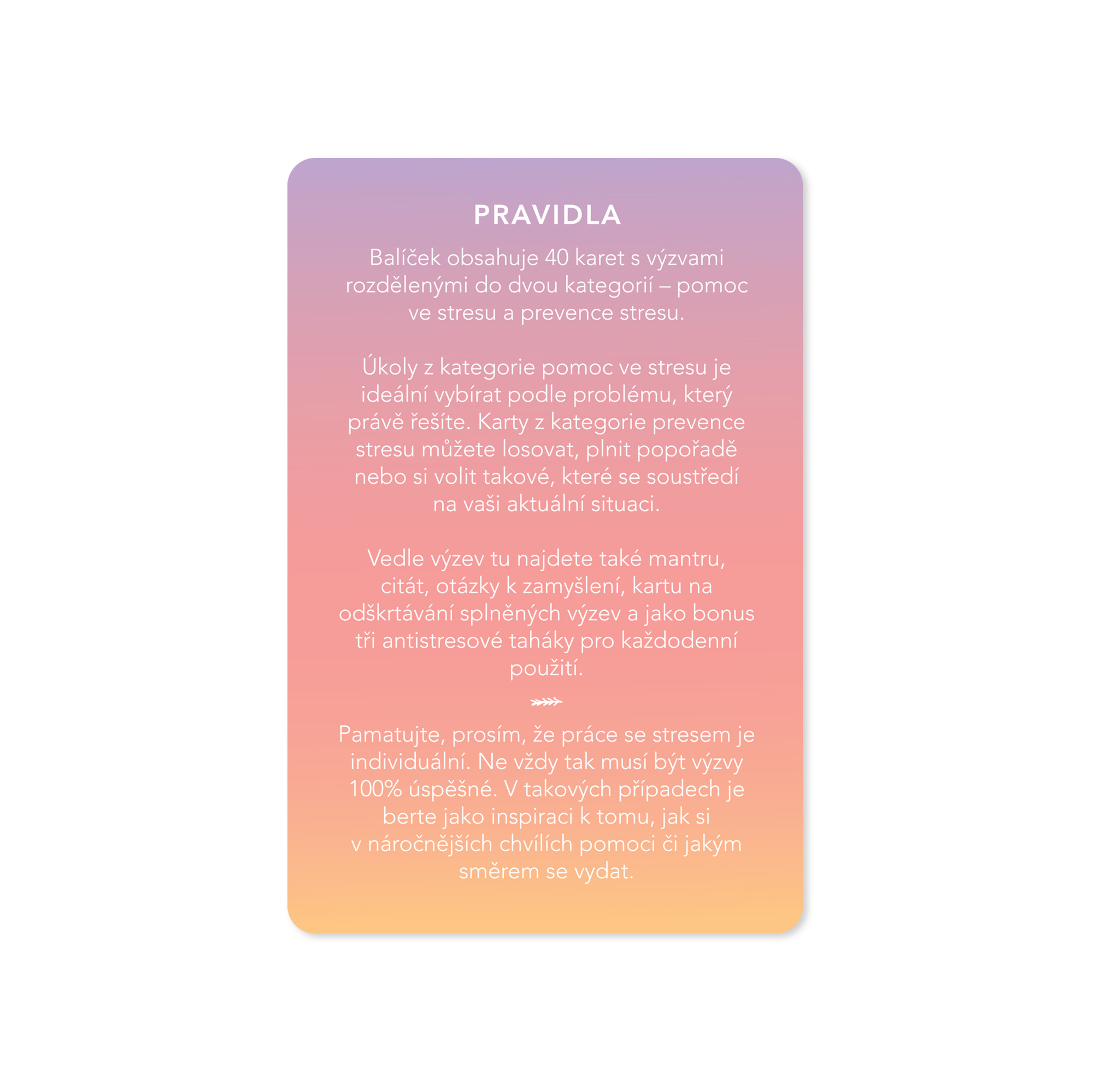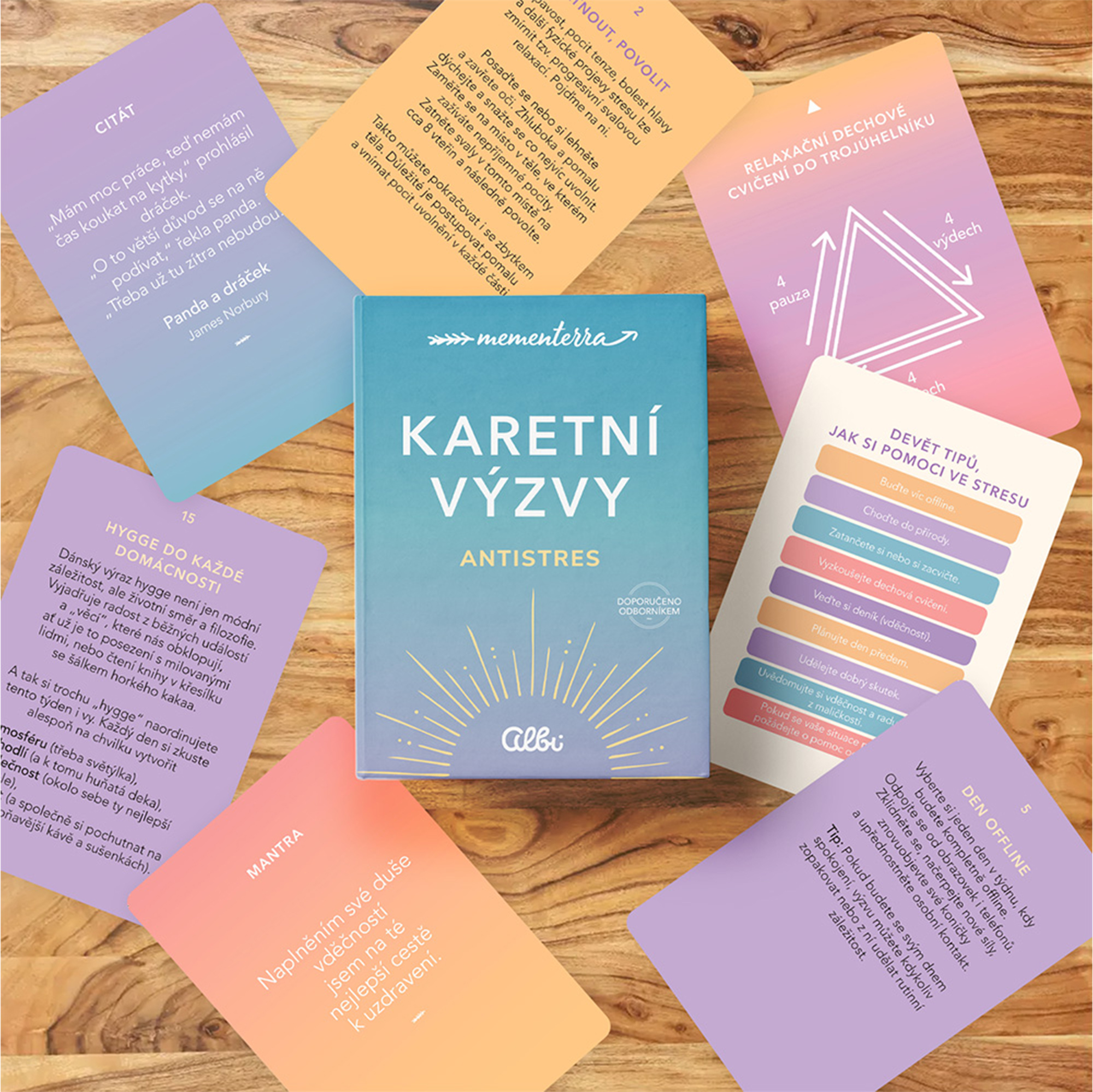 Antistresové karetní výzvy z edice Mementerra jsou speciálně sestaveny tak, aby vám pomohly nejen jako prevence, ale také v akutních případech, kdy už vám stres, úzkost či strach přerostly přes hlavu. pohyb, dechová cvičení, kreativní úkoly i vzdělávání. V tomto balíčku na vás čeká hned 50 karet, které vás provedou na cestě za radostnějším životem. Ať už vás trápí úzkost, stres, přepracování, nebo jen špatná nálada, vyzkoušejte tuto antistresovou hru, zaměřenou nejen na akutní stres, ale i na jeho prevenci. Výzvy tak lze používat jako rychlou antistresovou pomůcku, která vás provede účinnými a osvědčenými zklidňujícími technikami, ale i jako hravou formu sebevzdělávání a cesty za zdravými návyky. Balíček obsahuje 40 antistresových výzev rozdělených do 2 kategorií – pomoc ve stresu a prevence stresu. Vedle výzev najdete v balíčku také bonus v podobě 3 antistresových taháků pro každodenní použití (denní checklist, dechové cvičení, 9 tipů, jak si pomoci ve stresu) a 1 kartu s otázkami k zamyšlení, na které si zkusíte odpovědět po každé výzvě. Aby se vám v (ne)splněných výzvách lépe orientovalo, přidali jsme navíc kartu na odškrtávání hotových úkolů. Pro správné naladění tu zase najdete karty s tematickým citátem a mantrou, které si můžete dát do peněženky, diáře či na pracovní stůl jako mentální podporu a povzbuzení. Hra Karetní výzvy – Antistres obsahuje: 40 karet antistresových výzev, 2 úvodní karty k akutnímu stresu a k prevenci, 3 edukační karty pro každodenní použití, 1 pravidla pro plnění výzev, 1 kartu s otázkami k zamyšlení, 1 kartu na odškrtávání výzev, 1 kartu s tematickým citátem, 1 kartu s tematickou mantrou.