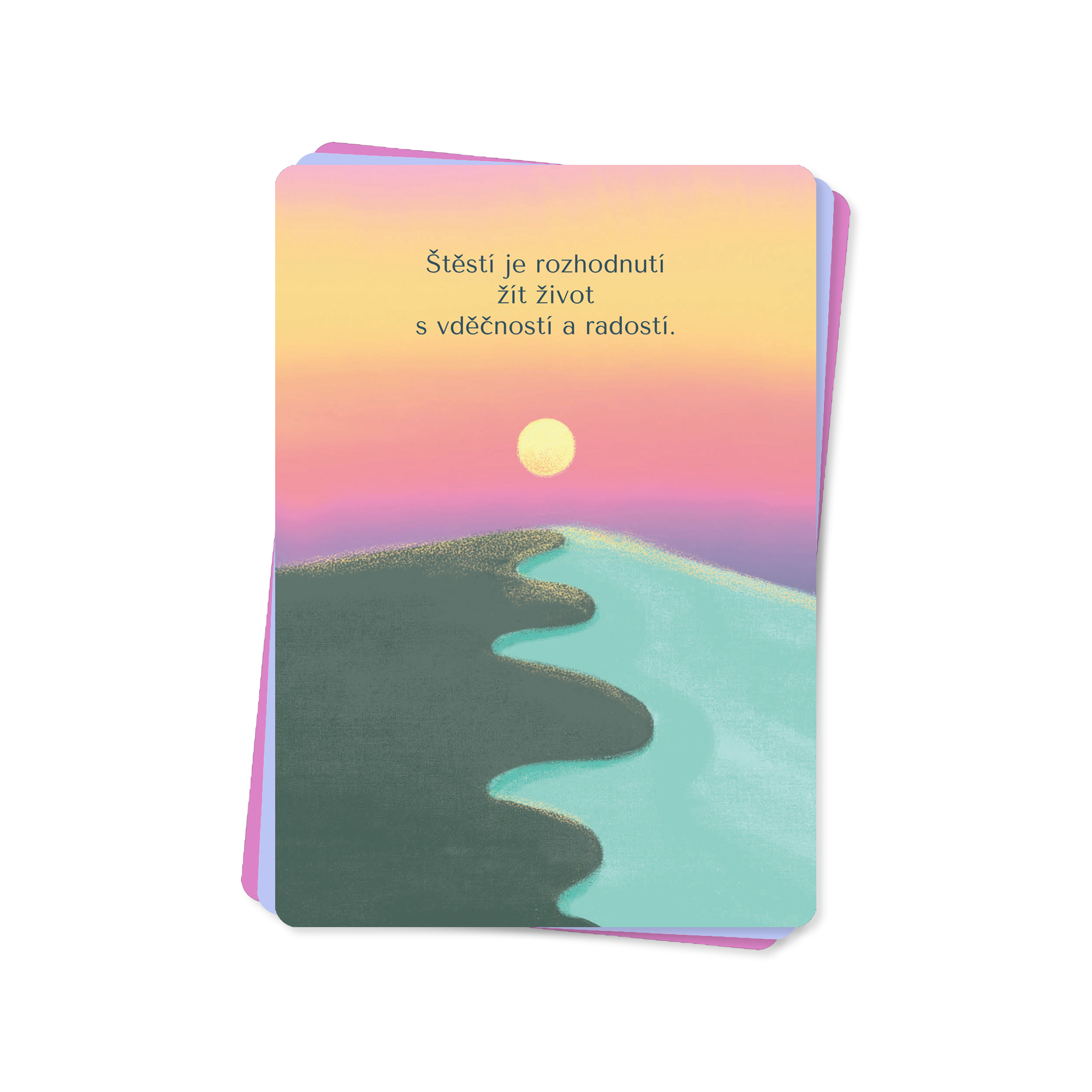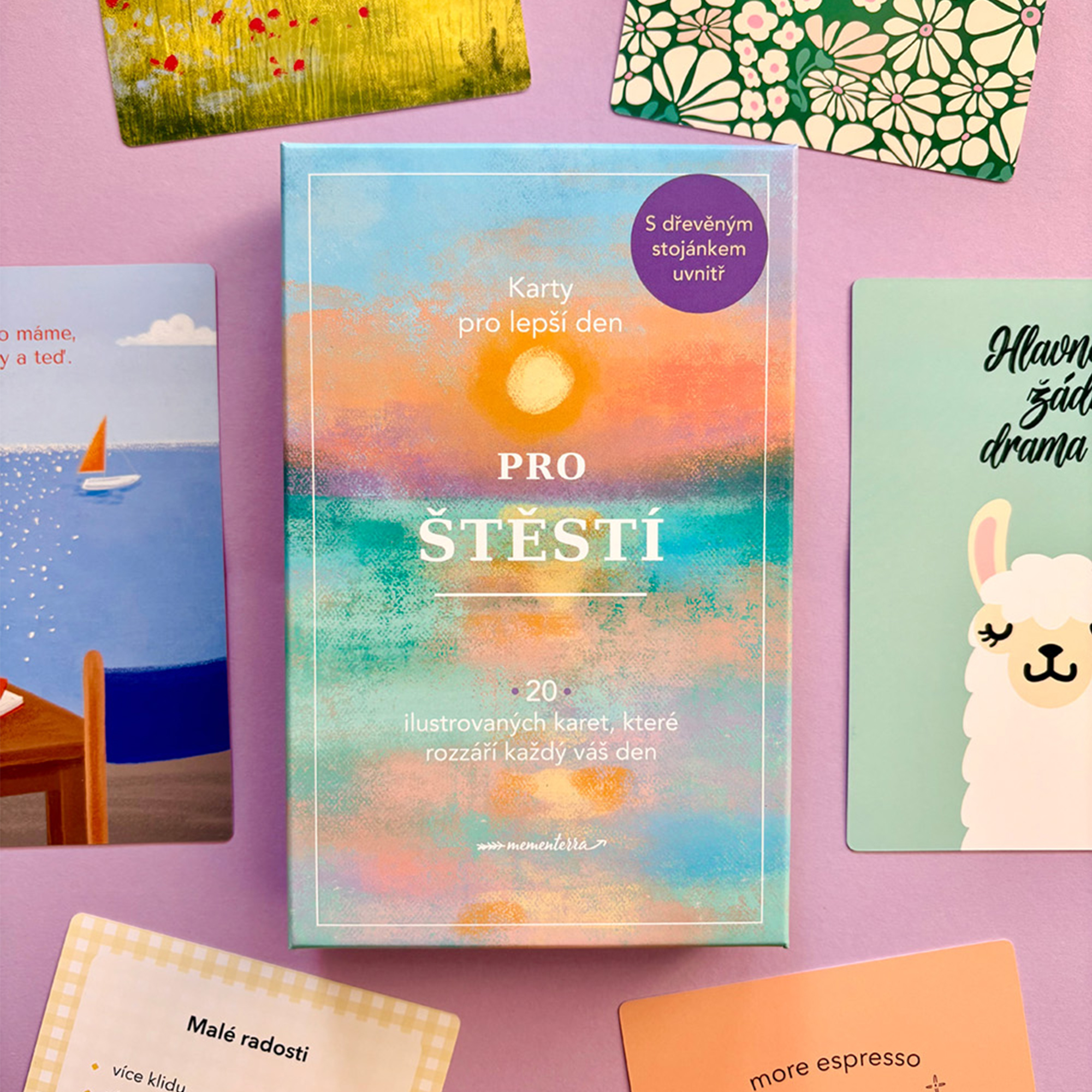 sada 20 ilustrovaných karet vám vnese do života povzbuzení i nadhled, který v každodenním shonu tak snadno ztrácíme. Pomohou vám zpomalit, naladit se na pozitivní vlnu a znovu si uvědomit, že štěstí máte často přímo před očima. Každá karta je oboustranná – na přední straně hezký motiv, na zadní malý vzkaz jen pro vás. karty libovolně střídejte podle nálady nebo dne. Součástí balení je dřevěný stojánek, takže si vybranou kartu můžete vystavit na pracovní stůl, noční stolek nebo kamkoli, kde se hodí trochu světla a dobré nálady. Sada Karty pro lepší den – Pro štěstí obsahuje: 20 oboustranných ilustrovaných karet a dřevěný stojánek.