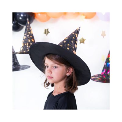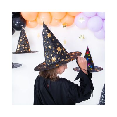 Klobouk Čarodějka má černou barvu a je ozdobený zlatým potiskem v podobě hvězd a hvězdného prachu. Tento klobouk má univerzální velikost a jistě bude slušet malým i větším čarodějkám. Využijete jej jako doplněk kostýmu k příležitosti pálení čarodějnic, na tematickou párty nebo pro Halloween. Pro další párty kostýmy a dekorace s touto tematikou můžete prozkoumat naše kategorie Pálení čarodějnic – párty nebo Halloween. Průměr: 38 cm Výška: 32 cm Průměr otvoru pro hlavu: 19 cm Balení obsahuje: 1 ks párty klobouku
