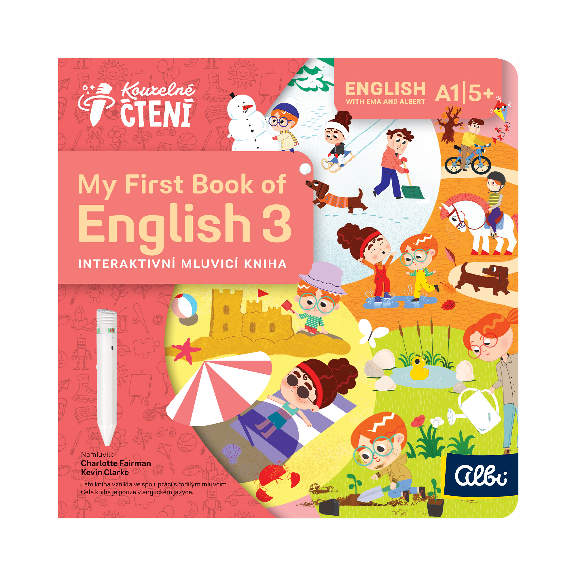 Co dělají Albert s Emou na jaře na zahradě? Čím se baví táta v létě u moře a máma na podzim v parku? A jak tráví čas děda s babičkou v zimě u vánočního stromku? Ema a Albert nás tentokrát provedou celým rokem a představí nám i svou rodinu. Děti se v každém prostředí seznámí s 10 slovesy a několika základními slovíčky. Každé slovo uslyší také ve větě a své znalosti si ověří pomocí kvízů. Součástí knihy jsou veselé písničky a melodie. Kniha My First Book of English 3 – Actions vznikla ve spolupráci rodilým mluvčím a pedagogem Dunstanem Clarkem. Kniha obsahuje více než 1 200 zvukových stop. ZVUKOVÉ UKÁZKY Poslechněte si několik ukázek z knihy My First Book of English 3 – Kouzelné čtení. Jazyková úroveň: A1 Rozměry knihy: 23 × 23 cm Namluvili: Charlotte Fairman, Kevin Clarke Text: Šárka Parkanová, © 2025 Redakce obsahu: Šárka Parkanová Ilustrace: Gabriela Hloz, © 2025 Hudba: Studio Fontána spol. s r.o. ISBN: 978-80-7688-354-3 Vzniklo ve spolupráci se studiem Soundlab.