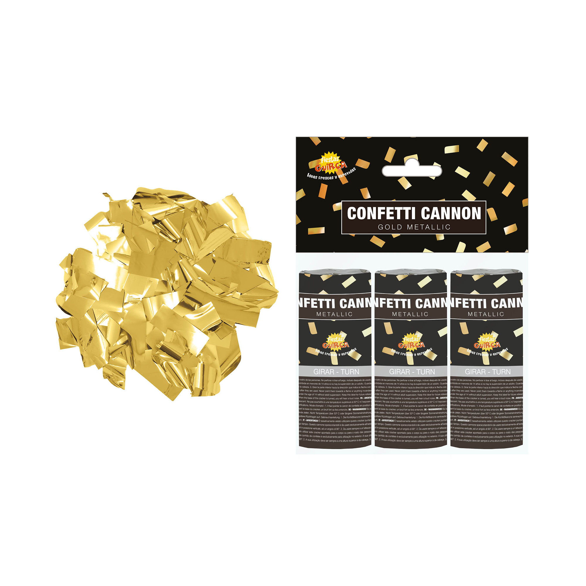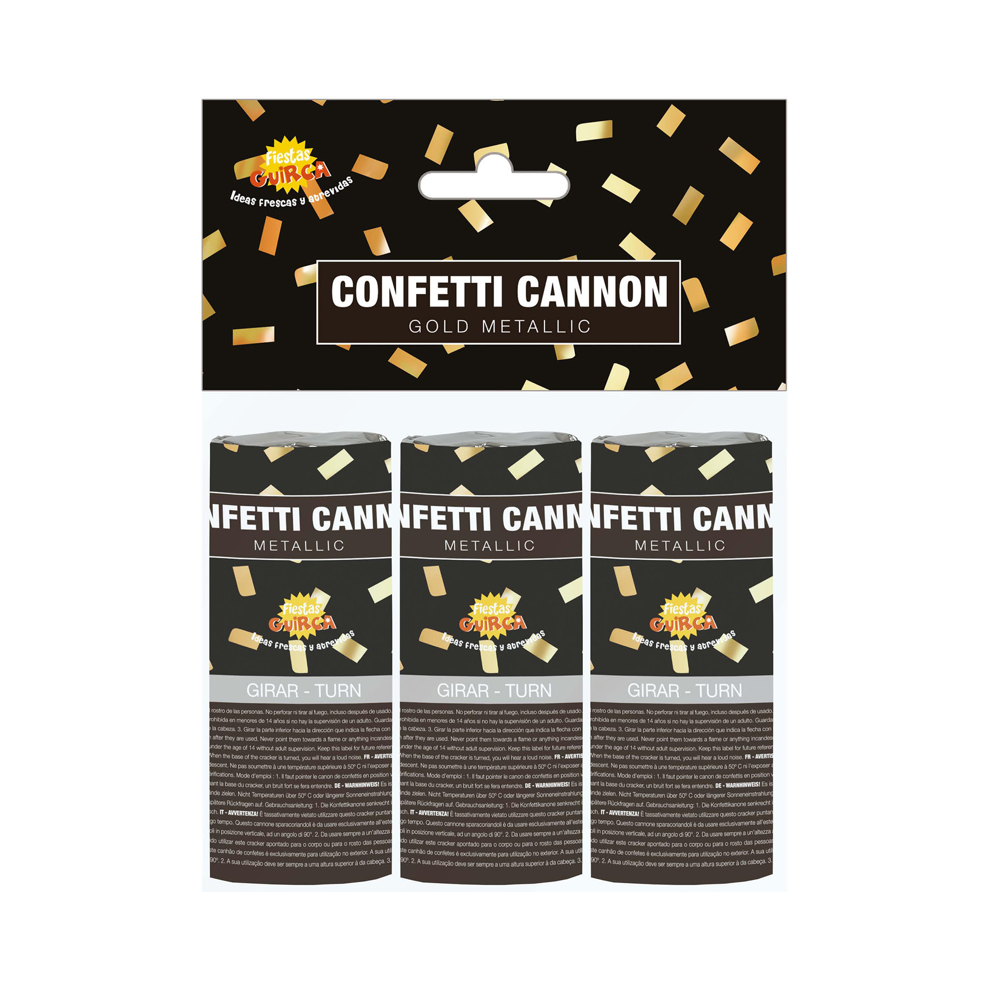 Sada tří tubiček vystřelovacích konfet ve zlaté barvě je ideální jako efektní překvapení na oslavy, párty nebo Silvestra. Každá tuba má výšku 10,5 cm a skrývá proužky fóliových konfet. Postup: Tubu uchopte v dolní části oběma rukama a namiřte šikmo do výšky. Oběma rukama najednou pootočíte tubu ve směru znázorněných šipek (levá ruka směřuje doprava, pravá doleva). Dojde k protržení vrchního obalu, konfety vystřelí a budou se pozvolna snášet k zemi. Upozornění: Nesměřujte na obličeje ani na osoby z bezprostřední blízkosti. Výrobek je určen pouze pro dospělé! Materiál: zlatá fólie Balení obsahuje: 3 ks vystřelovacích konfet v tubě o velikosti 10,5 cm