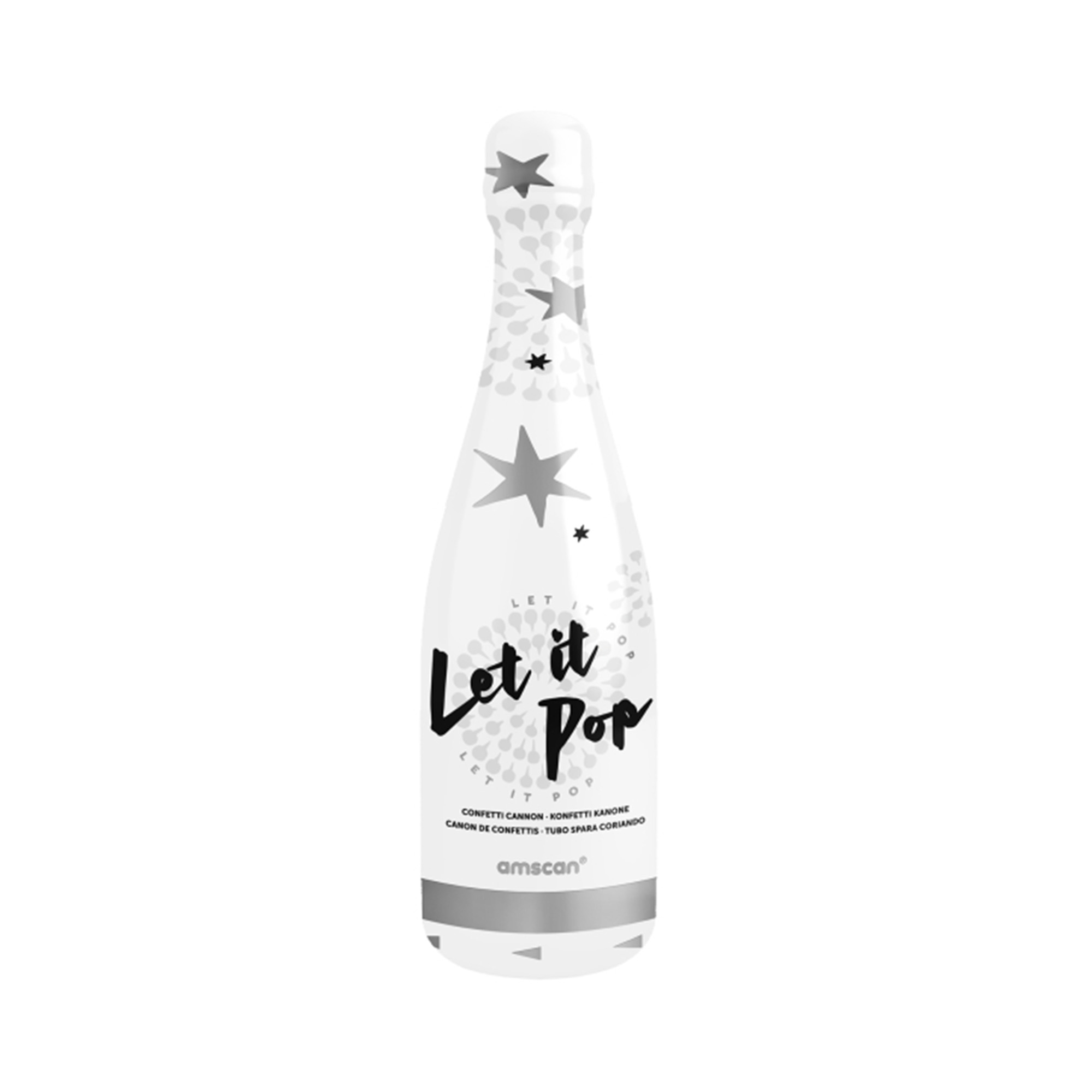 Vystřelovací konfety v originálním designu – ve tvaru láhve šampaňského. Balení konfet je laděno do bílé a stříbrné barvy. láhev je naplněna stříbrnými konfetami ve tvaru hvězdiček. Vystřelení konfet jednoduše aktivujete otočením dna láhve podle šipek na obalu. Vytvořte na oslavě nezapomenutelnou atmosféru a nechte všechny účastníky zasypat hvězdným konfetovým deštěm! Materiál: fólie Balení obsahuje: 1 ks vystřelovacích konfet v láhvi o výšce 32 cm, obsahuje stlačený plyn