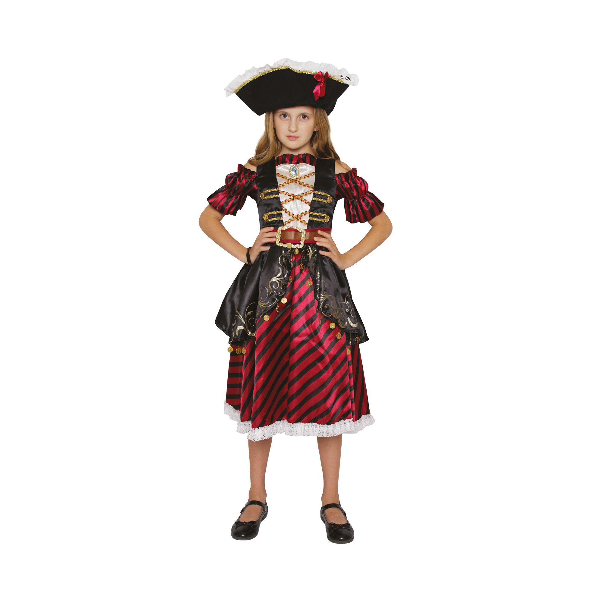 Dětský kostým Pirátka s kloboukem je dostupný ve velikostech 3-4 roky, 4-6 let a 7-9 let. Perfektní volba na tematickou pirátskou párty, karneval nebo jen tak na hraní! Kostým je laděný do červené, černé, bílé a zlaté barvy. Na šatech dominuje pruhovaný červeno-černý vzor. Šaty jsou doplněny páskem se sponou a ozdobeny zlatými detaily v podobě ornamentů a mincí našitých na sukni. Kostým se zapíná na suchý zip v zadní části šatů. Pirátský kostým doplňuje černý klobouk s potiskem lebky, ozdobený červenou mašličkou. Tento kostým potěší všechny holčičky, které sní o dobrodružstvích na širém moři a chtějí se stát odvážnými pirátkami. Pro další dekorace a kostýmové doplňky v pirátském motivu můžete prozkoumat naši kategorii Piráti. Velikosti: 3-4 roky, 4-6 let a 7-9 let Materiál: 100% polyester Balení obsahuje: klobouk a šaty Nevhodné pro děti do 3 let.