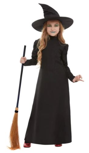 Materiál: 100% Polyester Balení obsahuje černý kostým čarodějnice se šaty a klobouk. Velikost: M (7-9let)
