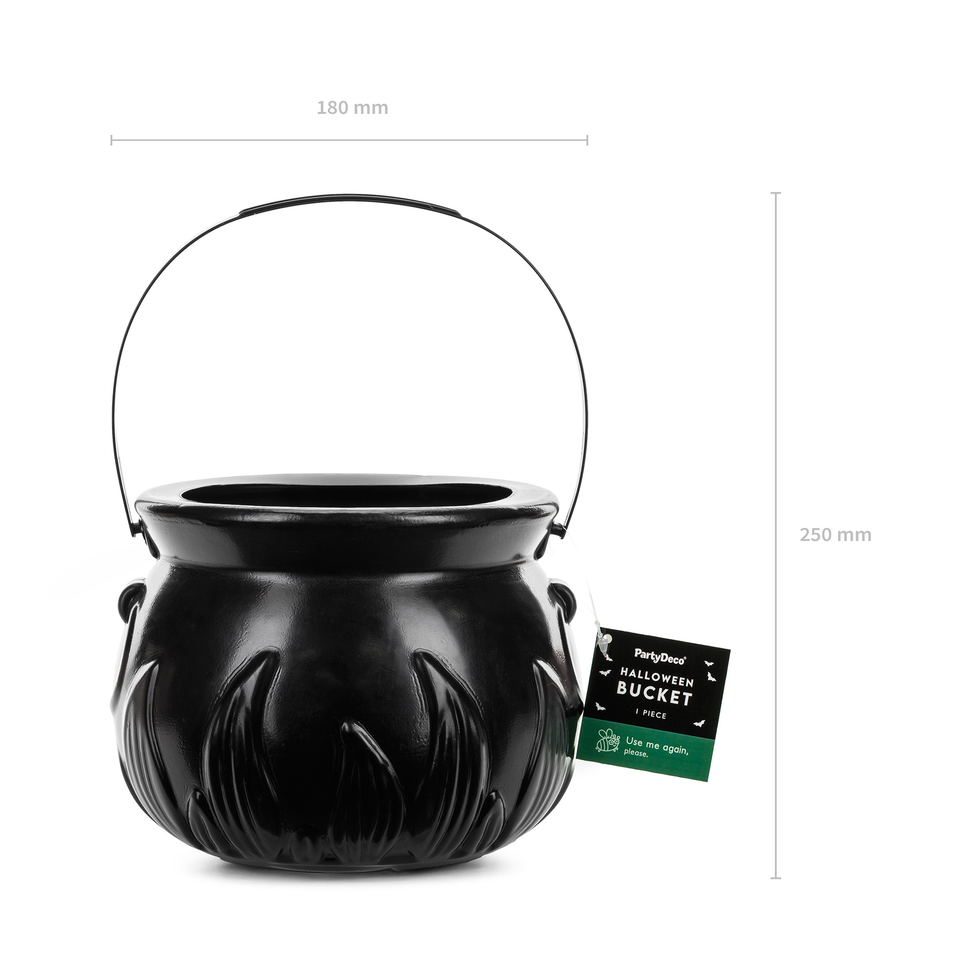Kotlíkový kyblík je naprostý základ kostýmu pro každou správnou čarodějnici! Ideální jako praktický košík na halloweenské sladkosti nebo originální dekorace na oslavu pálení čarodějnic. Kotlík je v černé barvě, má praktické ucho a zdobí ho reliéf plamenů. Tento plastový kyblík ve tvaru klasického čarodějnického kotlíku nesmí chybět na žádném strašidelném večírku! Další párty doplňky a dekorace se strašidelným motivem naleznete v naší tematické kategorii Halloween nebo Pálení čarodějnic. Rozměry: 18 × 13,5 cm (bez ucha) Materiál: plast Balení obsahuje: 1 ks kotlíku s uchem