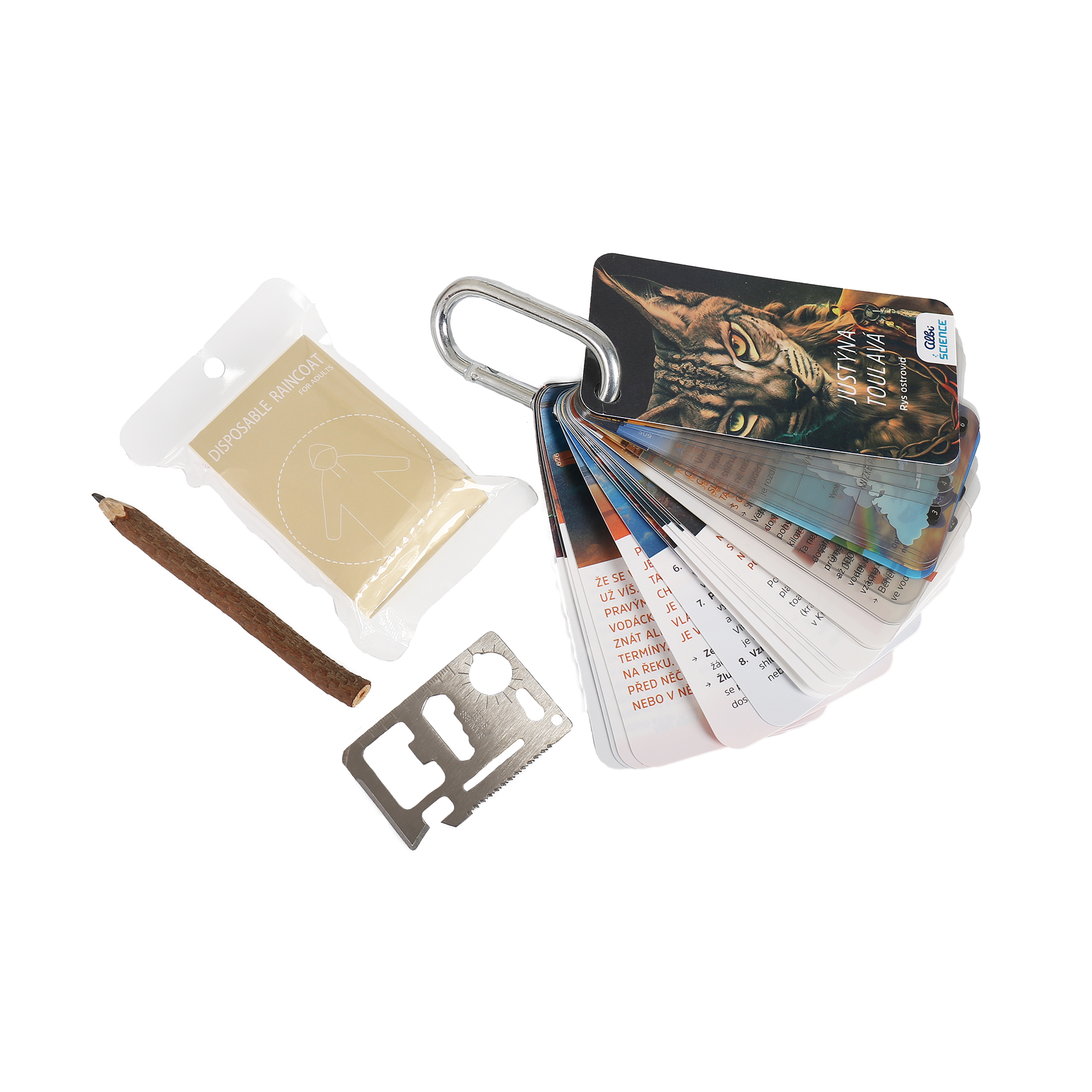 Co když se ztratíte? Budete muset poskytnout první pomoc? Jak předpovídat počasí a jak se chovat, když Vás zastihne bouřka? Všechny odpovědi naleznete v našich sadách Krabička pravého dobrodruha. Buďte připraveni, nikoliv zaskočeni! Krabičky pravého dobrodruha vás hravou formou připraví na nejsvízelnější situace, které by mohly v přírodě nastat. Naučí vás základní vědomosti o české přírodě a ukáže šikovné dovednosti pravého dobrodruha. S Krabičkou pravého dobrodruha – Na dovolenou se poučíte o poznávání dešťových mraků, proudění vzduchu a koloběhu vody, o ničivých tornádech, výrobě zápisníku, vodáctví, naučíte se Morseovu abecedu, signalizační vlajky na pláži, základy první pomoci a vázání uzle. Odolné karty, sloužící jako průvodce světem, můžete mít stále při sobě. Stačí je navléct na karabinu a tu kamkoliv připnout – Na pásek, batoh či bundu. Dále v sadě najdete třeba multifunkční set jako pomocníka do každé situace a mnoho her, úkolů a aktivit u vody. Sestava všech 6 sad Krabička pravého dobrodruha s komponenty vytvoří kompletní nouzovou sadu pro přežití. Krabička pravého dobrodruha – Na dovolenou obsahuje: multifunkční set, pláštěnku, tužku, 30 plastových karet se zajímavostmi, karabinu na uchycení karet, návody, pravidla a tipy.
