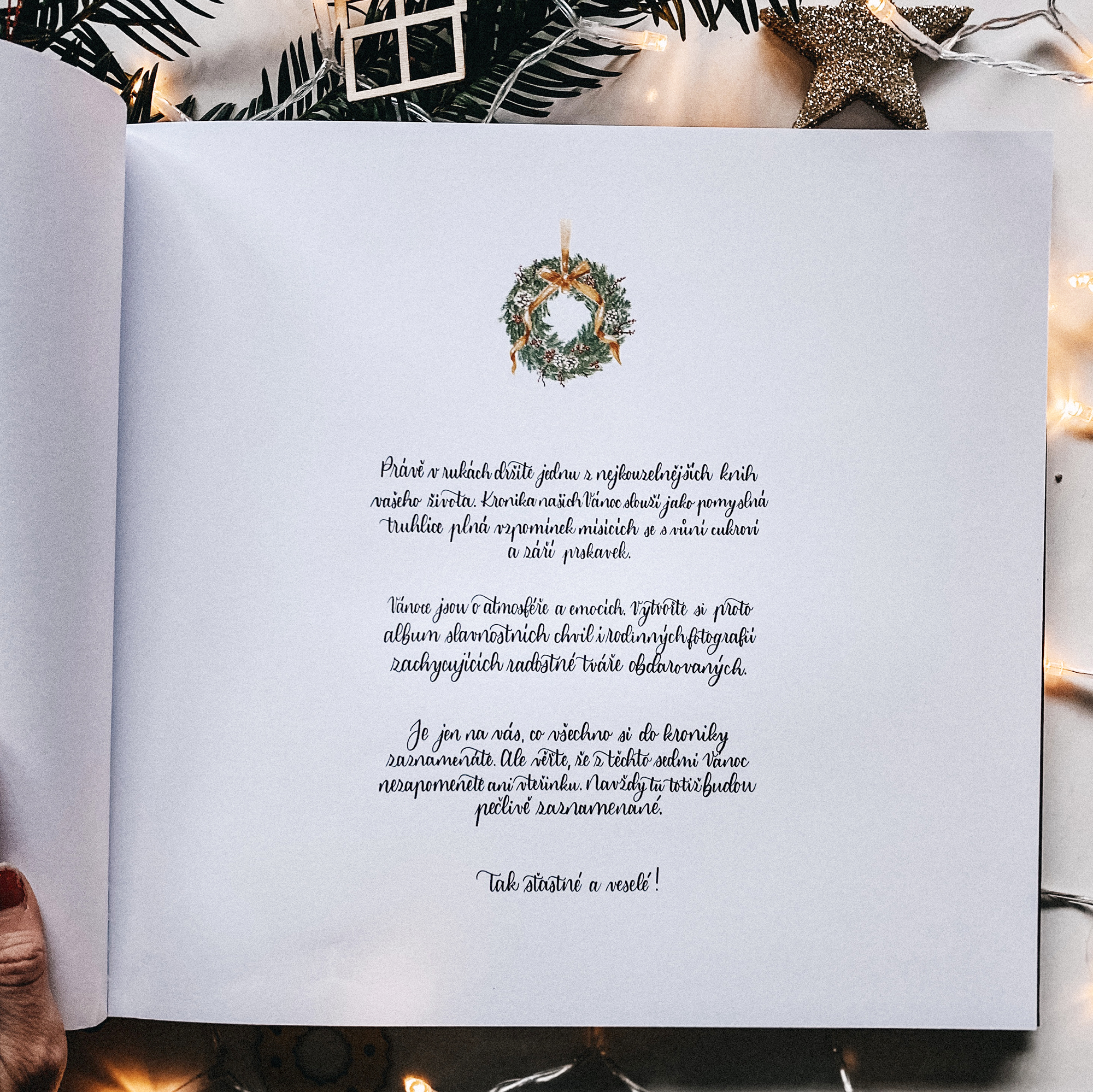 Mějte pohromadě své nejkouzelnější vánoční zážitky. Sedmiletá Kronika našich Vánoc je ideálním místem pro uložení těchto momentů, za kterými se můžete kdykoliv vracet a připomenout si i sebemenší detail. luxusní provedení kroniky dodává vzpomínkám punc vzácnosti a podtrhuje slavnostní atmosféru. Jako pomyslnou schránku pro vaše poklady jsme zvolili knižní šitou vazbu se sametovým povrchem a zlatou ražbou. Krásný obal? Ale co teprve vnitřek, na kterém jsme si dali extra záležet. Celkem sedmi Vánoci vás provedou krasopisem ručně psané texty. O pomyslný návrat do dětství se zase postarají nádherné akvarelové ilustrace. Otázky jsou navíc laděny tak, aby vás nenápadně vedly, ale nebránily zaznamenat cokoliv, co je pro vás důležité. Kromě psaných záznamů si do Kroniky můžete kreslit, lepit fotografie a jakkoliv v ní kreativně tvořit. 92 stran toho nejkvalitnějšího papíru je ideálním podkladem pro všechny zápisky i obrazové přílohy. Jsou-li pro vás vánoční svátky srdcovou záležitostí, pak si vánoční kroniku zamilujete. Vložili jsme do ní totiž maximum nadšení. Věříme, že ho z knihy ucítíte, až na vás dýchne tou nefalšovanou nostalgickou náladou. Vyrobeno v České republice.