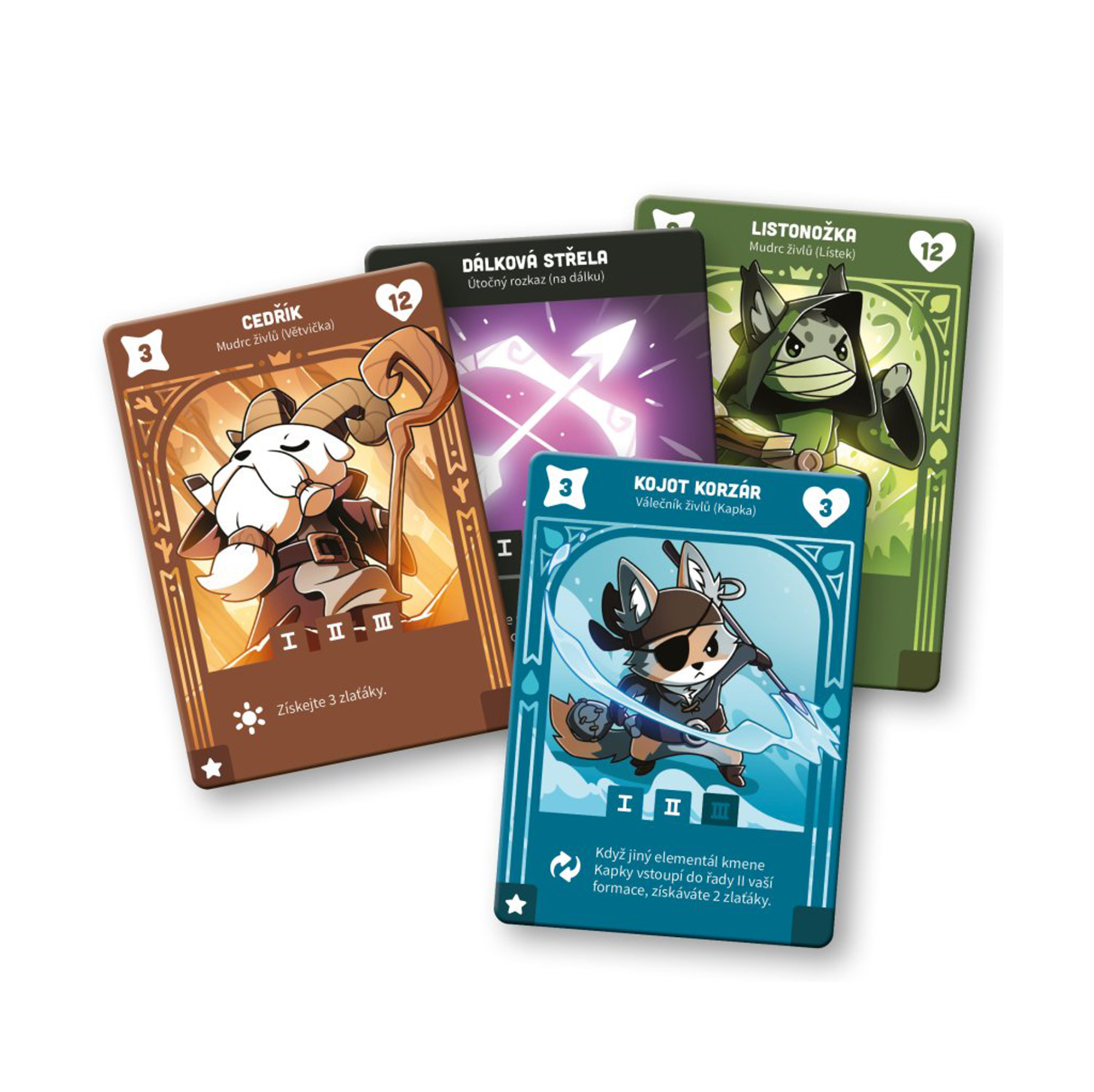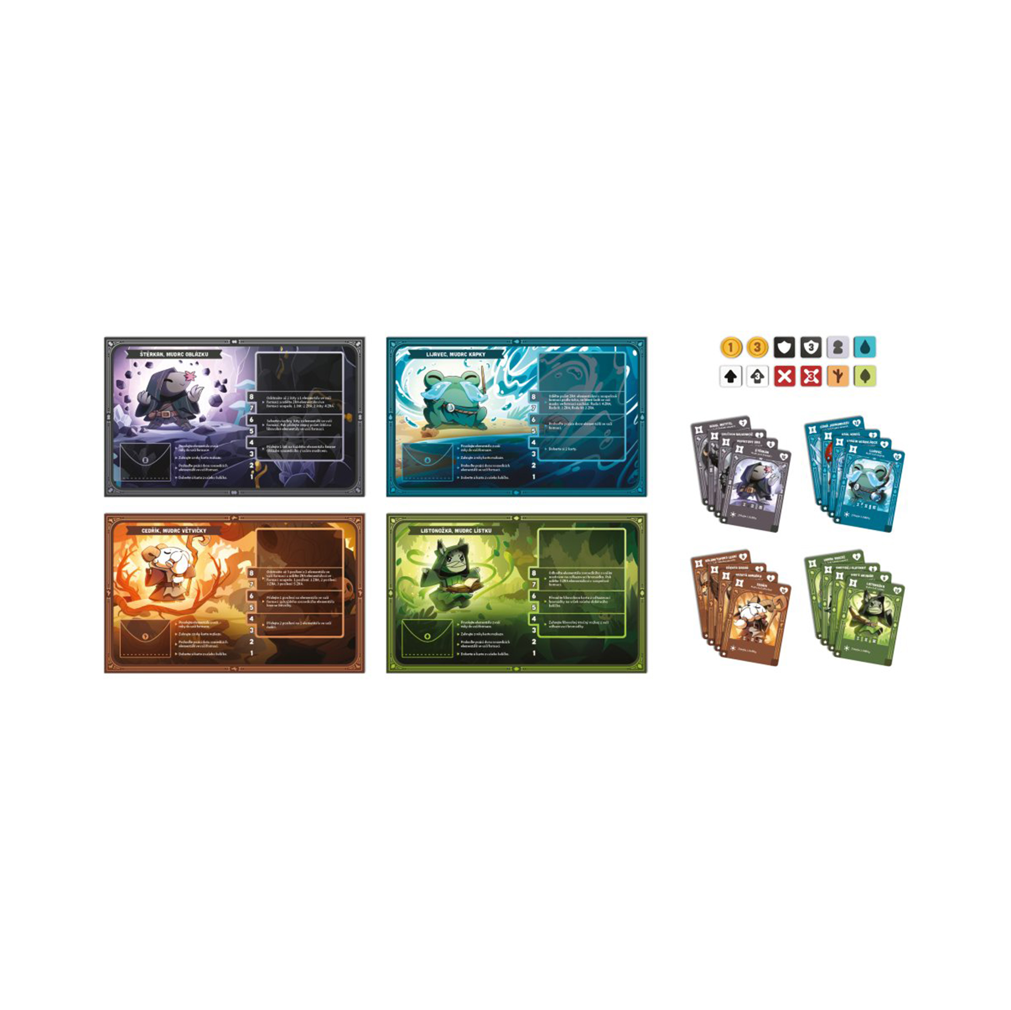Podmaňte si magii pralesa a utkejte se se soupeřícími mudrci ve hře zaměřené na budovaní balíčků karet. Povolávejte válečníky živlů z kmenů Větvičky, Lístku, Kapky a Oblázku a prokažte svou zručnost v boji. Během bitvy budete postupovat na vyšší úrovně a získávat přistup k výjimečným schopnostem a mocným šampionům živlů. Jakmile porazíte soupeřova mudrce (nebo oba mudrce vašich soupeřů), vyhráváte hru. Budete to vy, kdo zůstane poslední stát pevně na nohou coby vítěz, až se usadí prach z bitvy? Hra Krotitelé živlů obsahuje: 4 desky mudrců, 4 balíčky mudrců, 1 balíček tržiště živlů, 1 balíček tržiště rozkazů, 20 oboustranných žetonů zlaťáků, 20 oboustranných žetonů zraněni, 20 oboustranných žetonů posílení, 20 oboustranných žetonů štítů, 4 žetony ukazatele úrovně, česká pravidla.
